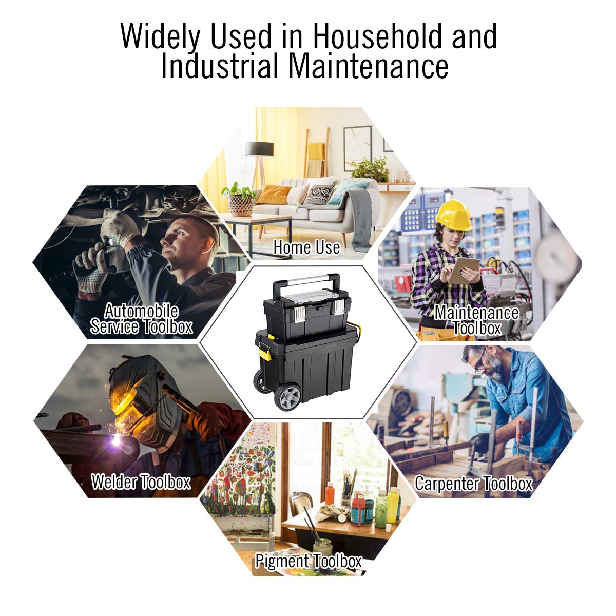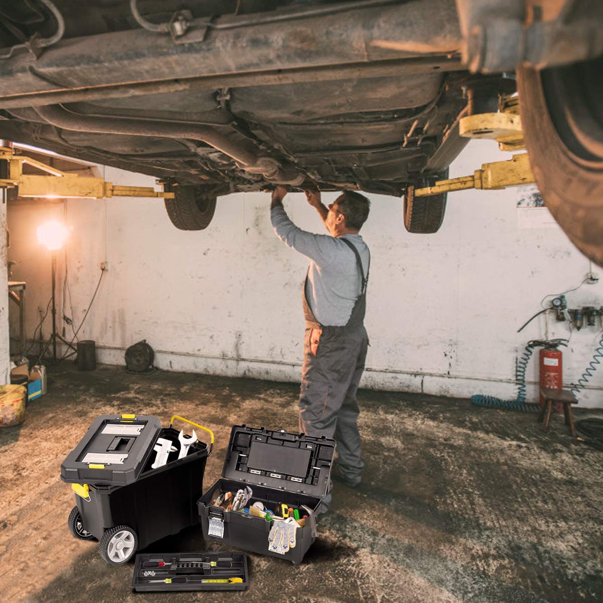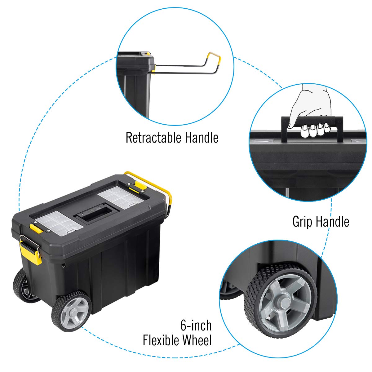 DescriptionThis tool box is like a portable shop. It has a retaining buckle for maintaining security as well as stability during travel. The interior is organized to maximize the amount of available space, and there is even a tool divider in the top tool box for the easy compartmentalization of your tools. The topmost storage box allows users to store their most useful tools on the top portion of the tool box. Heavy tools and rarely used items can easily be stored below. 6" oversize wheels for easy rolling over any surface. The durability of a tool chest is incredibly important, so users will appreciate the polypropylene resin construction. There is no need to worry about the effects of chemical spills because this material is resistant to many chemical agents, and it also resists the corrosive effects of bases and acids. It is easy to clean, and you only need a damp cloth to give it a quick wipe.