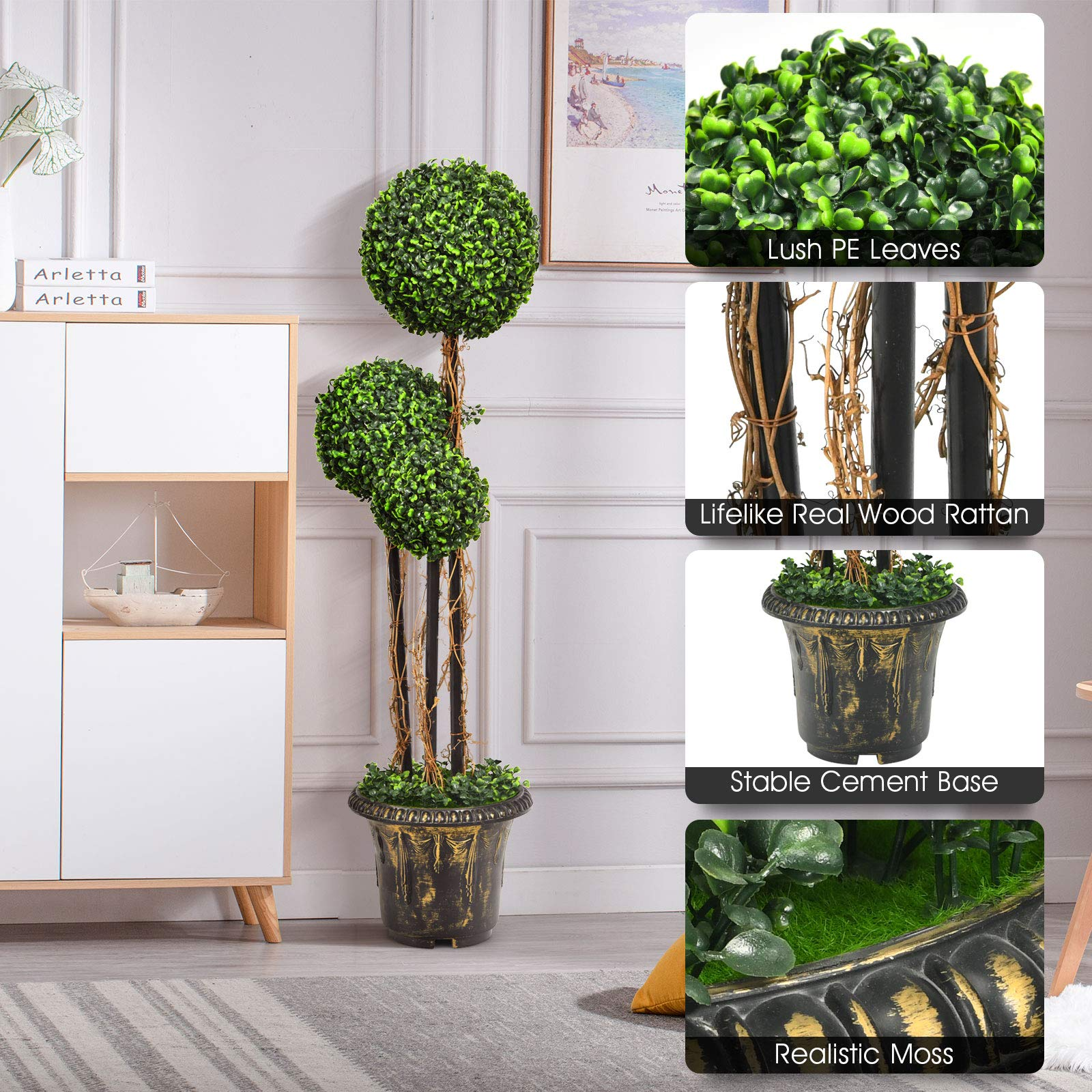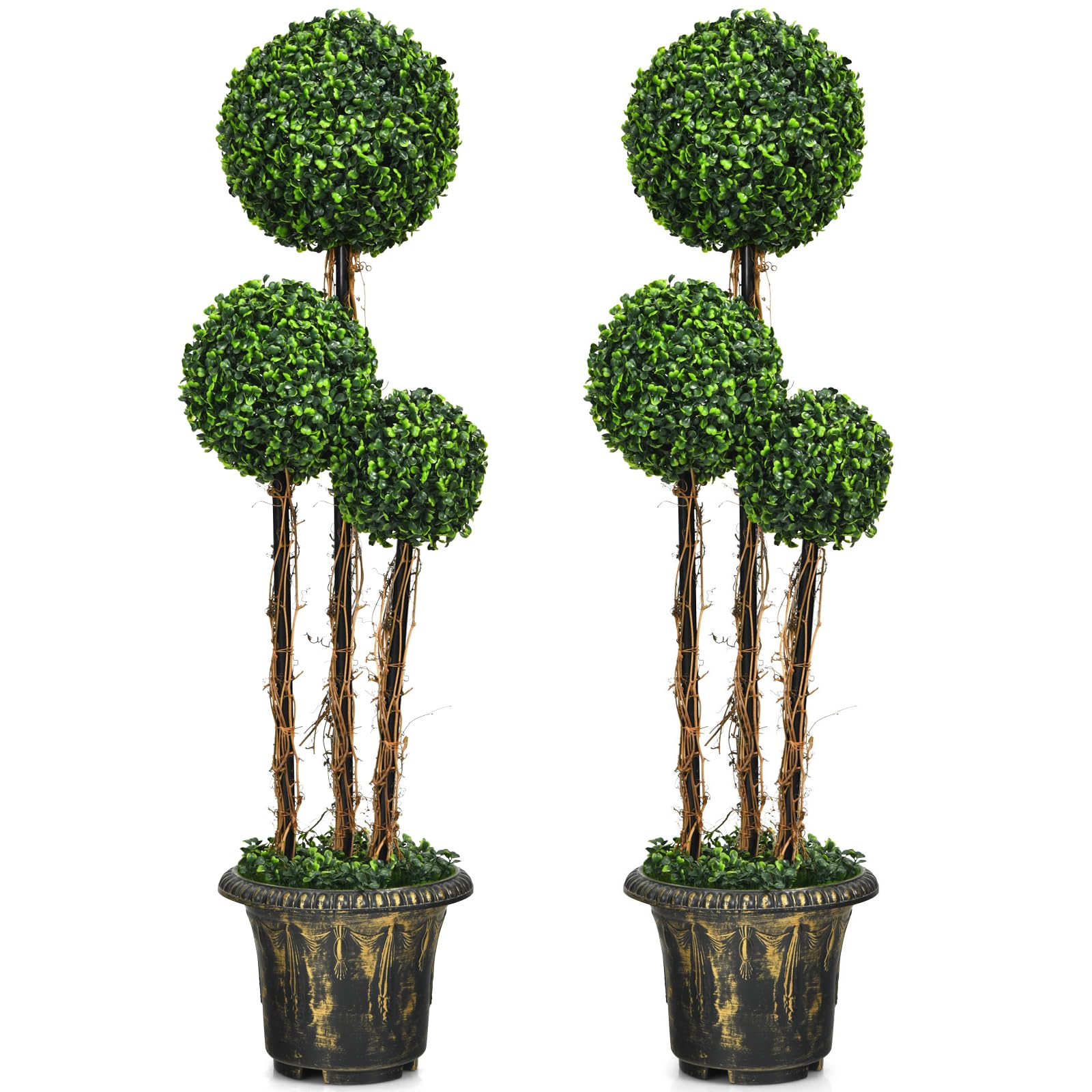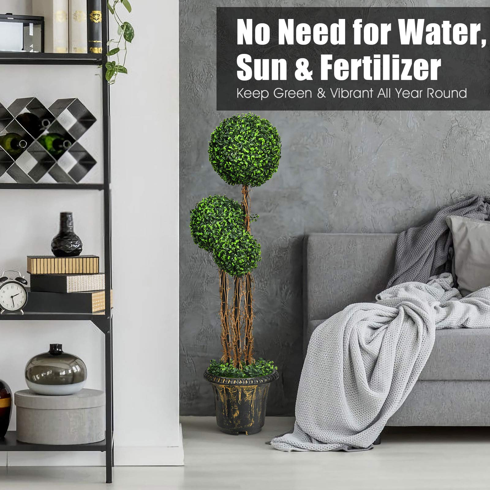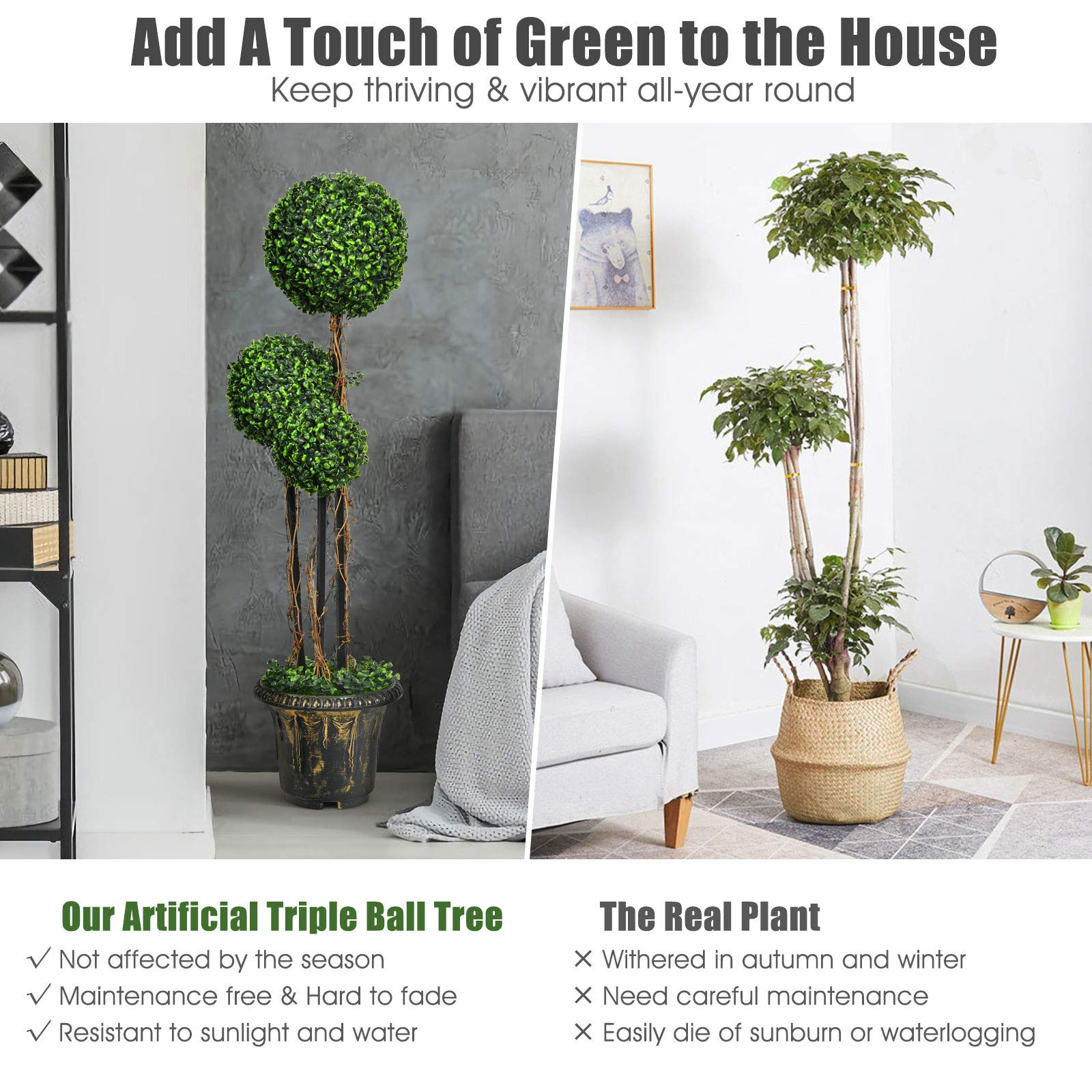With the vibrant green leaves and real wood rattan, the 4ft triple ball artificial tree appears so realistic. You even can't distinguish it from a real one. To offer a fresh and green view all year round, the artificial tree features premium PE leaves. Dense leaves and vivid color deliver a hint of green, as well as the breath of nature while the real wood rattan adds a touch of nature. There's no need to worry about its quality issue. PE leaves are odorless and non-toxic to use. To make it more durable, the decorative pot is filled with cement to ensure overall stability and avoid slipping. Besides, it's a perfect indoor and outdoor decoration for a home, office, balcony, garden, and more.