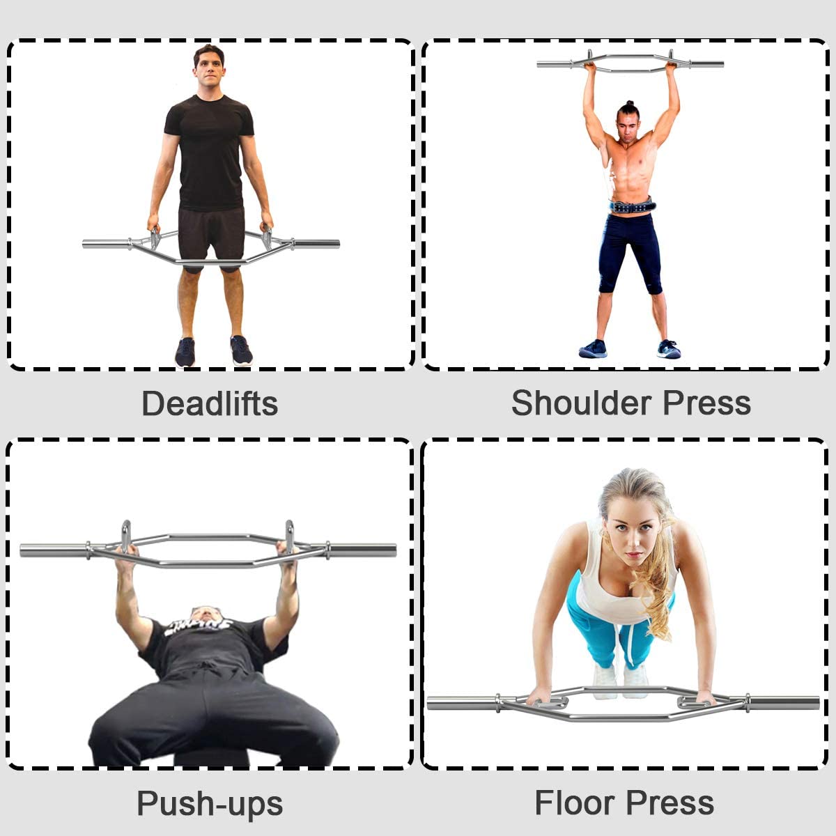 - Different Grip Positions w/ Knurled Handles Made of a tough and coarse texture that is cut in a diamond pattern on stainless steel grab bar. This hex bar features dual knurled handles that are designed to increase the friction and provide you a sturdy and comfortable grip when lifting heaving equipment.