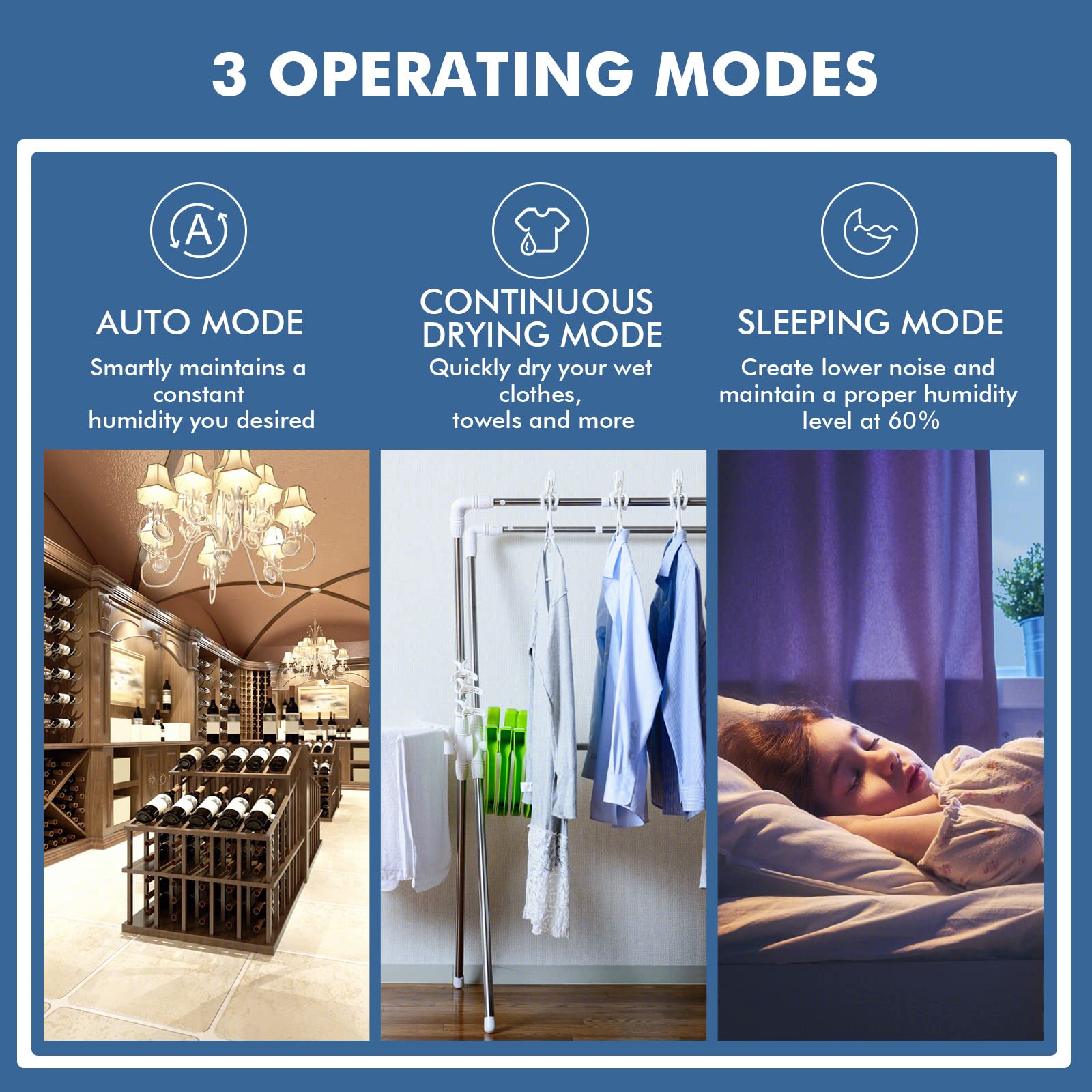 - 【3 Operating Modes & 2 Fan Speeds:】1. Auto mode: smartly maintains a constant humidity you desired; 2. Continuous drying mode: quickly dries your wet clothes, towels and more; 3. Sleeping mode: creates lower noise and maintains a proper humidity level at 60%. In addition, the fan speed has 2 adjustable levels (high/low).