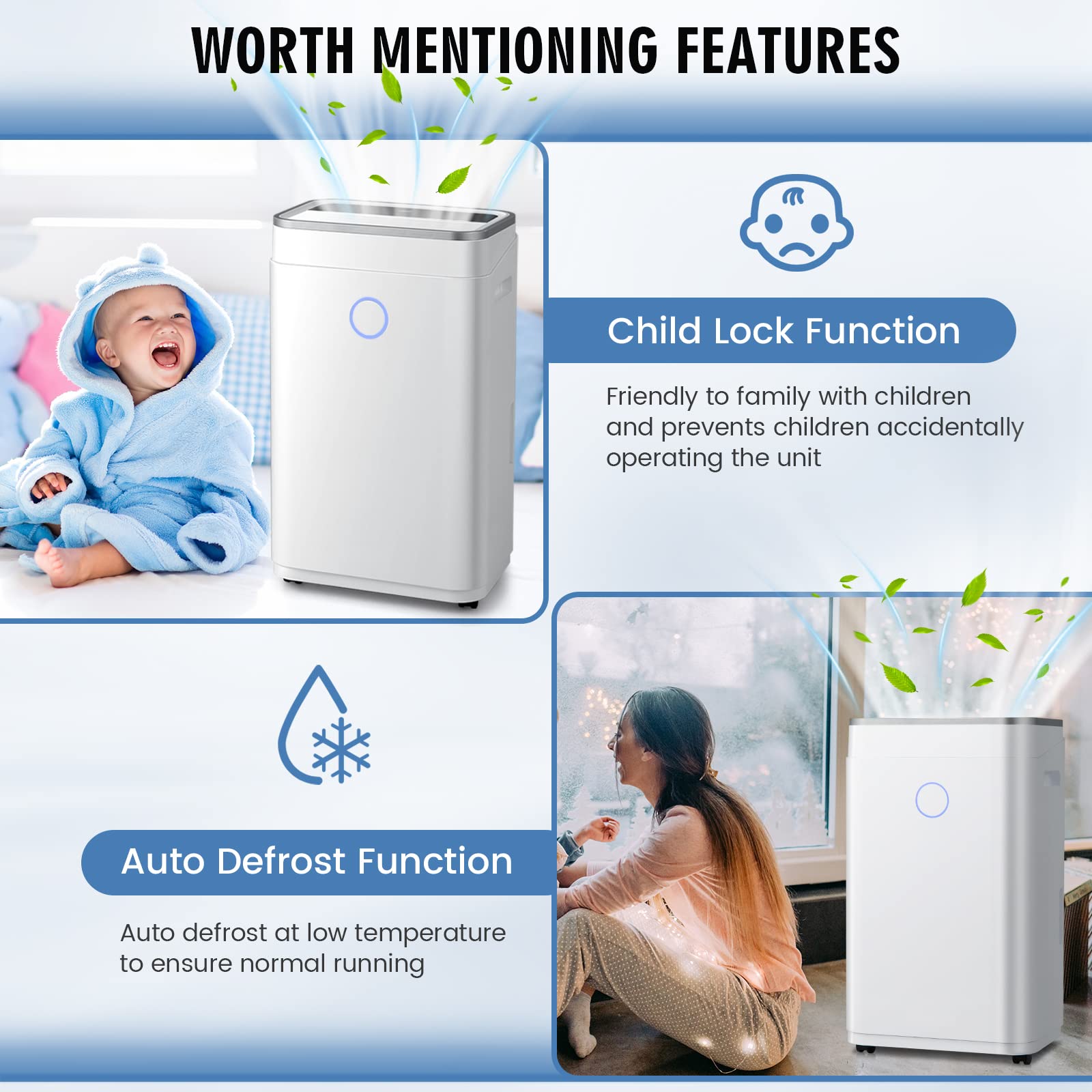 - 【Humanized Features& Easy Movement:】The filter screen can be removed with ease, making it easy to clean and maintain. The 0-24H timer allows you to set the auto-off time freely and reduces energy consumption. Equipped with 4 universal casters and built-in portable handles, this dehumidifier can be moved anywhere you want, like the bathroom, bedroom, basement, garage, etc.