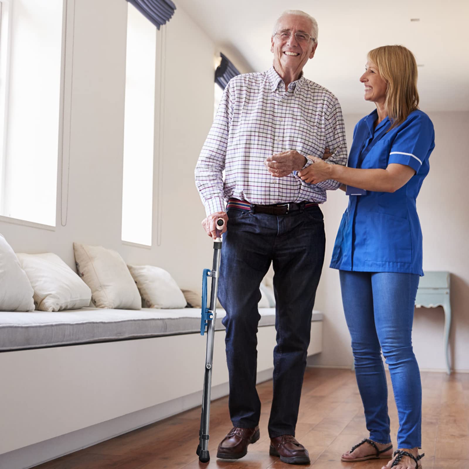 This is our lightweight but heavy-duty cane seat which is the best gift for the elderly or yourself! Made of high-quality aluminum alloy with a stable triangular structure, our crutch stool is durable, and not easy to crack or collapse. ABS ergonomic handle and seat board can provide a comfortable grip and sitting experience, which is great for waiting in line, traveling, or resting after going for a walk or shopping. It has 5 adjustable heights to meet the needs of different heights. It is worth mentioning that our crutch stool is also equipped with a built-in LED light, which can ensure the elderly walk safely at night. This folding cane seat will be your best choice!