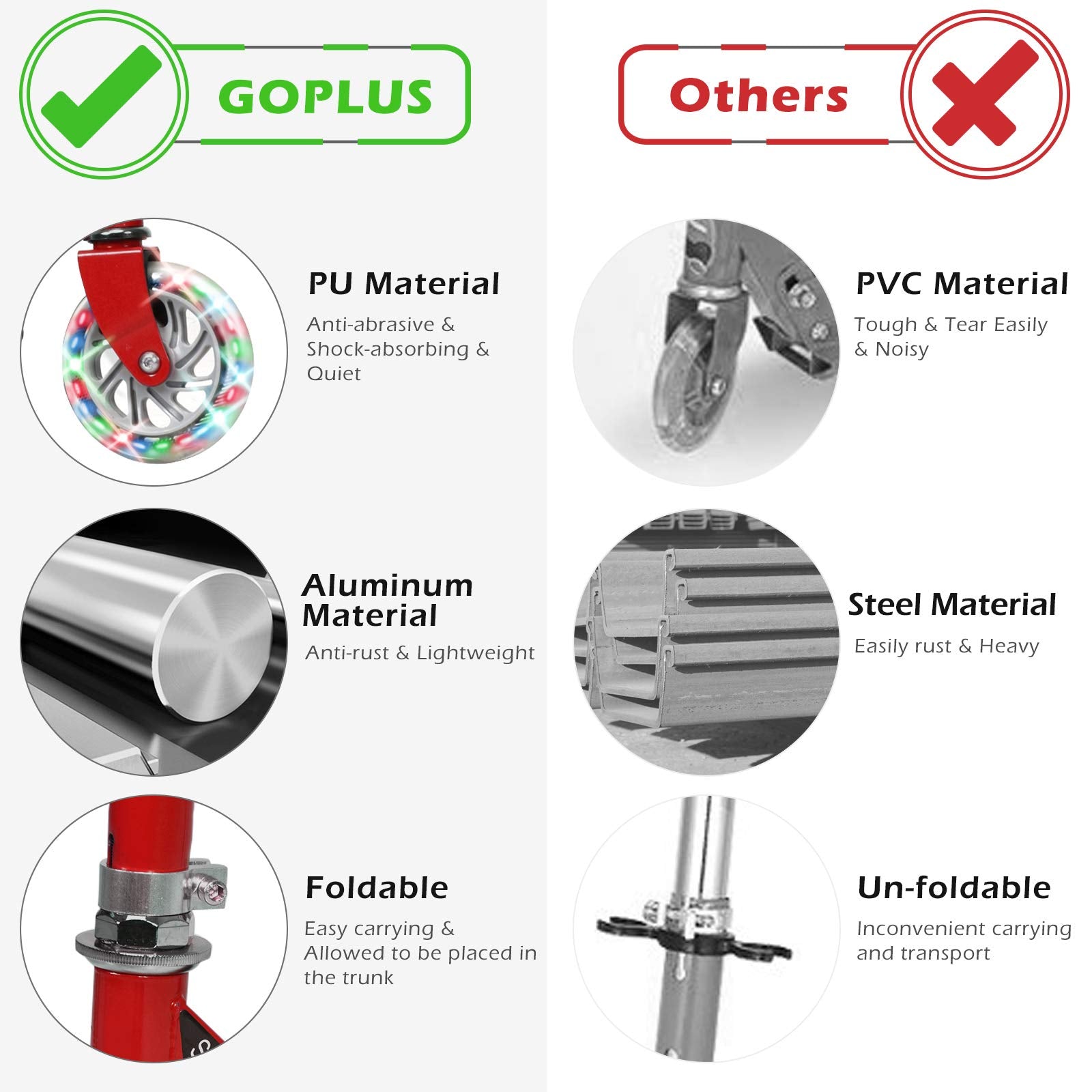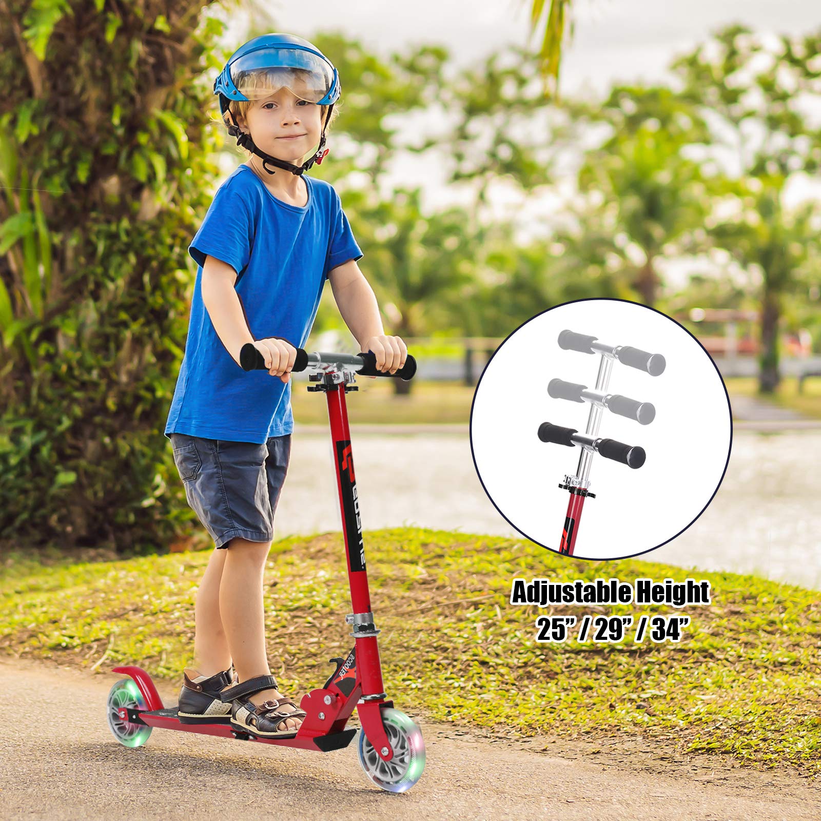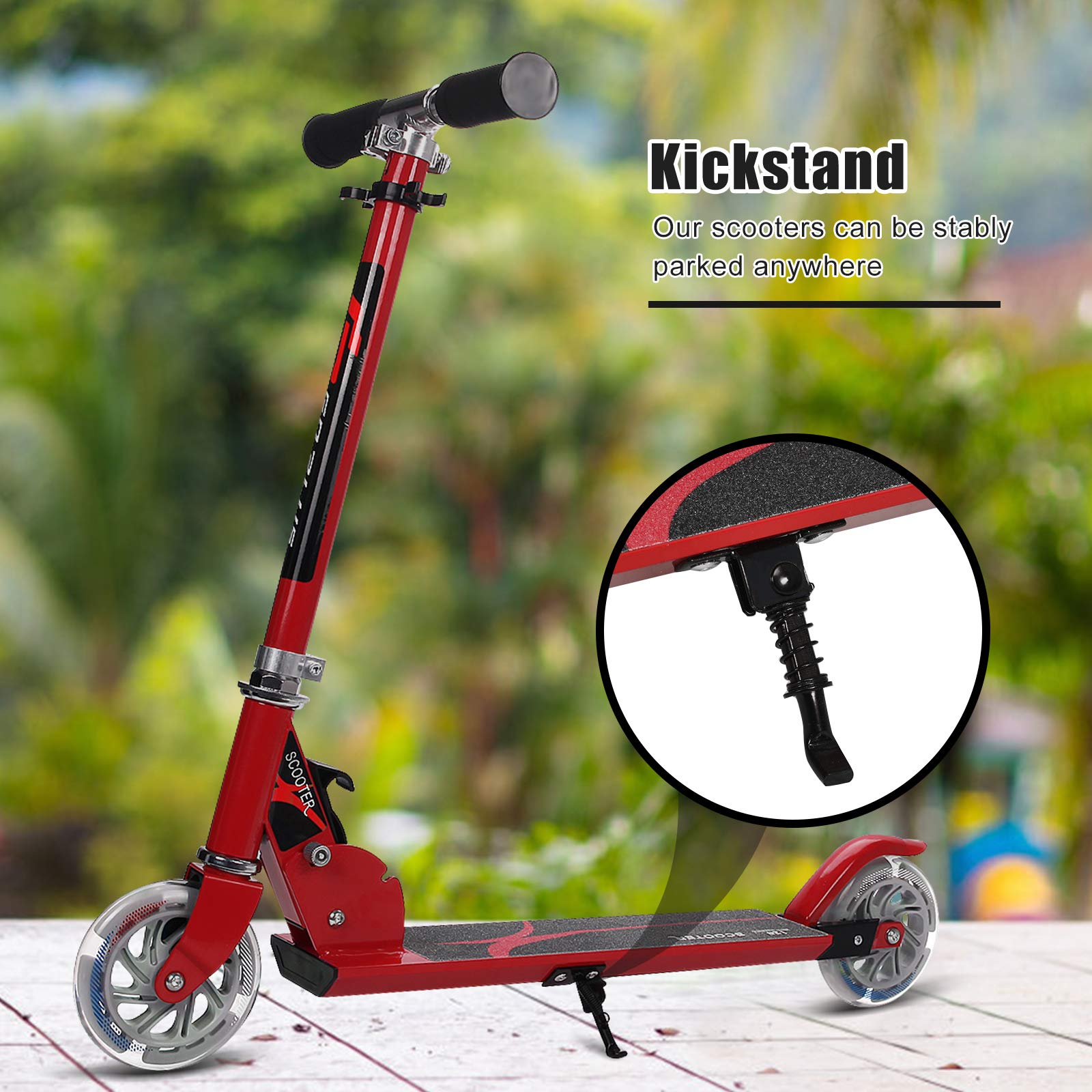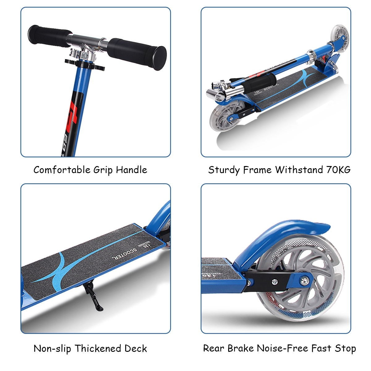 This kick scooter is built of aircraft-grade aluminum, a sturdy material that holds up to use and abuse through the years. Scooter with PU Wheels are both smooth and quiet and high quality bearings reduce vibration and make a smoother ride. Rear wheel with LED Light let the children enjoy playing well. Add in the foldable T-tube and deck, which tuck together to create a compact footprint (ideal for carrying when riding isn't appropriate), and you have a great kick scooter for virtually any situation. Three levels adjustable height to meet children at different ages. Don't hesitate to buy it!