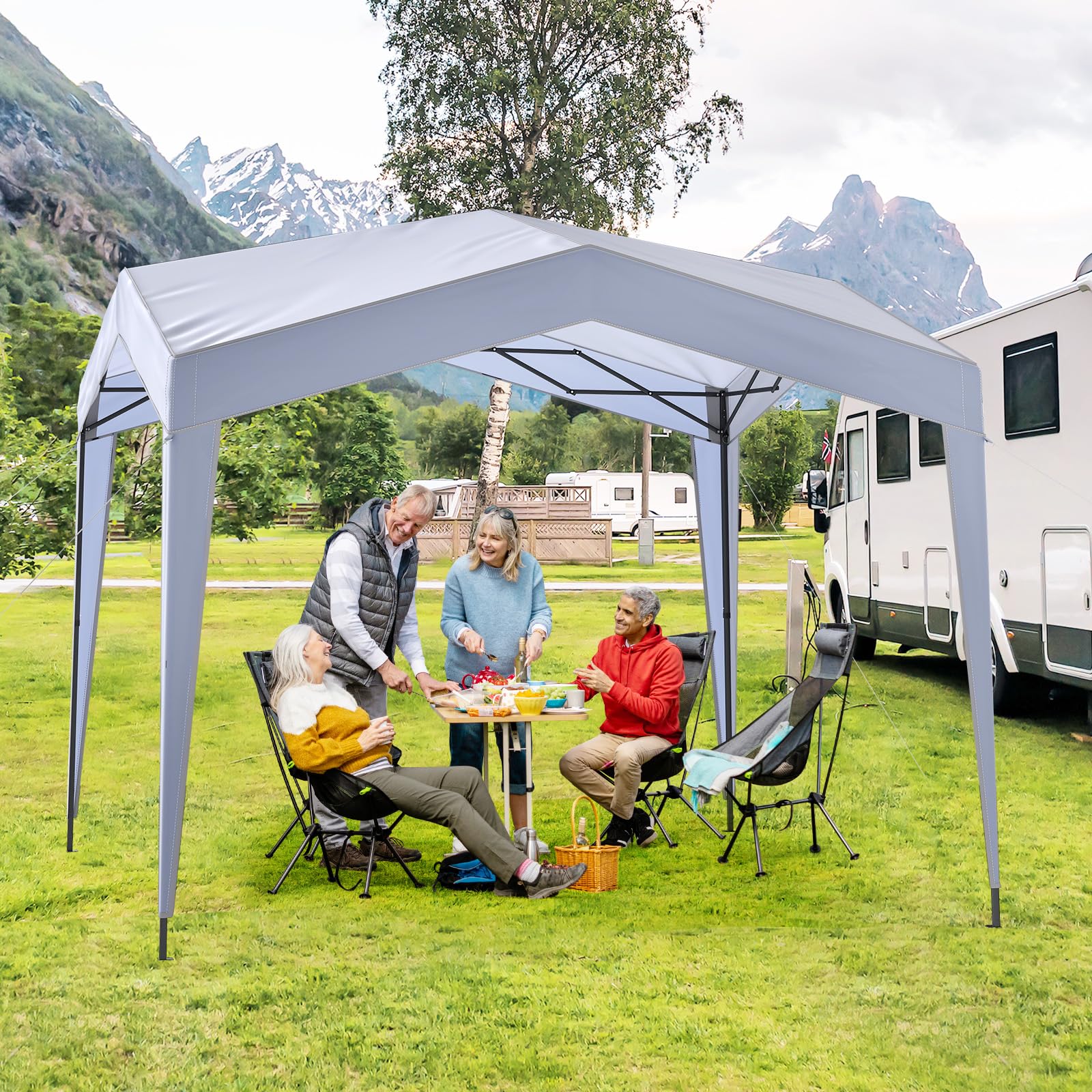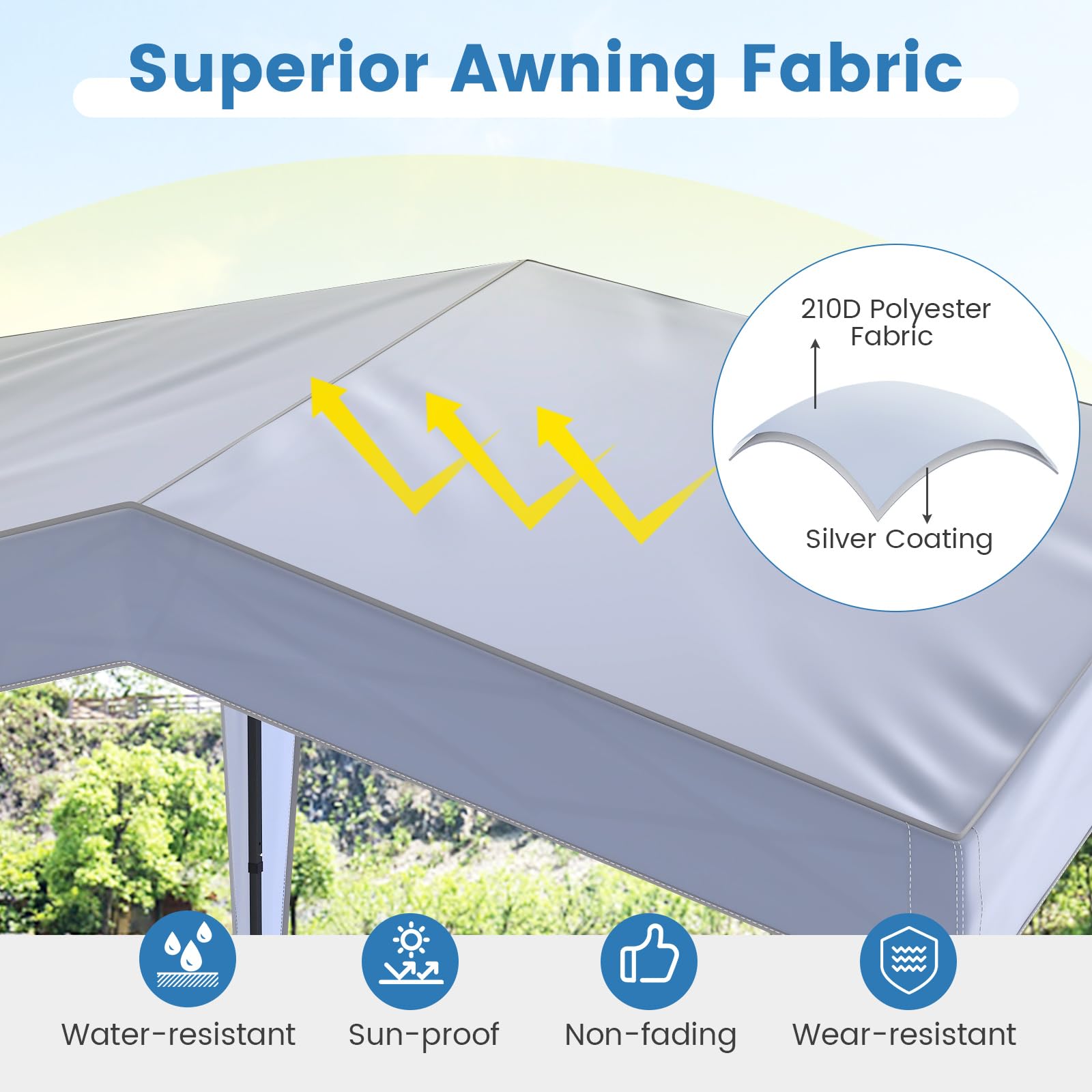The generously sized 10 x 10 x 8.7/9 ft(L x W x H) instant shelter with 2 adjustable height positions offers spacious space for different activities, including picnics, sports events or parties. Crafted from wear-resistant polyester fabric with a protective silver coating, the patio canopy tent provides superior sun protection. Equipped with 8 ground stakes and 4 wind ropes, the large folding shelter can be firmly anchored to the lawn. Additionally, the heavy-duty frame with reinforced truss plates will enhance the stability. Featuring a folding structure, the pop-up canopy tent allows for quick assembly without the need for tools. When not in use, it can be effortlessly packed in the roller carrying bag for traveling.