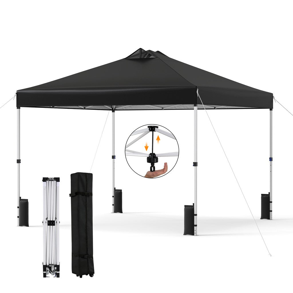 This pop-up canopy tent boasts an innovative one-button center lock system that allows a single user to set it up in seconds without any tools, ideal for spontaneous outdoor occasions. Built with a heavy-duty metal frame reinforced by truss plates, the instant gazebo shelter offers superior stability. Additional security comes from included sandbags, wind ropes, and stakes, ensuring resilience in windy conditions. The silver-coated canopy is crafted from tear-resistant oxford fabric providing UPF 50+ sun protection, with a vented design that promotes airflow for comfort. Equipped with pinch-free thumb buttons, the party tent adjusts to 3 different heights for personalized shade across the generous 10'x10' area. Also, a wheeled carrying bag makes transport effortless while facilitating compact storage, perfect for a variety of outdoor activities.