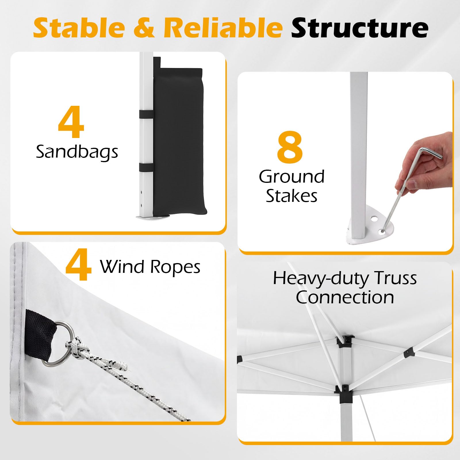 4 wind ropes fixation, 8 stakes anchoring and 4 sandbags enhance overall stability