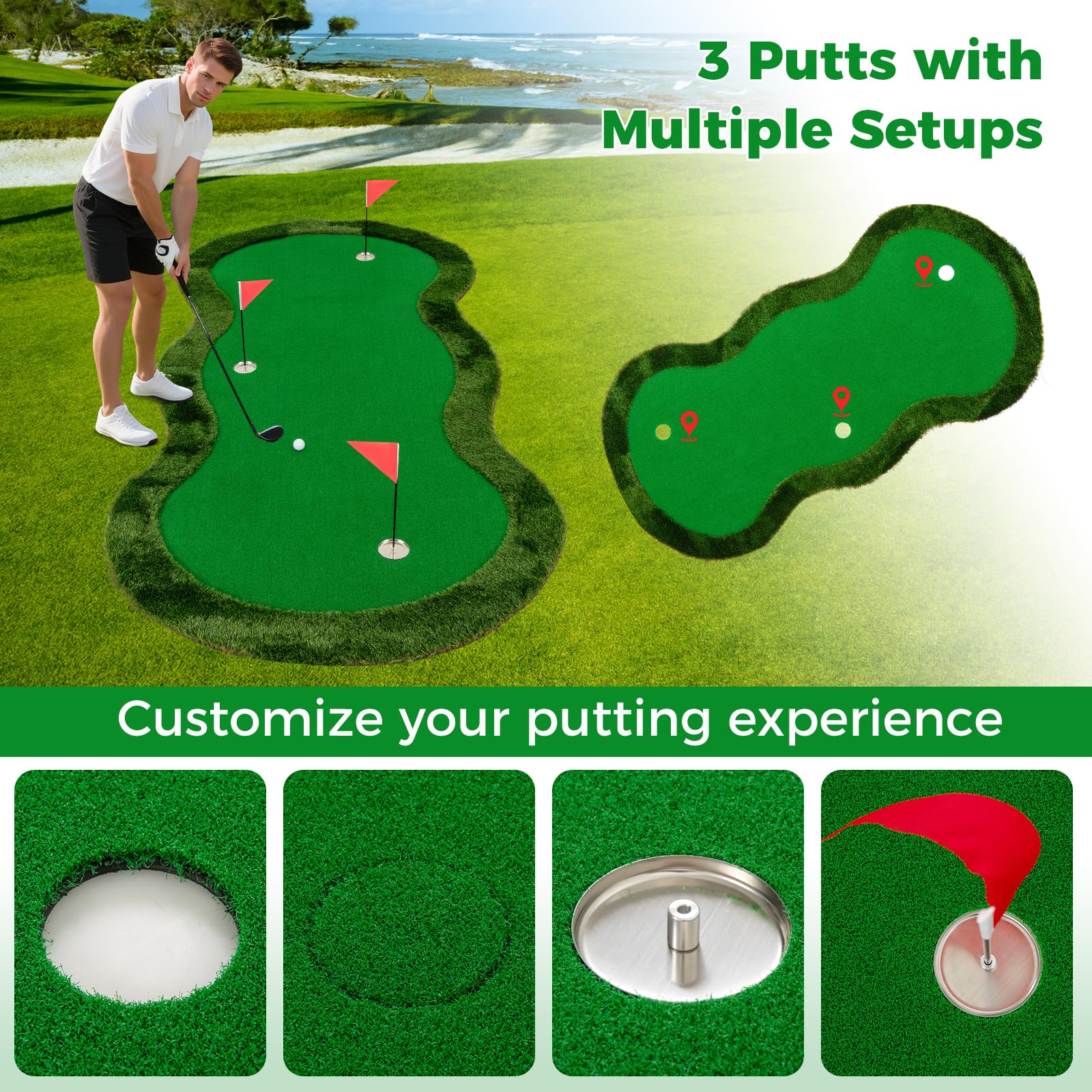 Crafted from high quality artificial grass, the golf putting green will give you a true golfing experience right in the comfort of your own space. Featuring 3 precisely placed holes, movable hole covers, golf cups, and flags, this golf training mat allows you to simulate a variety of putting scenarios and practice different distances and angles. What's more, the golf practice mat is ideal for indoor & outdoor use, whether you prefer to practice in the living room, patio, backyard, or even at the office.