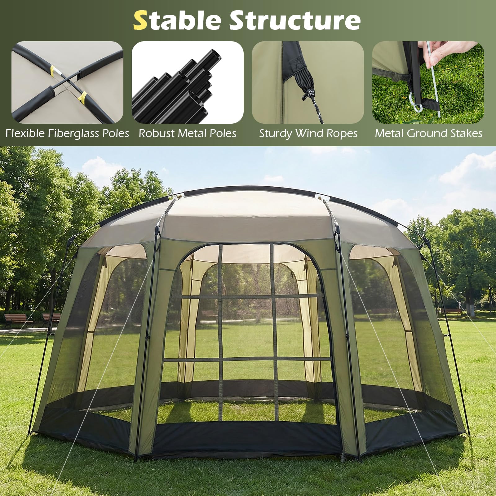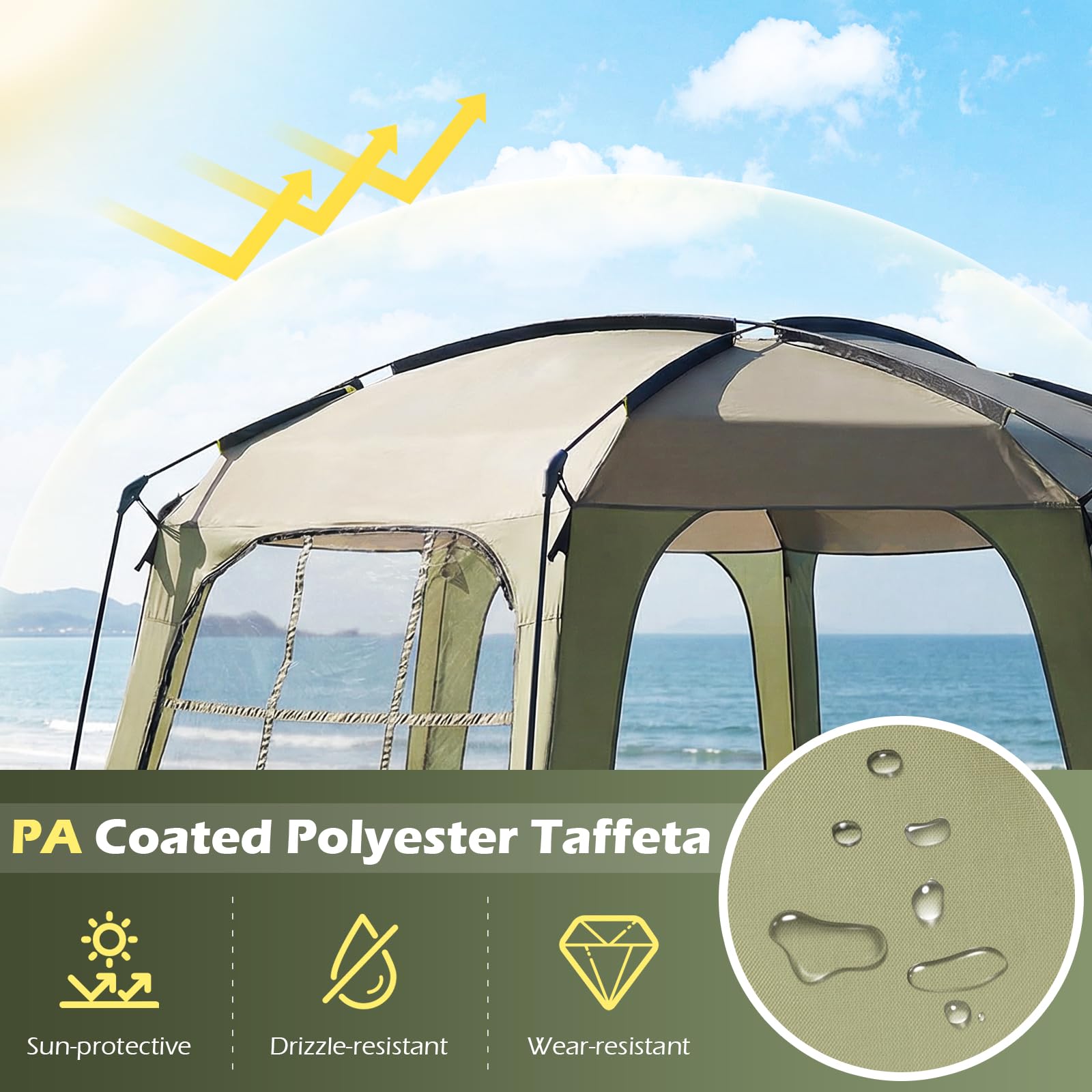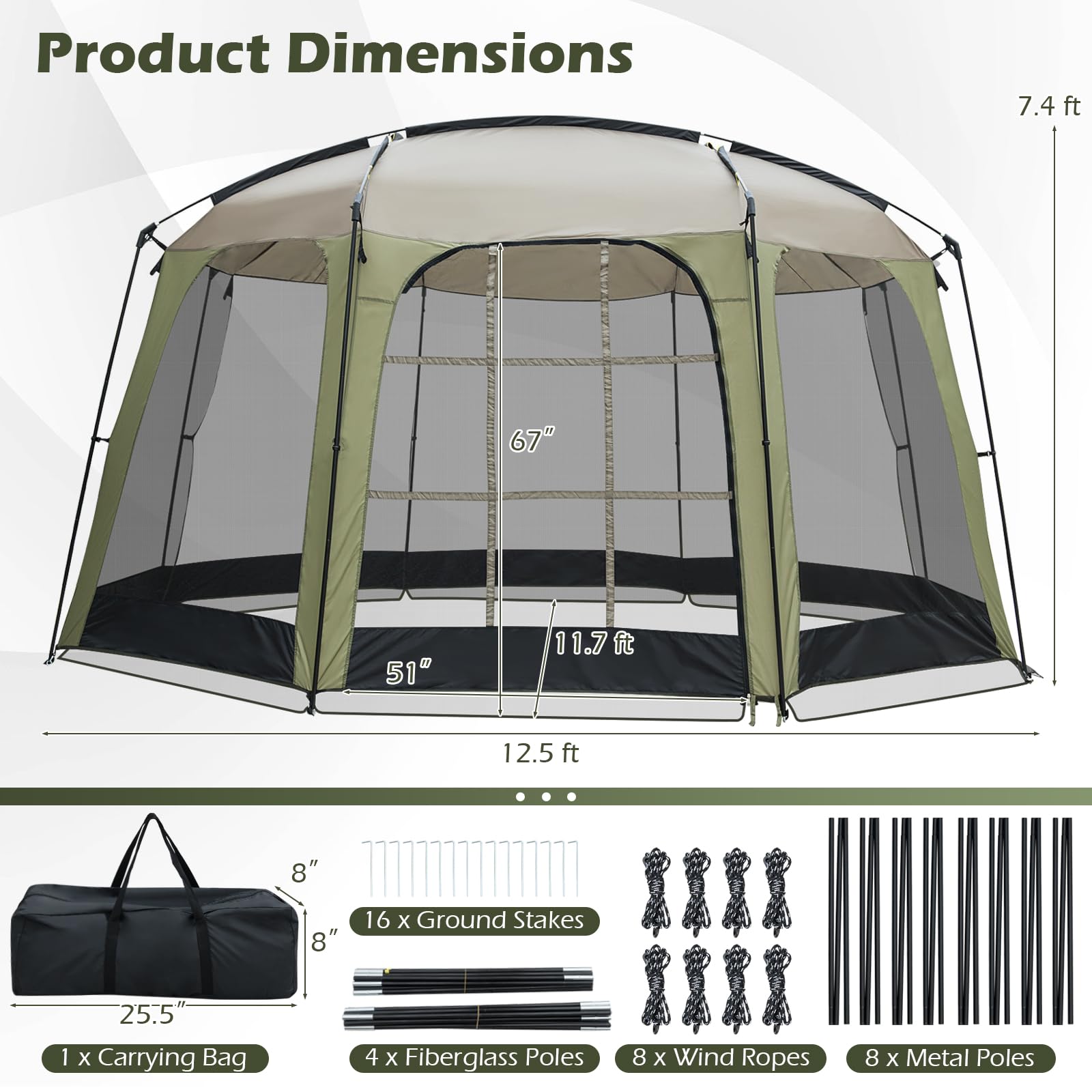 Measuring 12.5 x 11.7 feet with an impressive 88" interior height, the screen house can easily accommodate 6-8 people, making it perfect for family gatherings or group outings. The robust fiberglass and metal pole framework, along with wind ropes, and included stakes, ensures unwavering stability even in changing weather conditions. Plus, a full 360° ventilation system is achieved through high-density mesh walls and expansive zippered entrances, providing optimal airflow and a pleasantly cool environment inside. The wear-resistant and drizzle-resistant PA coated polyester taffeta add a layer of protection for worry-free enjoyment. Setup is hassle-free and requires no extra tools, while the tent's foldable design lets you pack it swiftly into the lightweight carrying bag. Hence, transport and storage is effortless for camping, backyard parties, or any outdoor adventure.