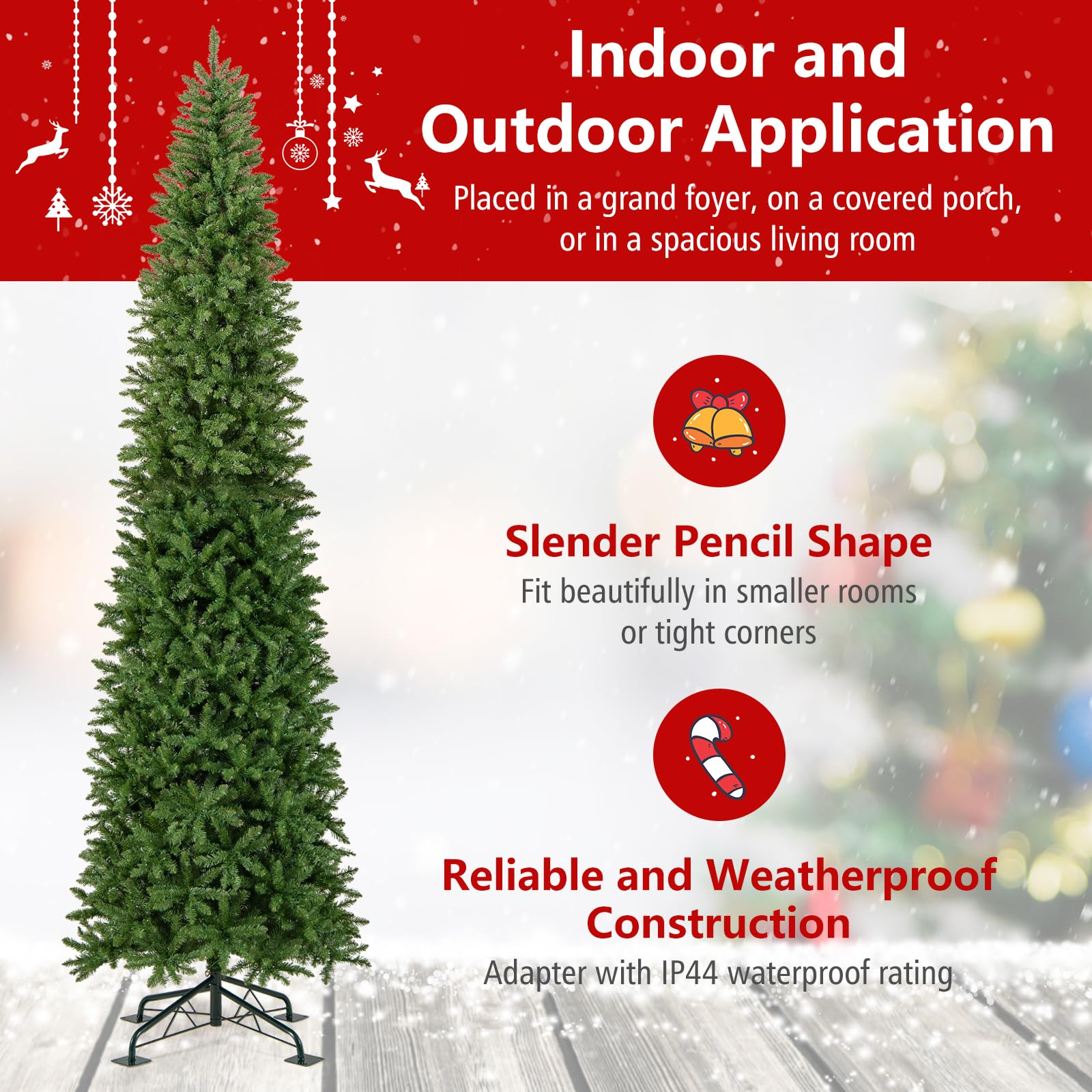 Transform your holiday decoration with our stunning 12 ft tall artificial Christmas tree, perfectly designed for both indoor and outdoor environments. It stands tall with an impressive display of 2840 lush branch tips and is illuminated by 1000 warm white LED lights that cast a soft and inviting glow. Reliably constructed from fire-resistant PVC and supported by a robust cross-shaped metal base with anchoring plates and expansion screws, this holiday tree ensures stability and safety whether set up in your living room or braving the elements outdoors. Its slim pencil shape makes it ideal for tight spaces, allowing it to be a standout centerpiece without overwhelming your space. Additionally, its IP44 waterproof rating ensures that this lighted tree can withstand weather changes, though we recommend storing it away during severe weather to preserve its beauty and extend its lifespan. Designed with hinge connections, assembly is straightforward, making setup and dismantling quick and efficient - a perfect blend of elegance, safety, and convenience for your festive celebrations.