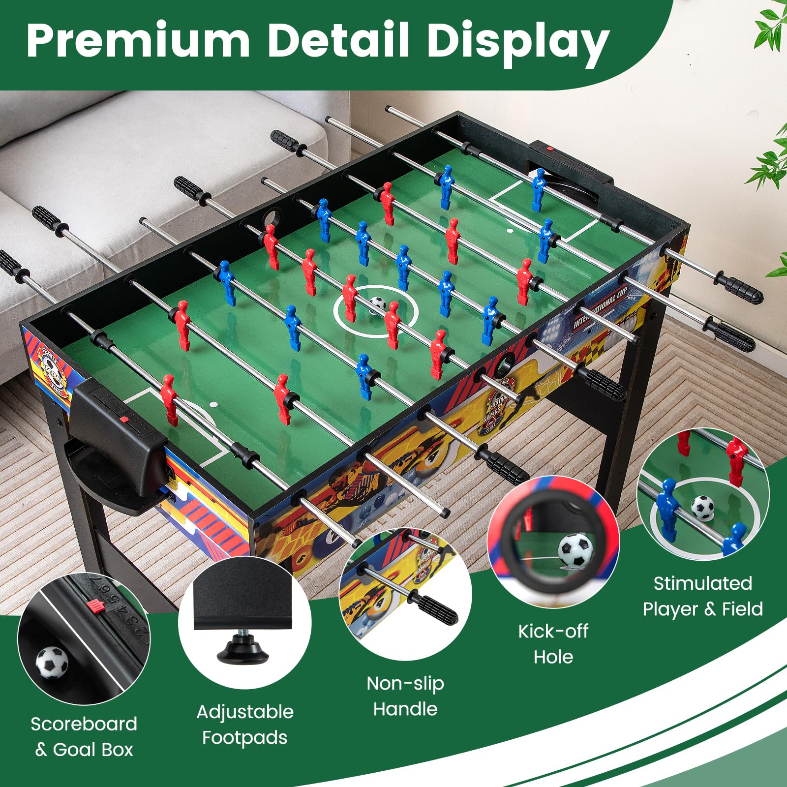 - ?【Premium Details for Ultimate Gaming Experience】 Designed for a delightful gameplay, our game table features non-slip handles complete with kick-off holes for a seamless and enjoyable game experience. In addition, the simulated player and field design and scoreboard with goal box further enhance the gaming experience and add an authentic touch to every game.