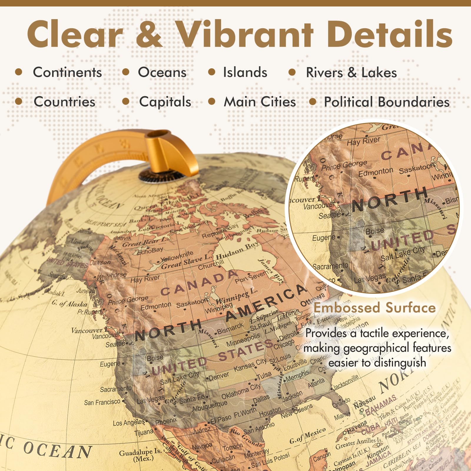 This spinning globe serves as a learning tool, a decoration piece, a night light, or a thoughtful gift, suitable for various settings. With clear high-definition details, the embossed surface offers a tactile experience for easier geographical recognition. The elegant wooden base with anti-slip pads adds a touch of sophistication while ensuring stability. Conveniently powered via a USB cord with a switch, this world globe is a perfect blend of aesthetics and practicality for homes, schools, and offices.