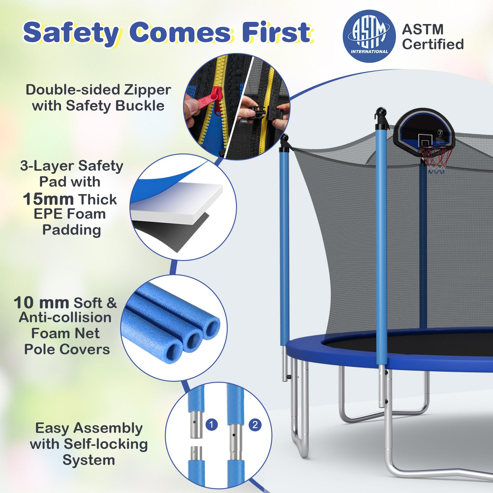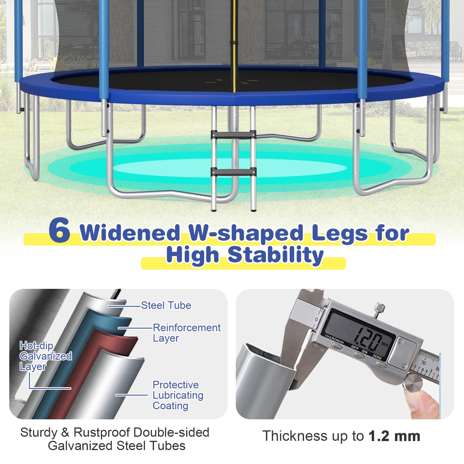 Our ASTM certified trampoline will bring endless fun to your family! Constructed with a hot dip and galvanized steel frame, the trampoline features superb rust resistance and is built for durable outdoor use. Equipped with an enclosure net, safety pad and double protection entrance, safety during jumping is completely protected. The jumping mat and springs are tested to ensure an outstanding bouncing experience. And the jumping mat is also weather resistant for long time outdoor use. With this outdoor trampoline, players can enhance physical fitness while jumping happily.