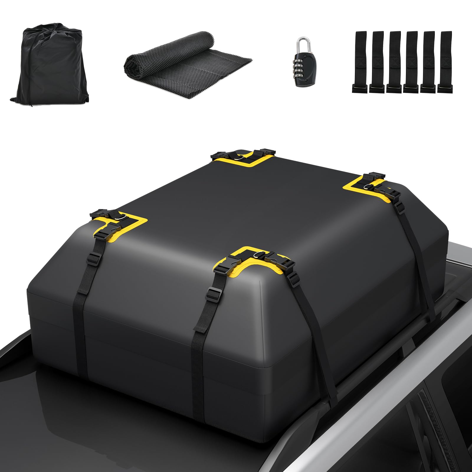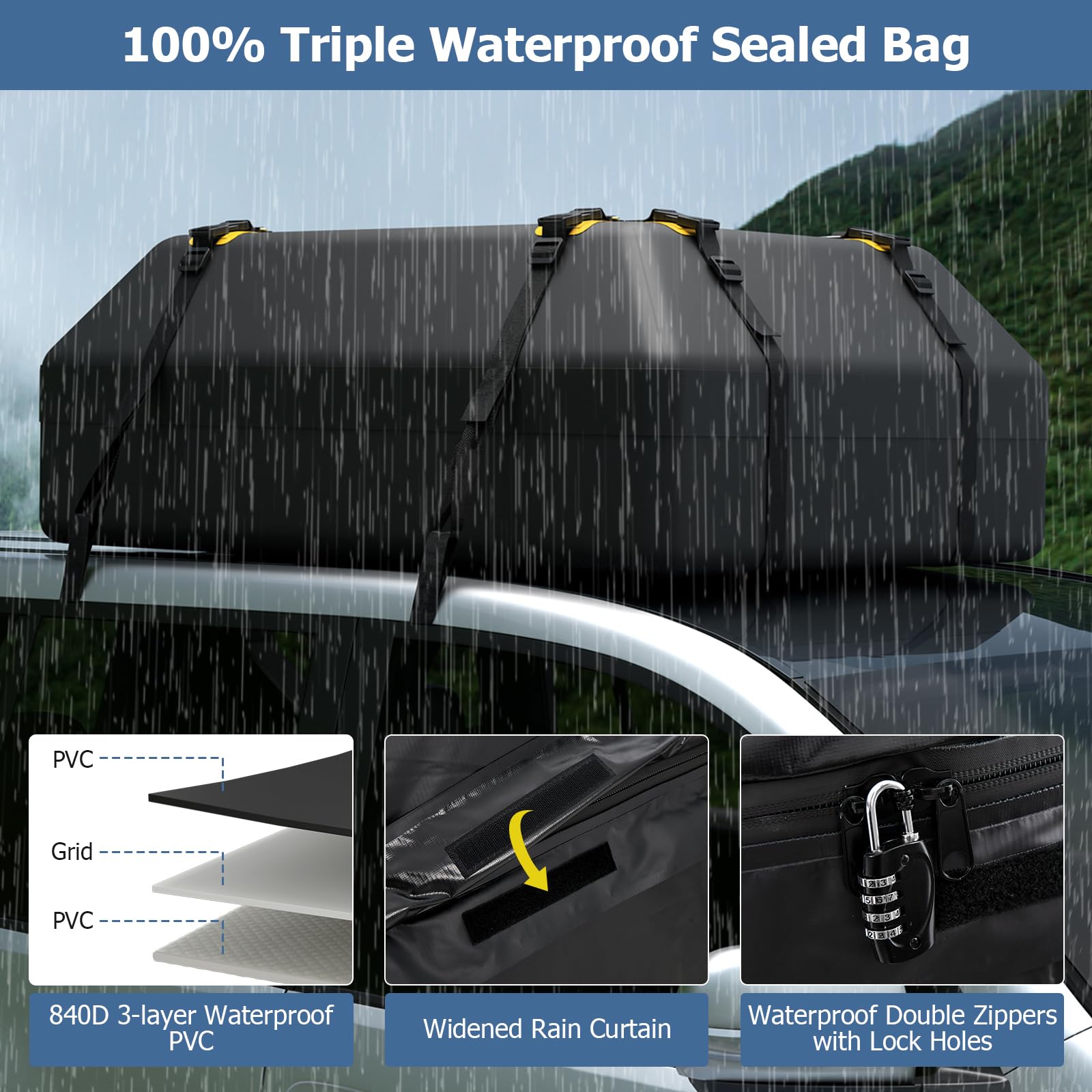Say goodbye to cramped car spaces and hello to convenience and organization on your next road trip. Come and check our weather resistant roof bag, the spacious solution for all your storage needs, with its large capacity, you can easily pack all your camping gear on the road. Besides, crafted with a durable polyester fabric coated by high-quality PVC, this weather-resistant roof bag is designed to withstand any weather condition. Moreover, thanks to the convenient door hooks, mounting this roof bag is a breeze and it fist to various car roof. Furthermore the foldable and portable design allows you to simply lay the roof carrier flat, fold it to a small size for easy storage, and put it into the included drawstring storage bag. Tighten the bag's opening for added security. This user-friendly design ensures that you can spend more time enjoying your trip. Performed well under these conditions including bumpy road, steep hills, sudden turn, high speed. Not to mention the rain curtain with waterproof zipper that provides protection to your belongings compared to the non-waterproof zipper, flimsy strap seam and easy-to-break straps. Upgrade your storage capabilities with our luggage roof rack bag and start your adventure!