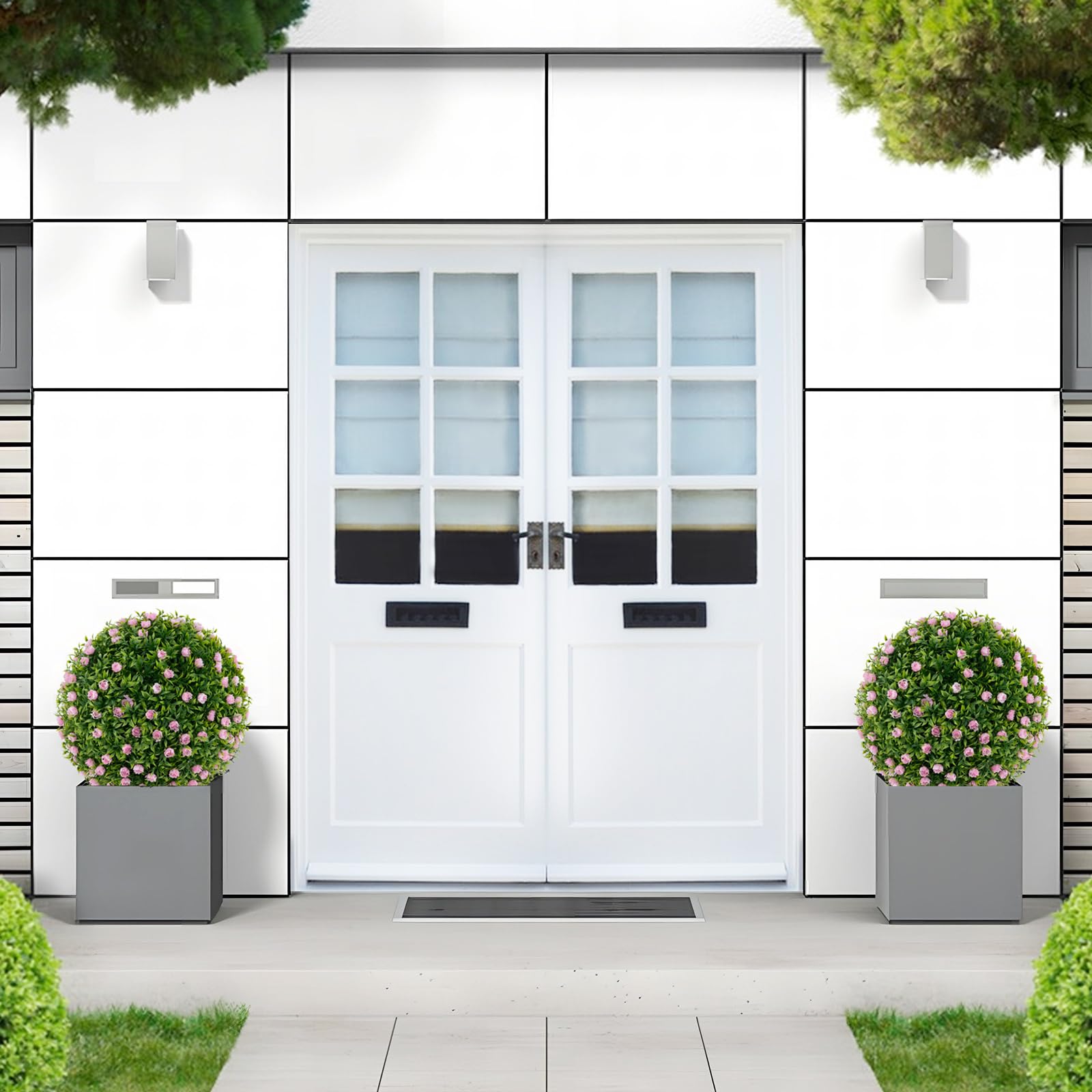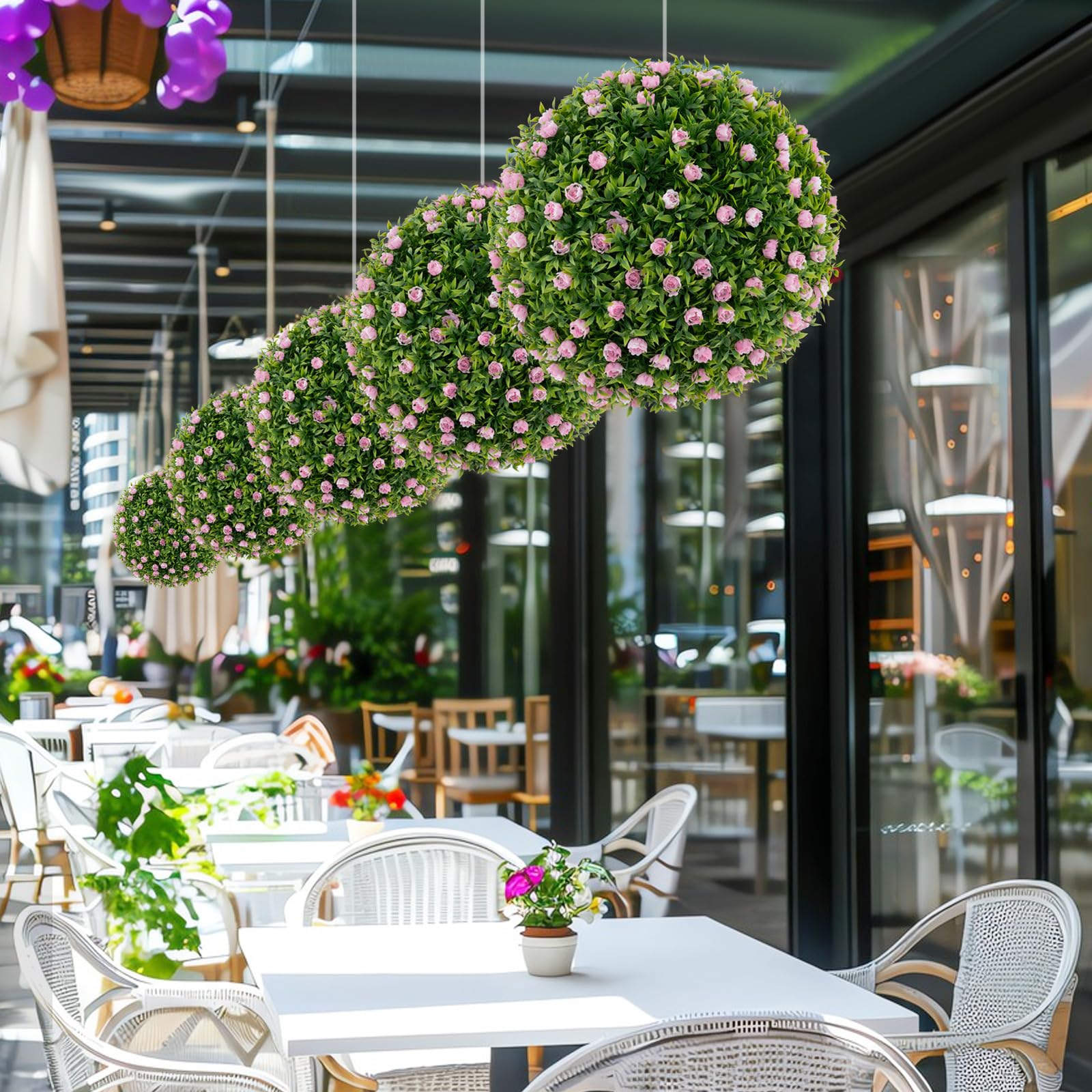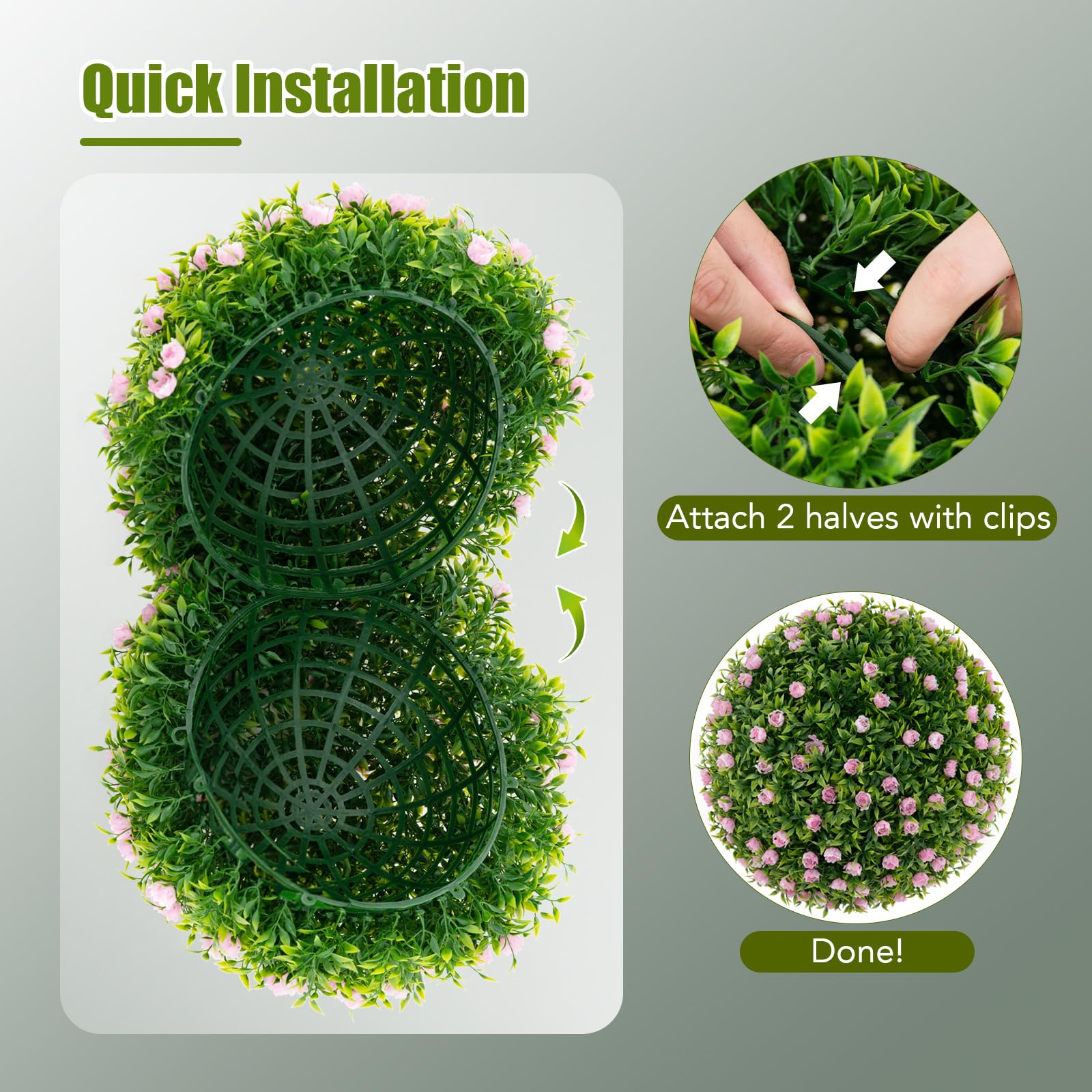 The faux decorative balls come with lush gradient green leaves, creating a more attractive & vivid appearance. Unlike others without flowers, ours features lovely pink flowers, which are sure to add a pop of color that instantly brightens up the room. Made from sun-proof, and odor-free PE material, our faux green ball plant is designed to withstand both indoor and outdoor environments. Most importantly, the faux garden sphere requires no maintenance while still bringing all year round vitality. You can hang them to create a whimsical look or place them on the floor for a grounded touch. In addition, you can put it in a round and square flower pot with a 15" top opening. Therefore, this 2 pack boxwood balls can be widely used for home, office, wedding or lawn. Moreover, the easy assembly will free your hands.