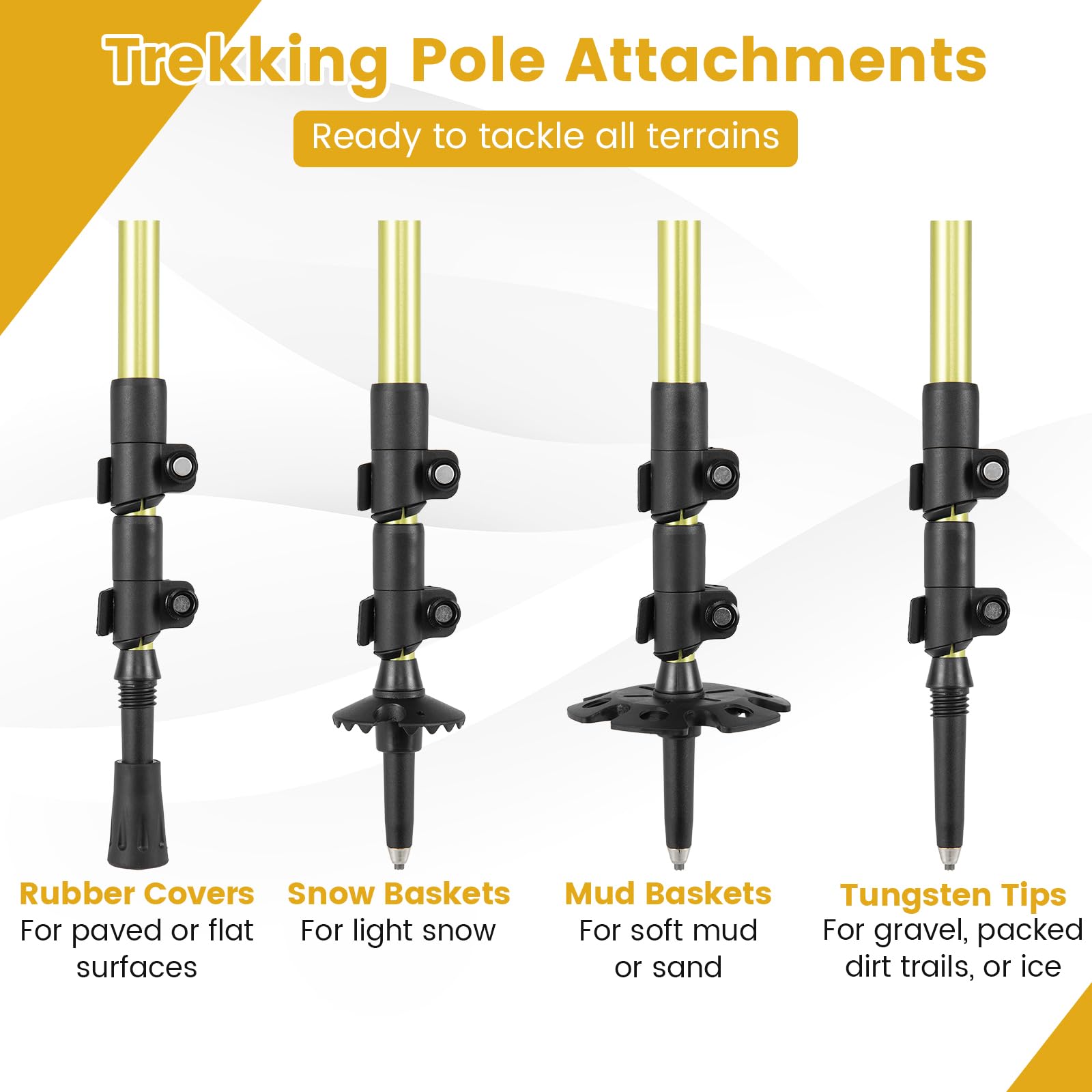 Trekking poles feature adjustable length options and quick-locking mechanism