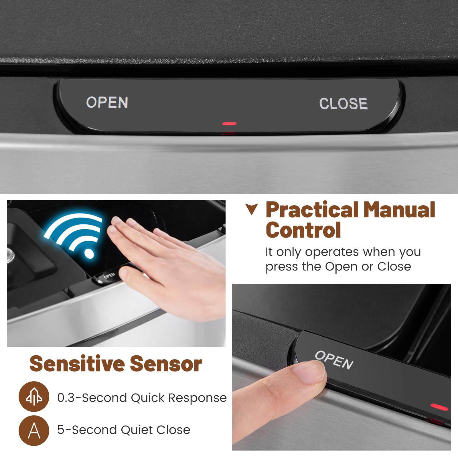 Introducing the innovative touchless motion sensor waste bin, designed to simplify waste disposal in style and convenience. This cutting-edge 19 gal trash can opens automatically in a swift 0.3 seconds upon detecting motion, offering a hands-free experience. It boasts a 12 gal upper compartment and a detachable 1 gal kitchen waste bin for efficient waste management. The thoughtfully crafted dual pull-out system provides 2 small removable trash cans of 3 gal, allowing for seamless recycling. Experience ultimate ease with the stay-open lid feature and gentle soft-closing mechanism, ensuring quiet and hassle-free operation. Crafted from a durable 3-layered stainless steel construction, this trash can resists fingerprints and offers exceptional longevity. Complete with anti-slip foot pads, this trash bin ensures floor protection.