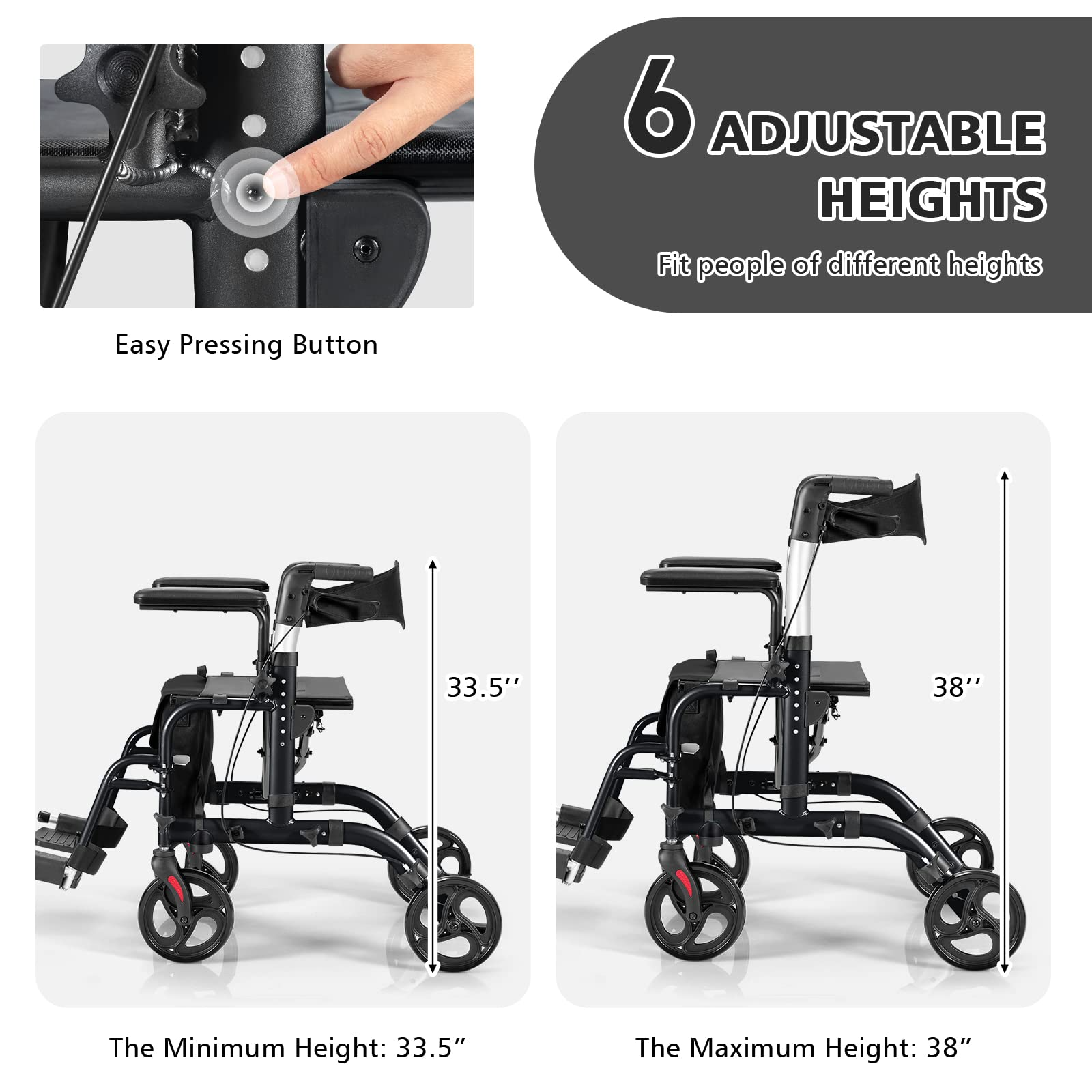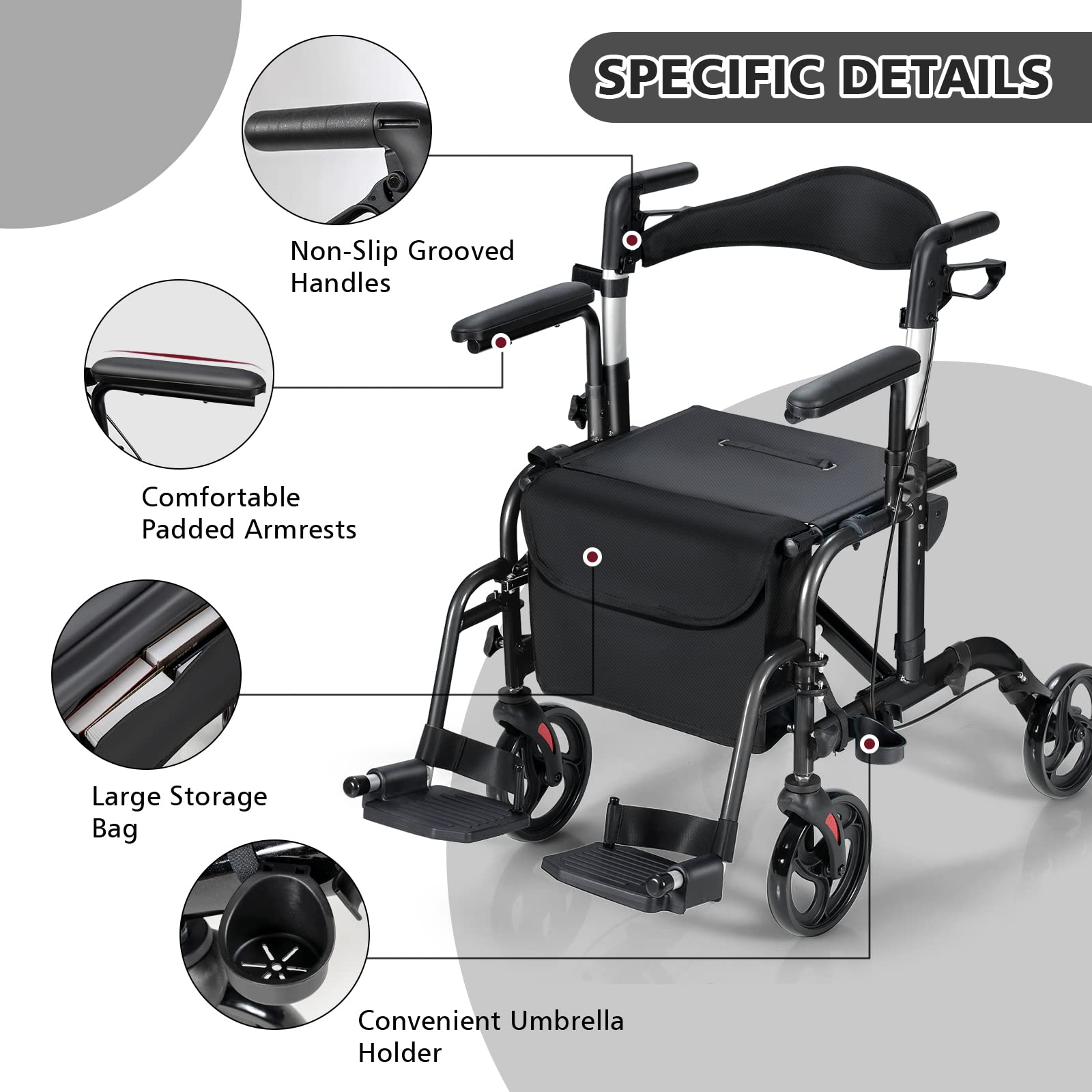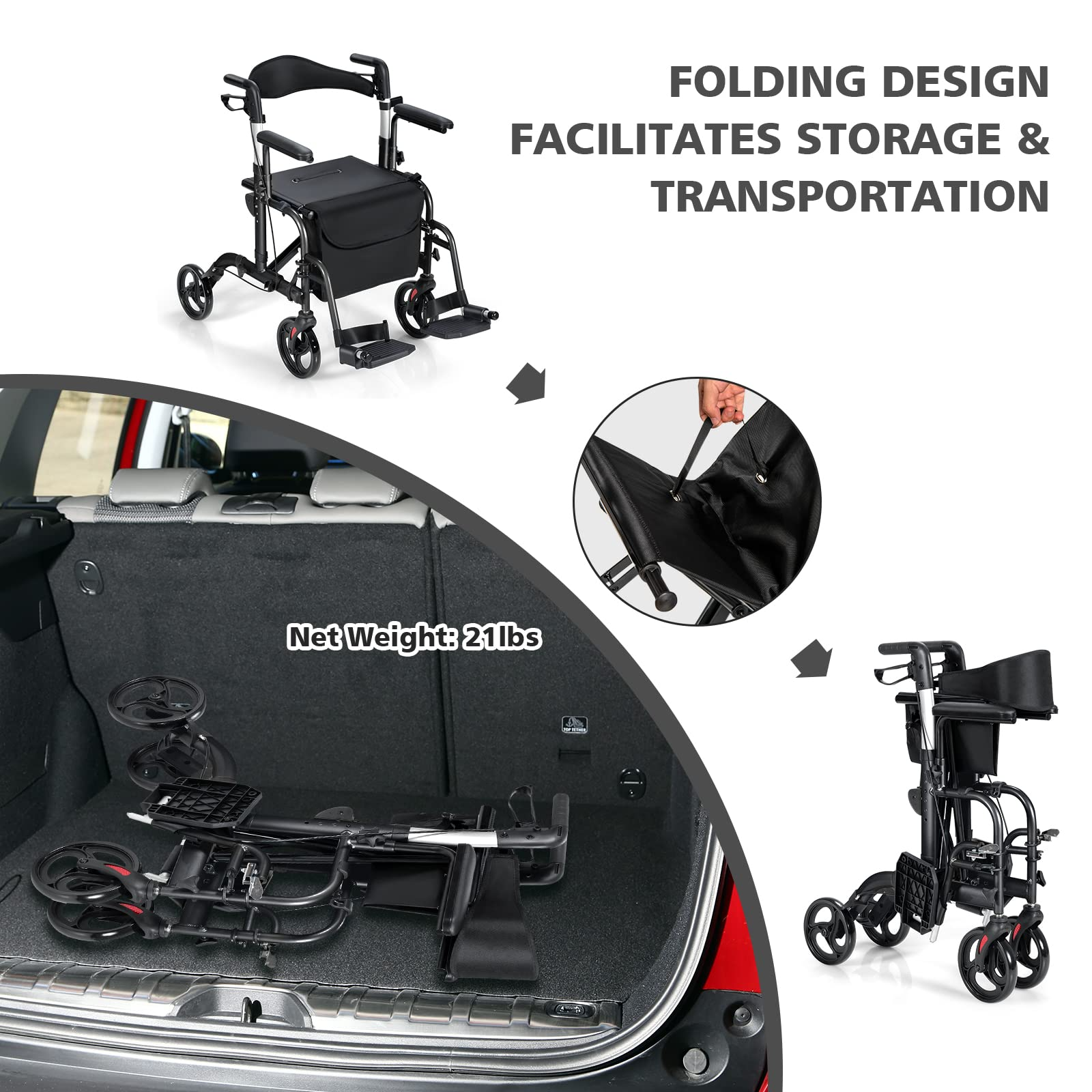 This 2-in-1 rollator walker is a necessary addition for disabled people and seniors. Specially designed reversible backrests and rotatable footrests can be flipped over to meet users' needs for walking and sitting. High-quality aluminum alloy and sturdy structure ensure high stability, durability, and a heavy load capacity of 300 lbs. This lightweight rollator with a folding design can be carried effortlessly. The handle with 6 adjustable heights can easily be set to a humanized height by pressing the button. Also, handbrakes allow users to pull up to control speed and push down to park the walker as needed. Extra removable storage bag and-sided umbrella/cane holder facilitate items carrying. All in all, this rollator helps users hang out freely and effortlessly!