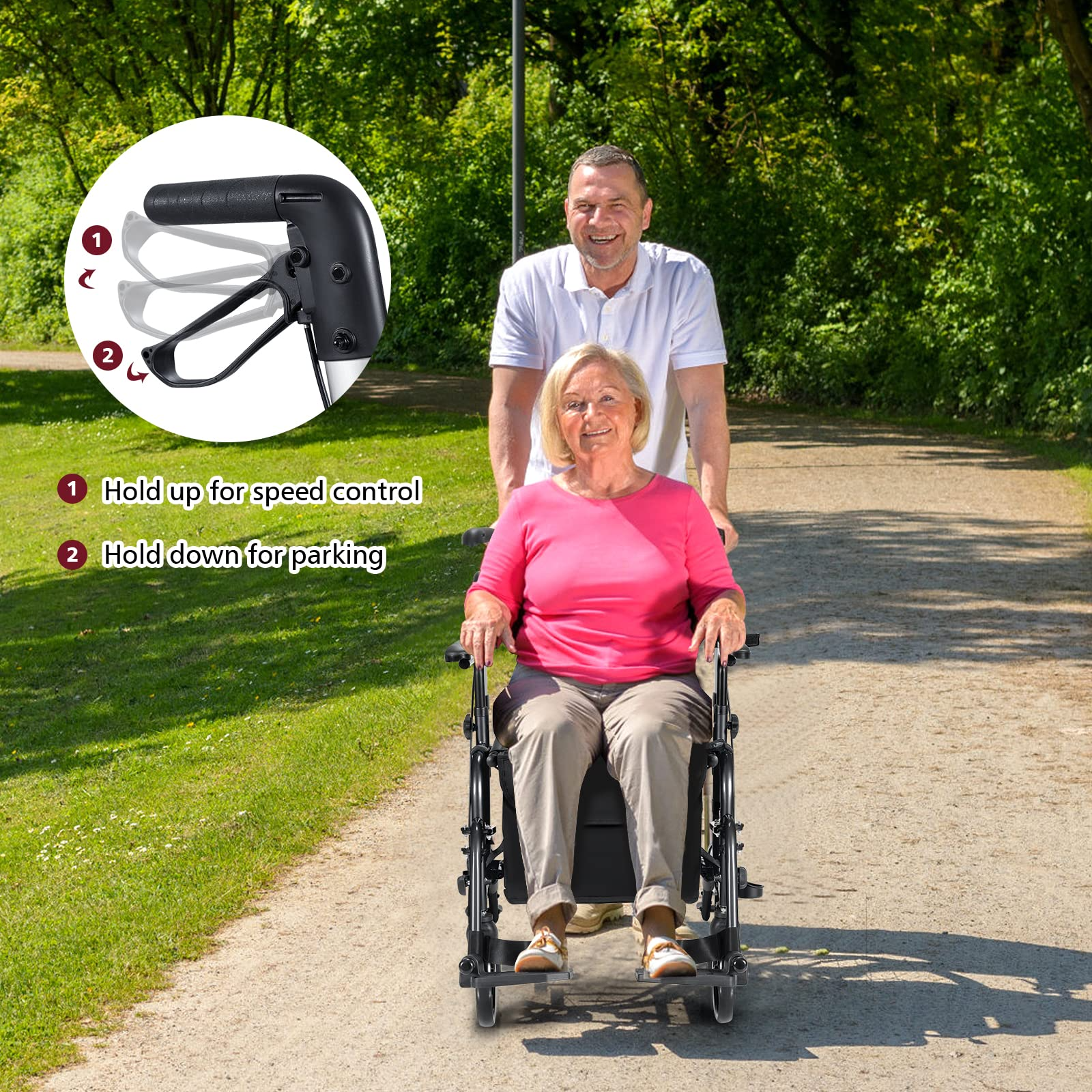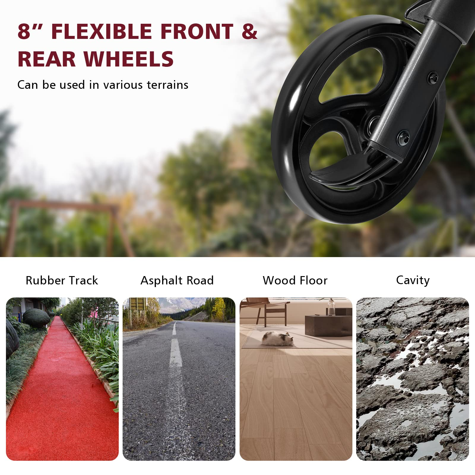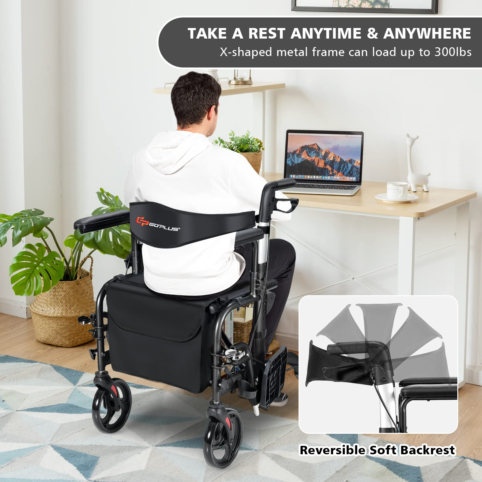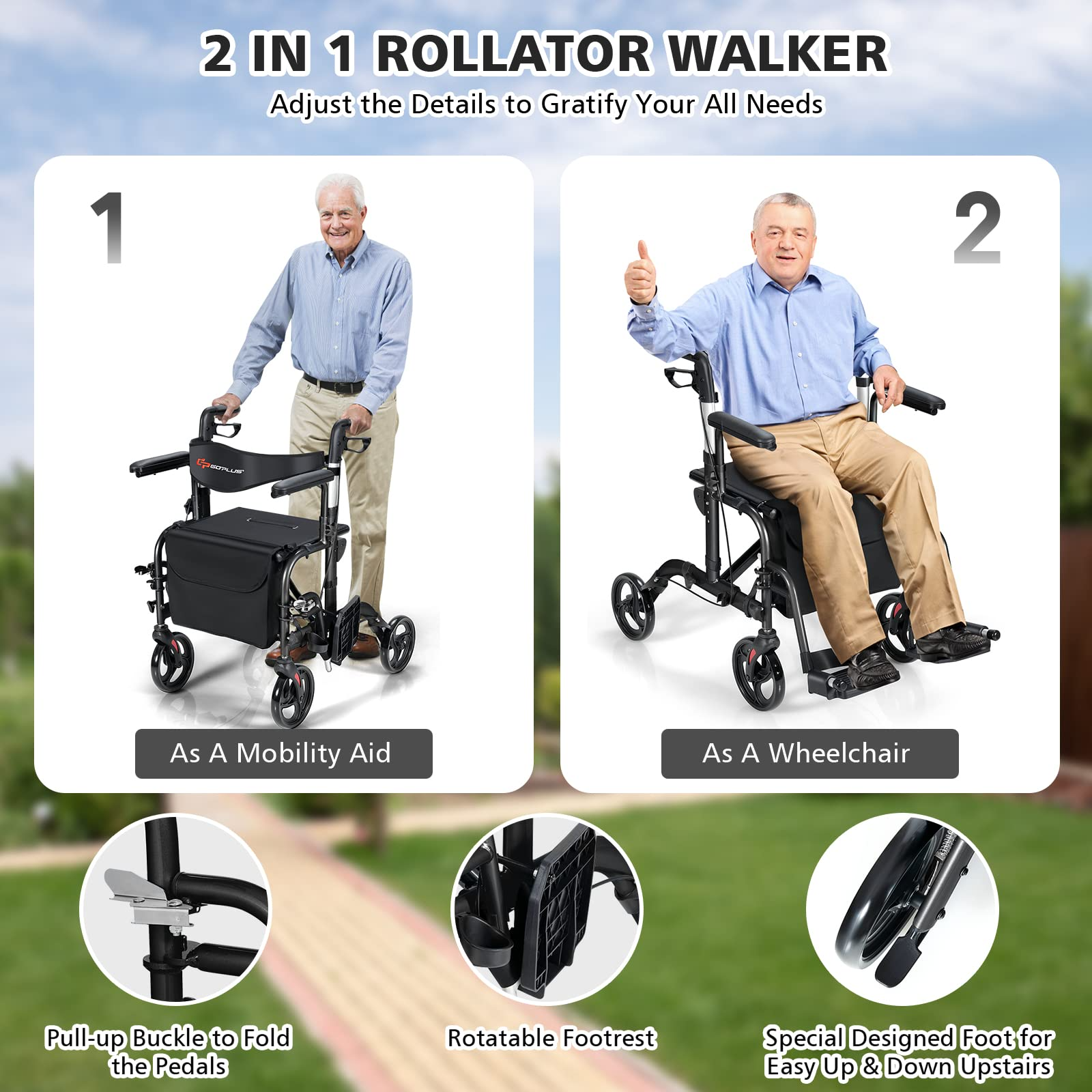 This 2-in-1 rollator walker is a necessary addition for disabled people and seniors. Specially designed reversible backrests and rotatable footrests can be flipped over to meet users' needs for walking and sitting. High-quality aluminum alloy and sturdy structure ensure high stability, durability, and a heavy load capacity of 300 lbs. This lightweight rollator with a folding design can be carried effortlessly. The handle with 6 adjustable heights can easily be set to a humanized height by pressing the button. Also, handbrakes allow users to pull up to control speed and push down to park the walker as needed. Extra removable storage bag and-sided umbrella/cane holder facilitate items carrying. All in all, this rollator helps users hang out freely and effortlessly!