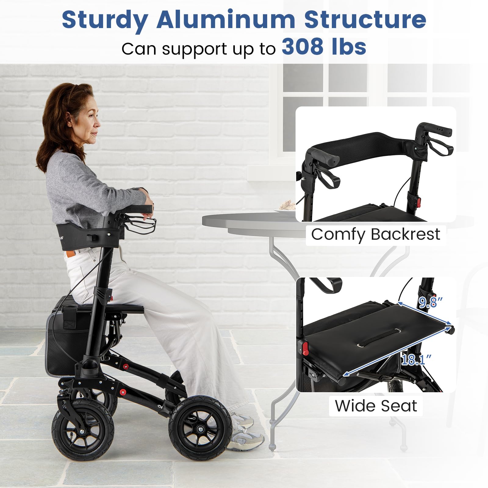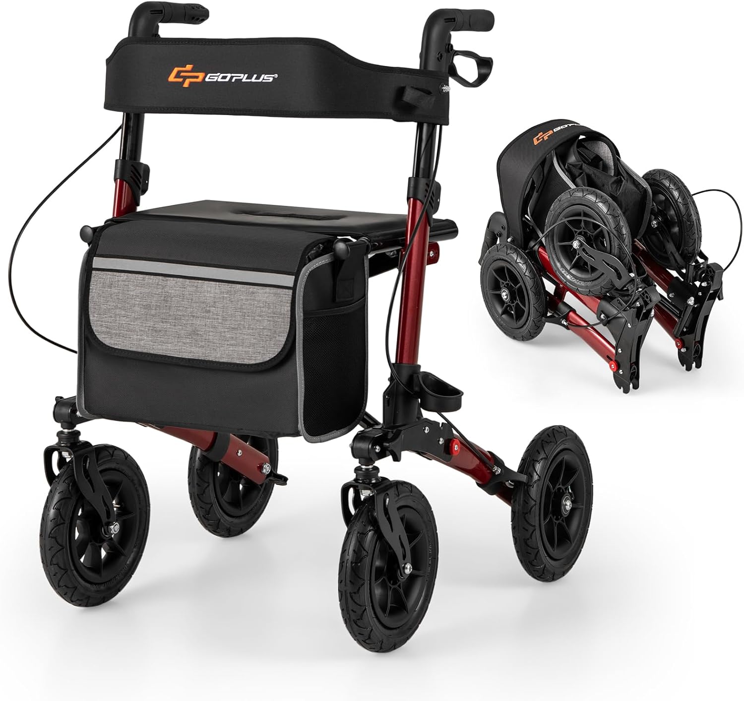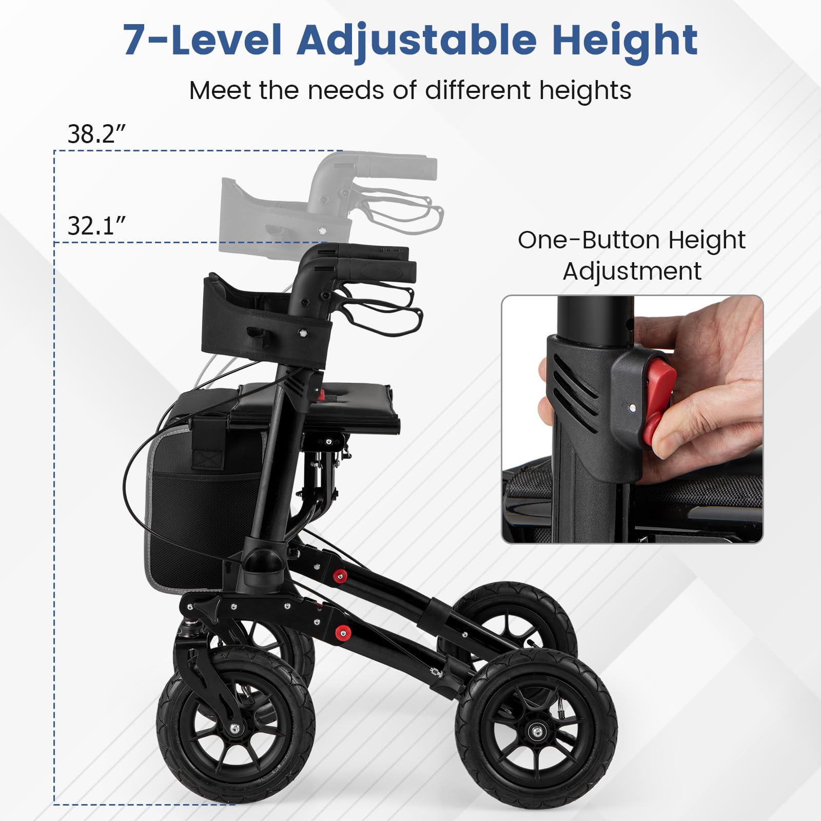 This walker is built with a lightweight yet robust aluminum structure, featuring a unique folding mechanism for easy storage and transport. The all-terrain pneumatic tires ensure smooth and silent rolling indoors and outdoors, while the adjustable handle height caters to various users. Offering a versatile braking system for control and safety, and designed for comfort with a backrest and wide seat, this rollator walker provides seniors with independence and a pleasant walking experience.