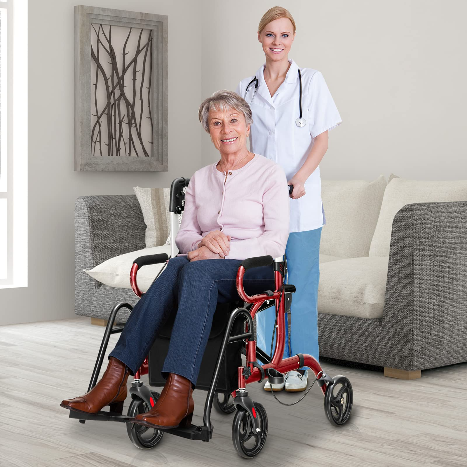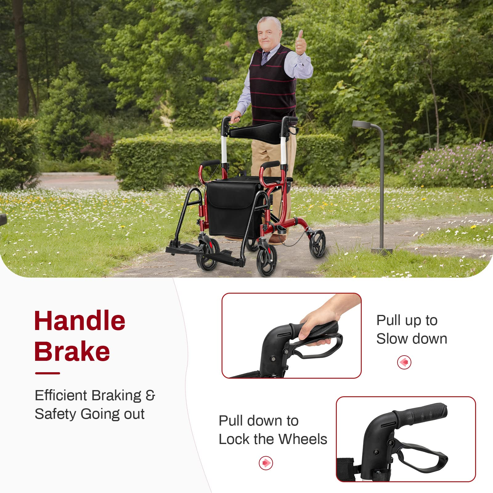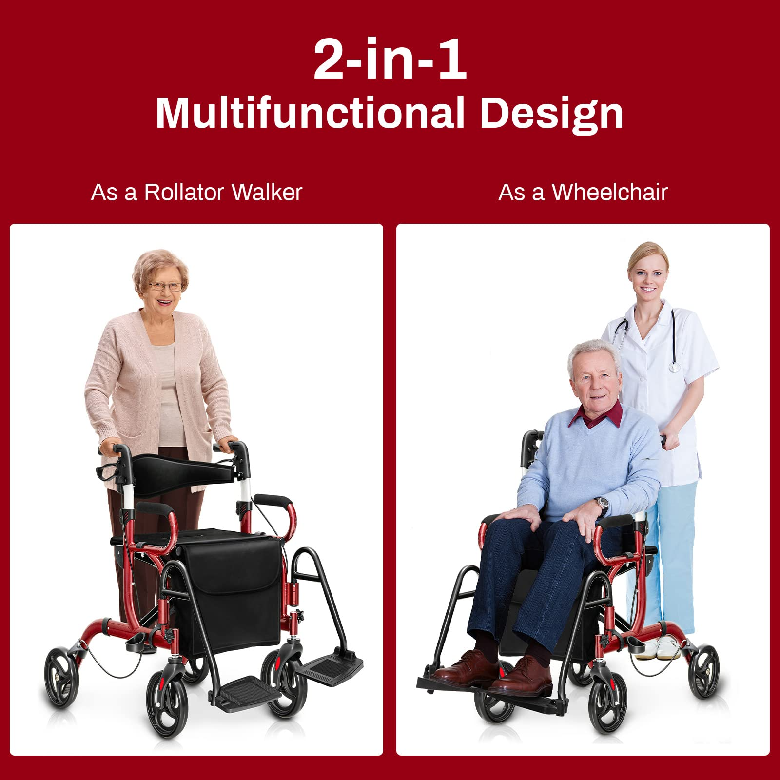 - 2-in-1 Multifunctional Design: As a rollator walker, it is a great walking assistant for the elderly. More than that, this walker can also serve as a wheelchair by turning the backrest over to the back and putting the footrests down, providing a rest seat with soft padded armrests, or helping people who have difficulty in movement.