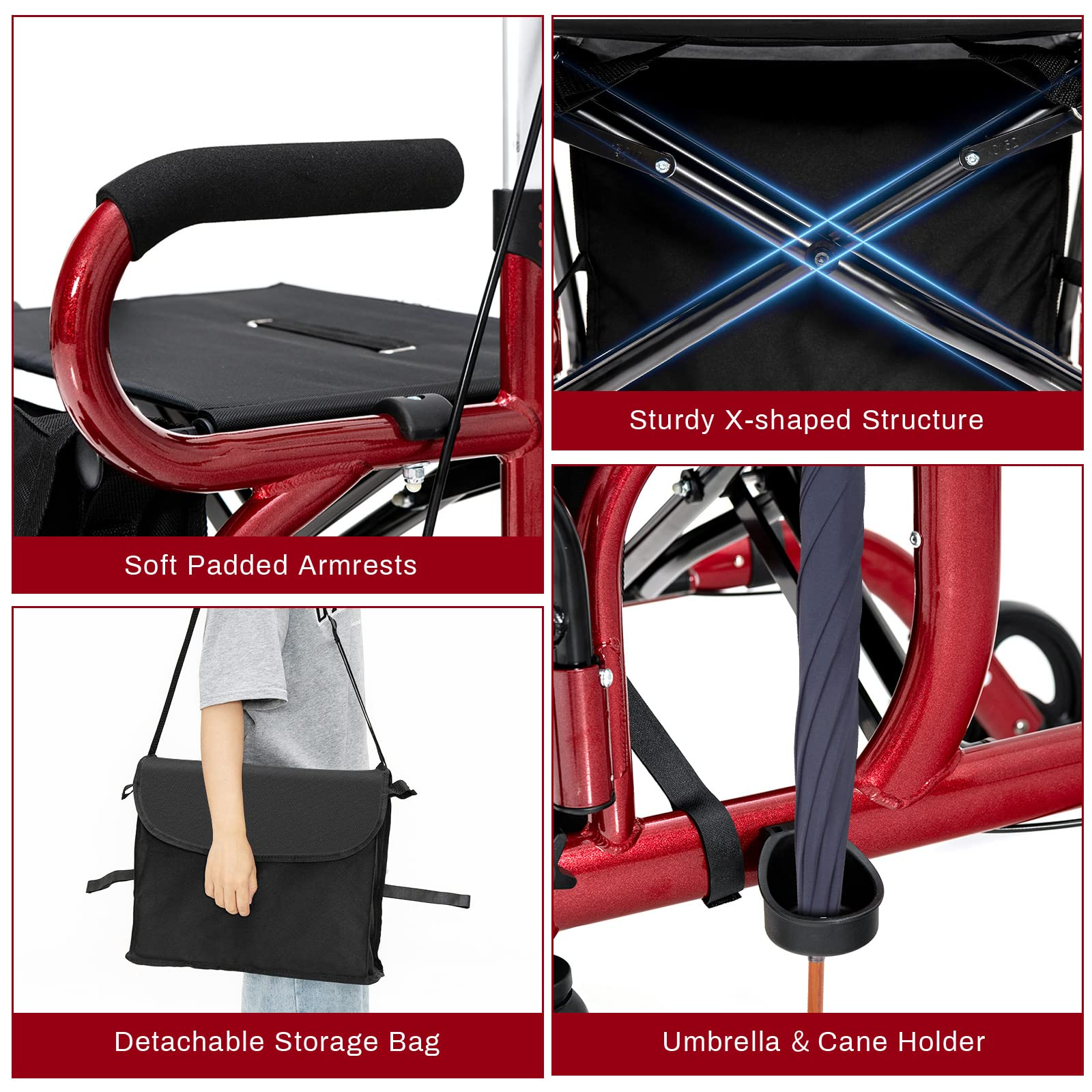 - Designs for Convenient Use: For a better user experience, this mobility walking aid features humanized designs: there is a holder on one side for placing your umbrella and cane. Moreover, the detachable storage bag allows you to place your small items, and you can remove them from the rollator to use them as a bag.