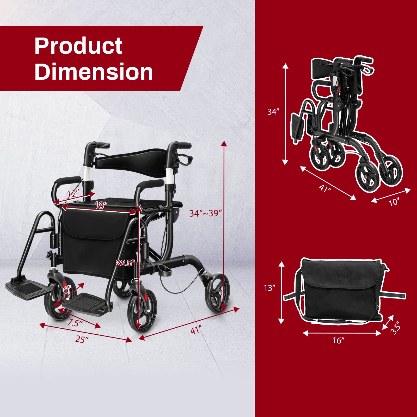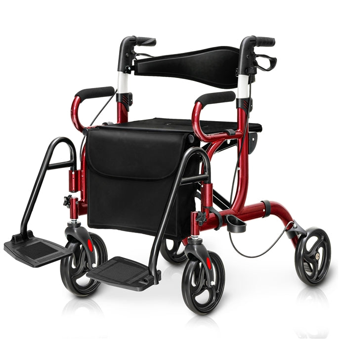 Designed for the elderly or people who have moving difficulties, this foldable walker has multiple adjustments that meet your different needs. Thanks to the reversible backrest and foldable footrests, it can be used not only as a walking aid, but also as a transport chair. When you use it to help you to walk, you can adjust the handle height to a better position. And while it serves as a wheelchair, the sturdy X-shaped structure can strongly support you. Additionally, the durable PVC wheels are suitable for various road surfaces. This rollator walker can smoothly change directions owing to the universal front wheels. The one-hand folding design offers great convenience to transport and store. It is also equipped with an umbrella and cane holder for great convenience. What’s more, it comes with a large storage bage for your items.