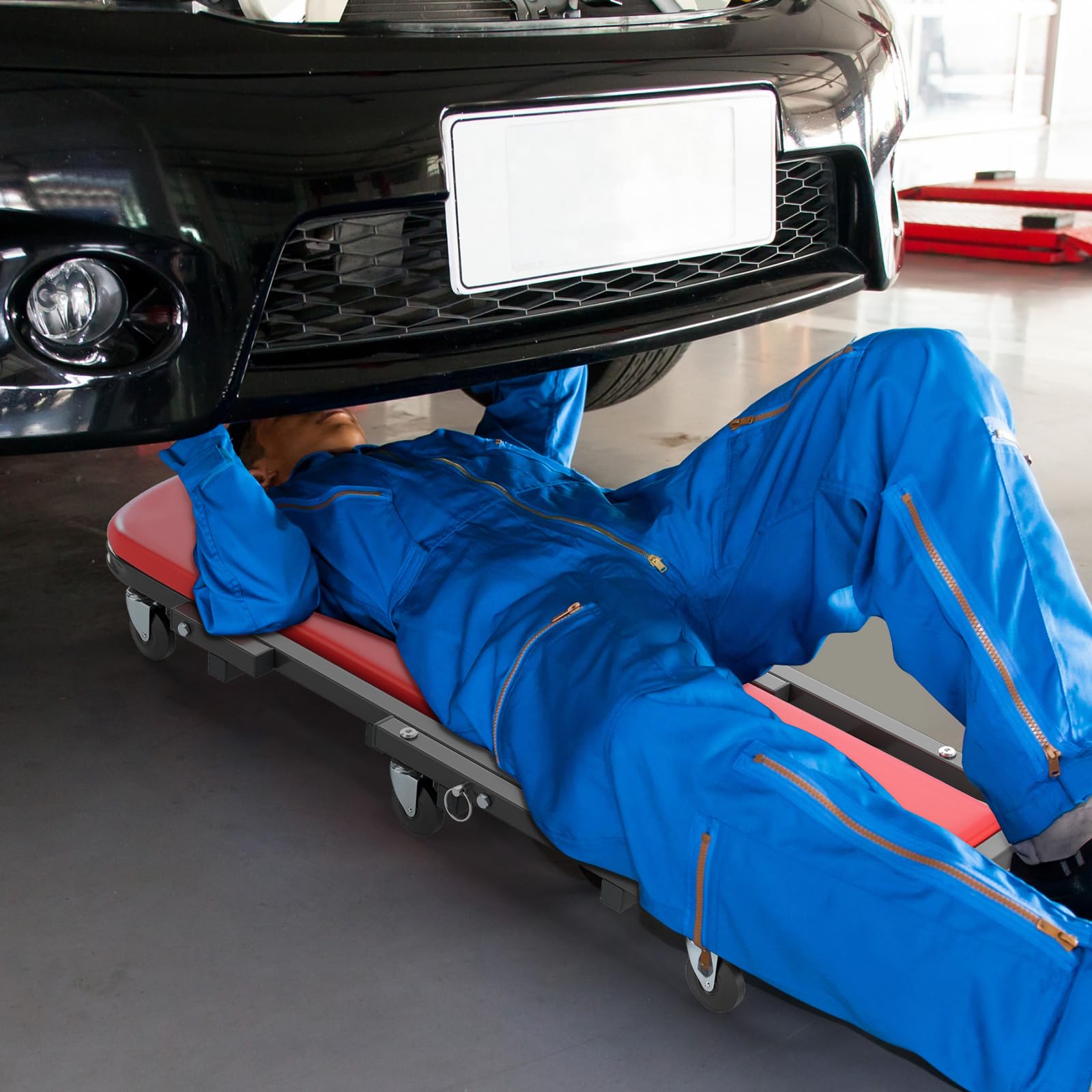 This low-profile mechanic creeper boasts a versatile 2-in-1 design that easily transforms from a comfortable seat to a creeper with just a simple pin pull, giving you the flexibility to sit or lie down as needed. Built with a robust heavy-duty frame, it supports up to 300 lbs when used as a seat and 350 lbs when used as a creeper. 6 swivel casters provide smooth and silent movement across various workshop floors, boosting your productivity. For added coziness during long tasks, the foldable garage chair is equipped with a soft padded seat cushion to keep you comfortable throughout your work.