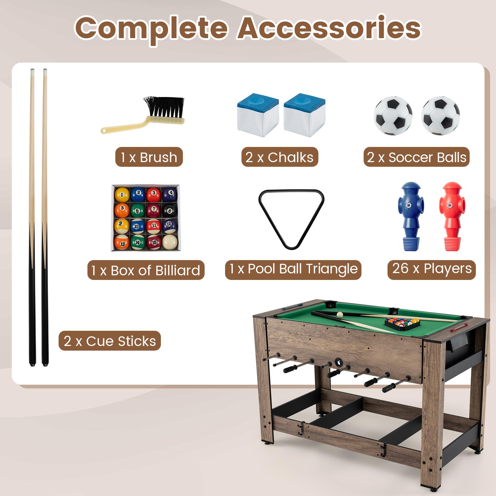 The 2-in-1 combo game table strikes the perfect balance between functionality and style in a small footprint. The sturdy design features thickened H-shaped legs and a reinforced base, providing reliable stability for the energetic matches. Adjustable leg levelers keep the table steady on any surface. The electroplated metal rods with anti-slip handles offer smooth, powerful control during foosball play. Also, you can enjoy a lifelike game with features like a central kick-off, automatic ball return, and detailed soccer keepers. On the pool side, poplar wood cue sticks and responsive cushion bumpers enhance every shot. Plus, a handy stick holder keeps accessories organized. The arcade game table is perfect for 2-4 players. Additionally, the 2-in-1 space-saving addition is ideal for game rooms, offices, or parties, delivering unbeatable entertainment for family and friends alike.