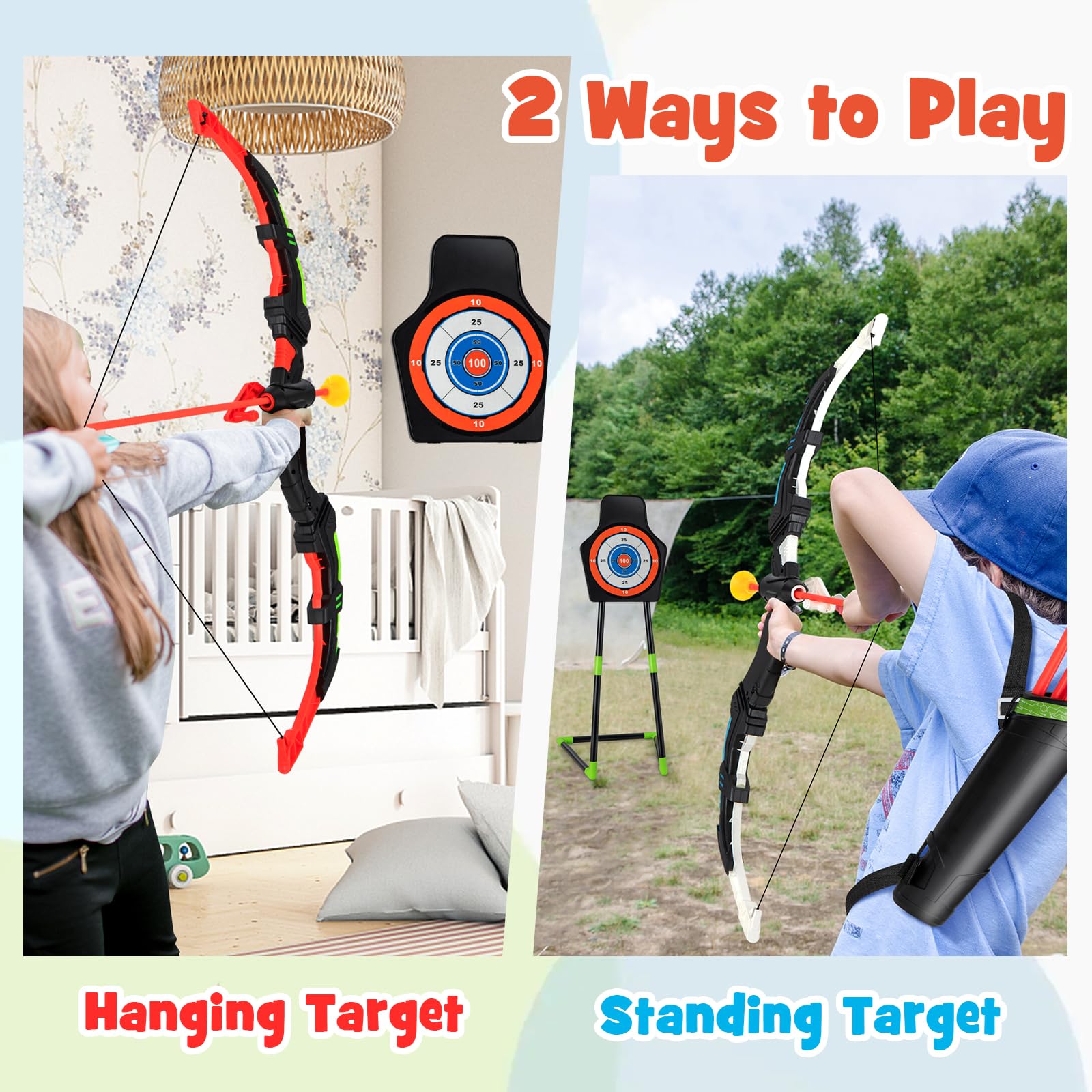 - ???Two Ways of Playing???The 2-in-1 detachable stand target offers 2 ways to play, use it as a hanging target on the wall or a standing target on the floor. This bow and arrow set is ideal for both indoor and outdoor use such as home, lawn, backyard, park, etc.?