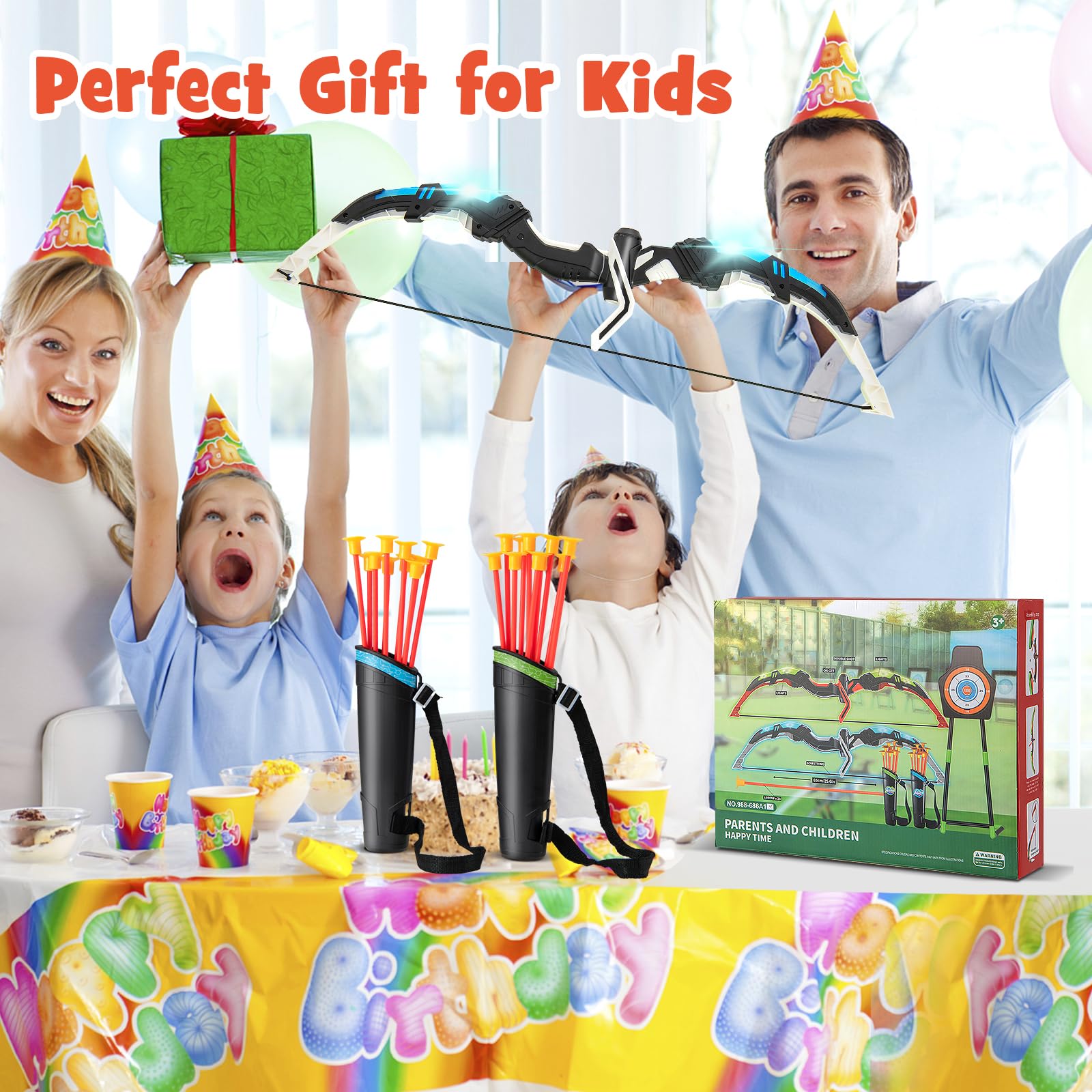 - ???2-Pack Bow and Arrow Set???The archery bow set includes 2 bows with LED lights, 20 arrows, 2 quivers, and 1 shooting practice target. With this comprehensive archery set, young players will have an immersive and exciting gaming experience.?
