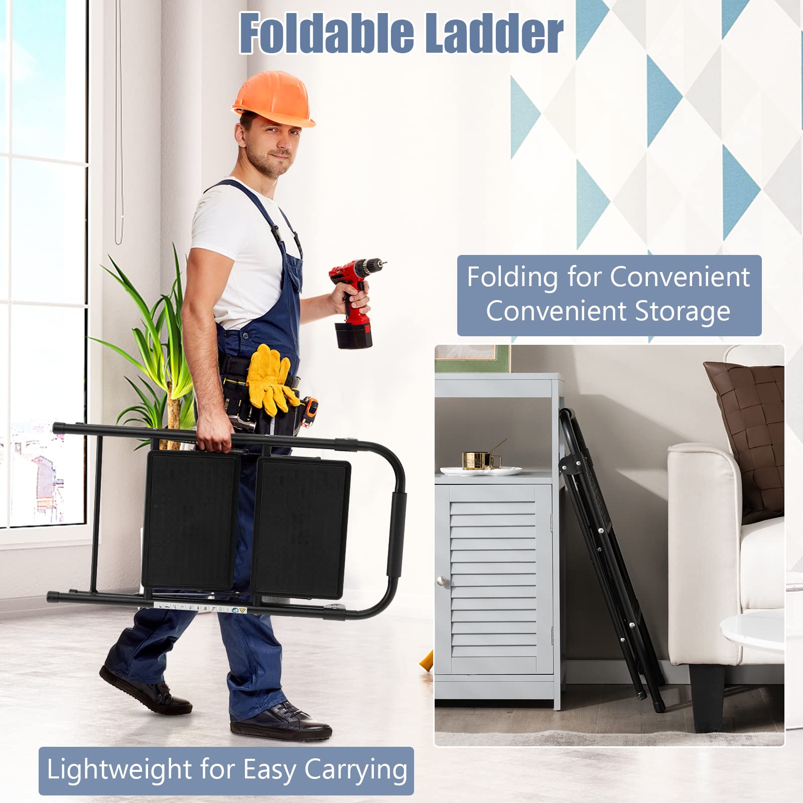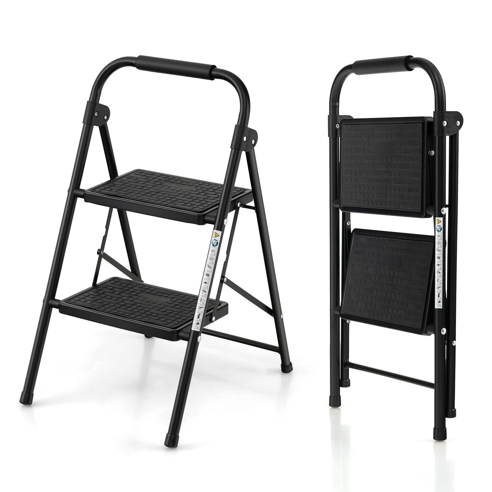 - Simple Movement & Storage: The heavy-duty metal stepladder features a lightweight of 7.5 lbs for easy movement. In addition, the convenient handle makes it simple to carry to your desired place. Once folded, the width is just 2 inches for space-saving storage.
