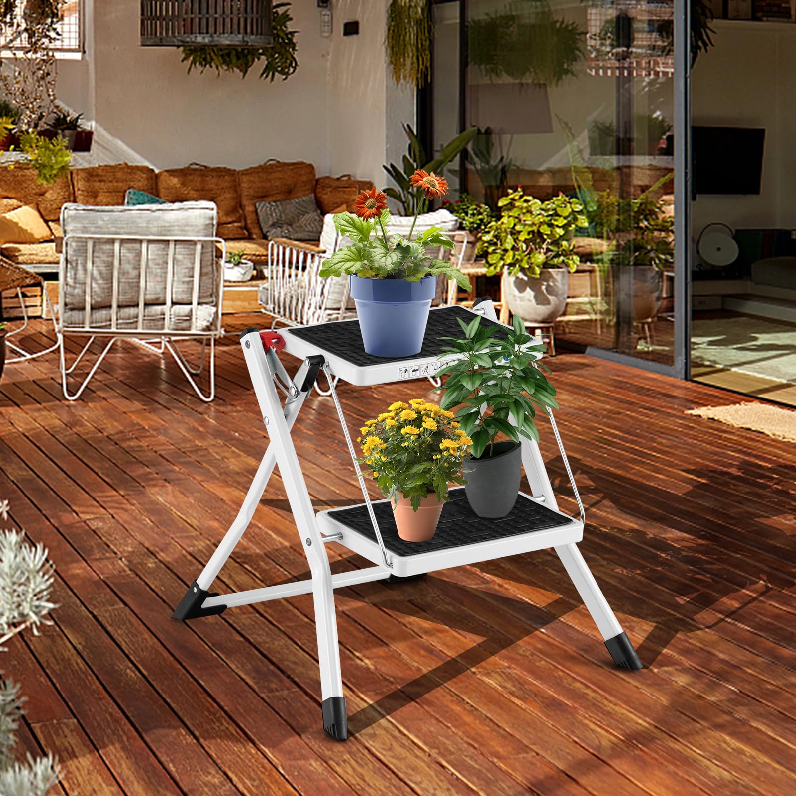 - Easy Folding & Storage: The heavy-duty metal stepladder weighs only 7.2 lbs/3.3 kg. In addition, the simple folding with the button makes this 2-step ladder easy to carry and easy to store. When folded, it will not take up too much floor space to save space.