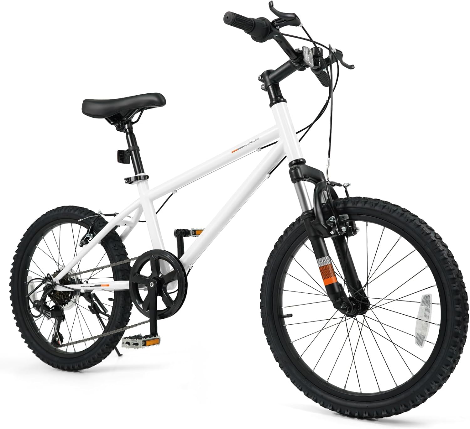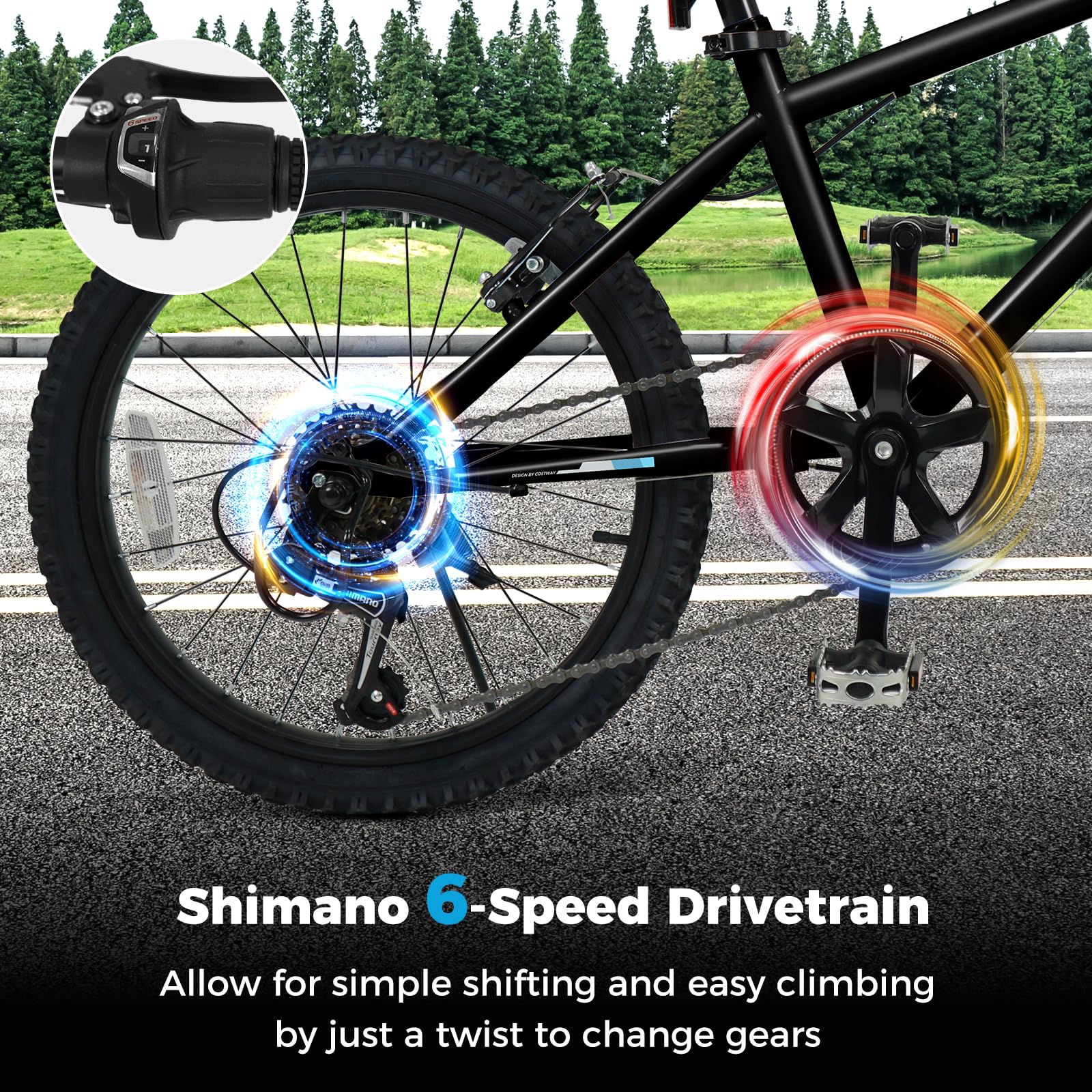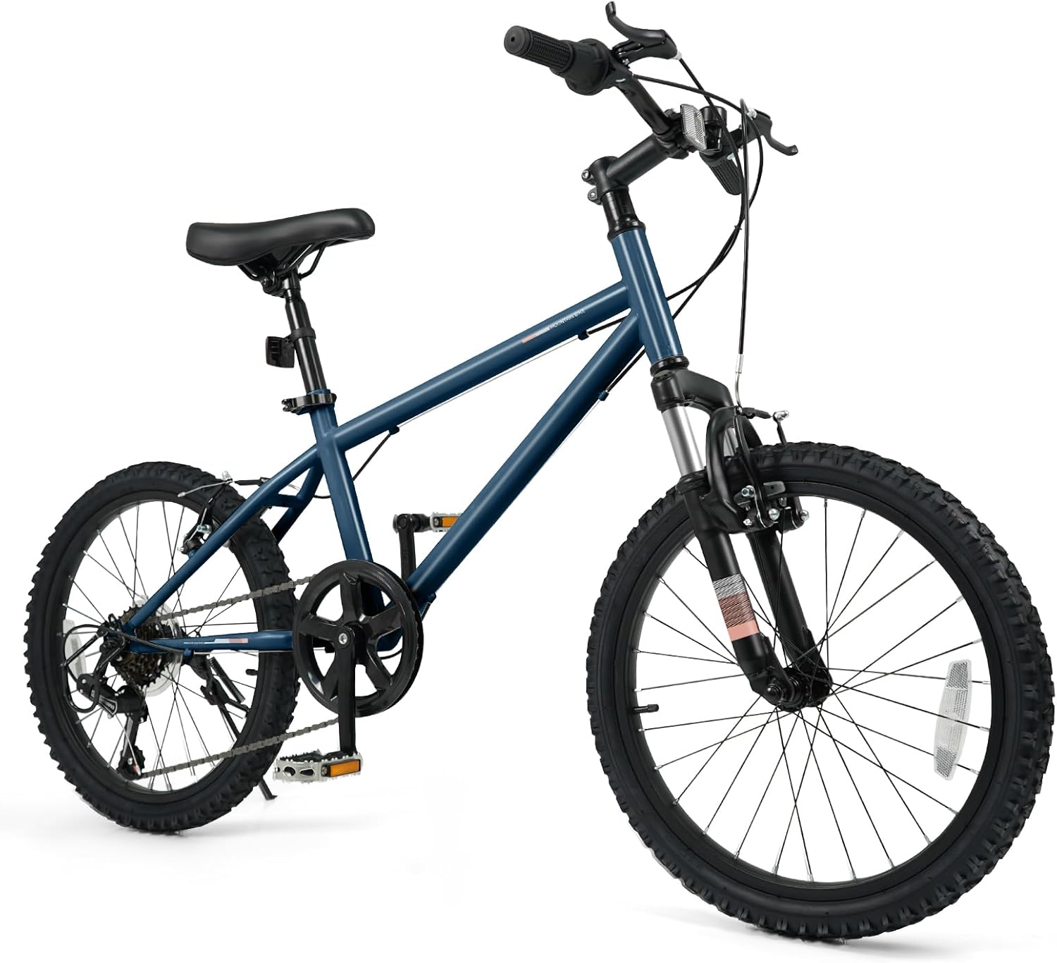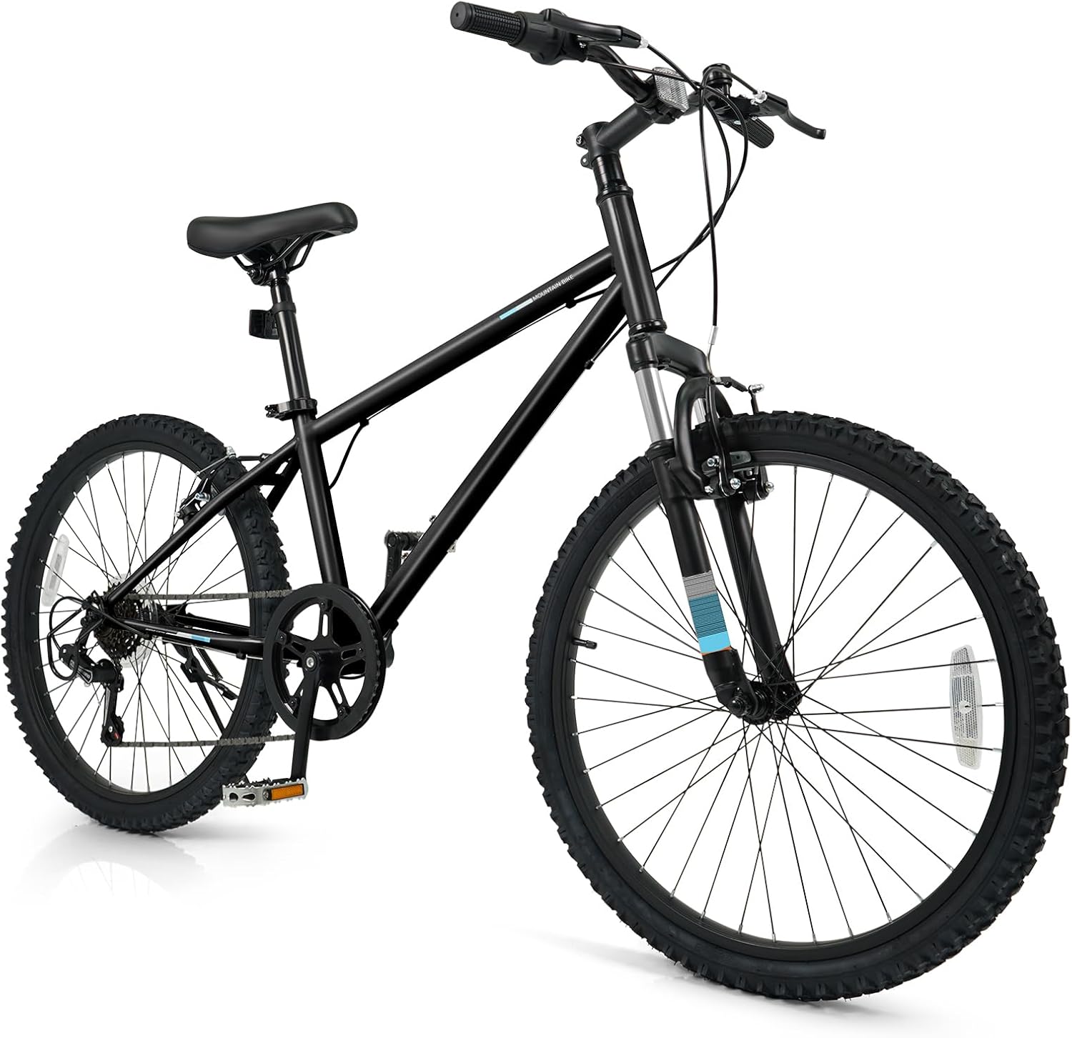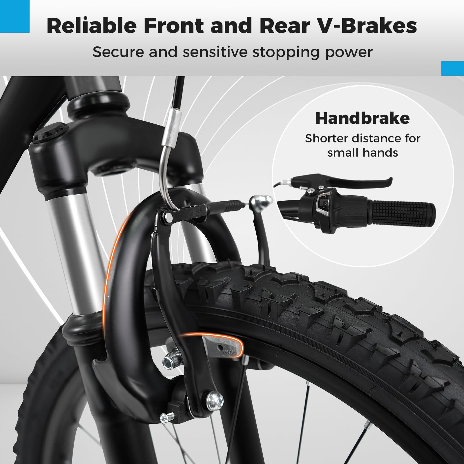 Our mountain bike comes in 2 wheel sizes (20"/24"), catering to children aged 13+ years old, expertly designed to handle diverse terrains with ease, complete with a 6-speed drivetrain, perfect for a smooth transition between various surfaces, from leisurely park rides to exciting hill climbs. It features a front suspension fork and large pneumatic tires, providing a cushioned ride on trails and city streets, ensuring your child's comfort and safety. Furthermore, with reliable front and rear V-brakes, young riders can safely navigate their journeys with ease. Both seat and handlebars are adjustable to grow with your child, ensuring a comfortable and ergonomic riding position. Gear up your young cyclist with this sturdy and versatile mountain bike for endless outdoor fun!