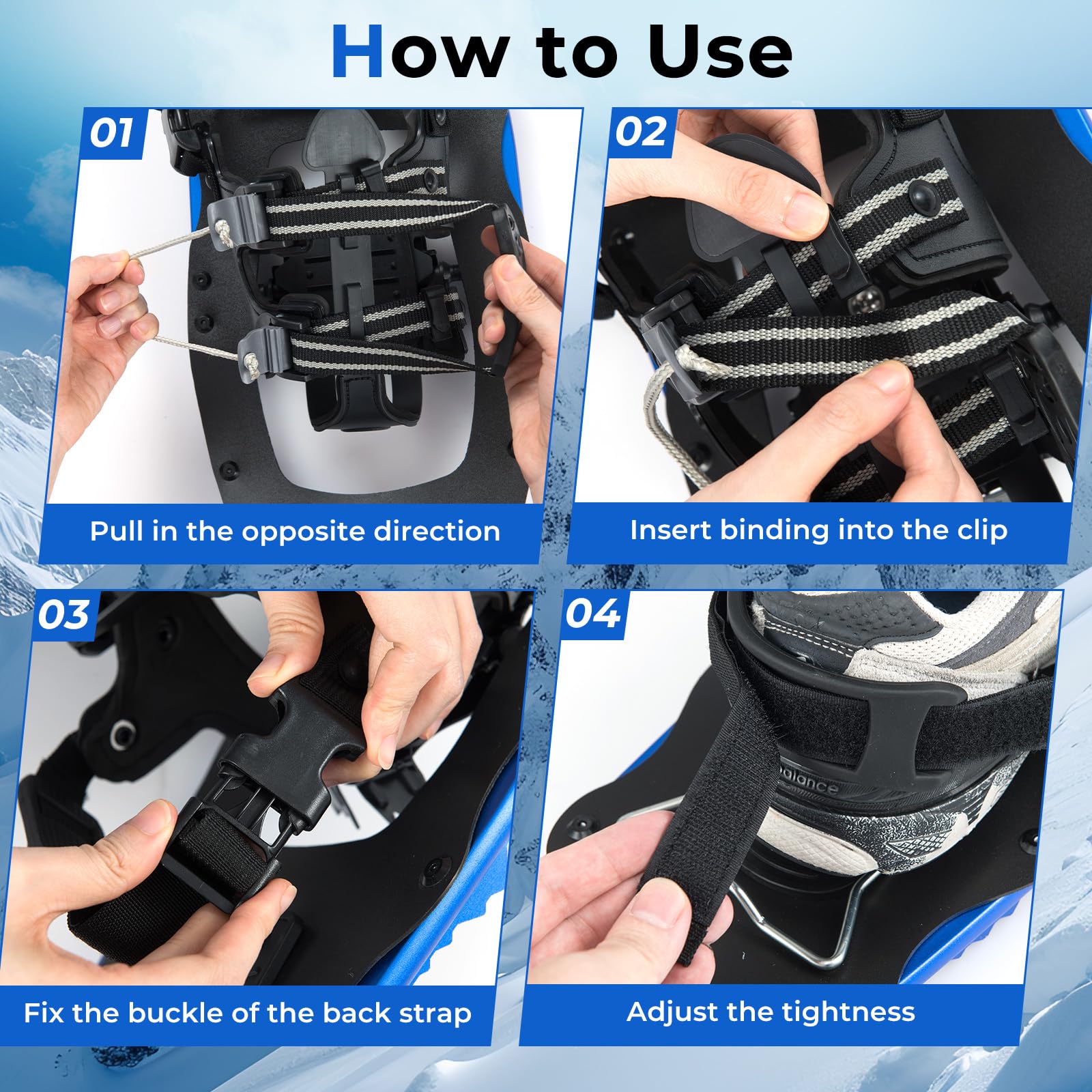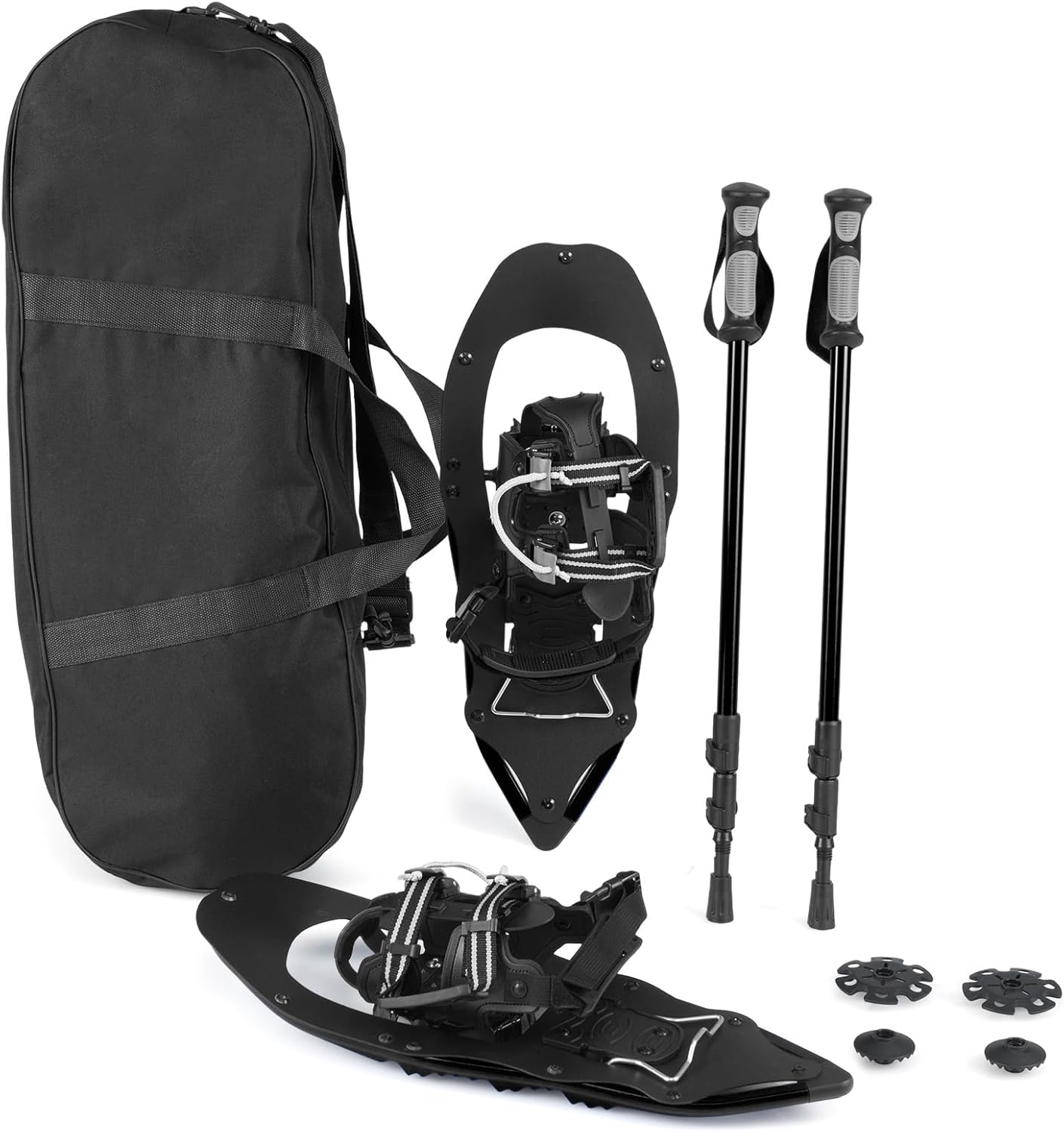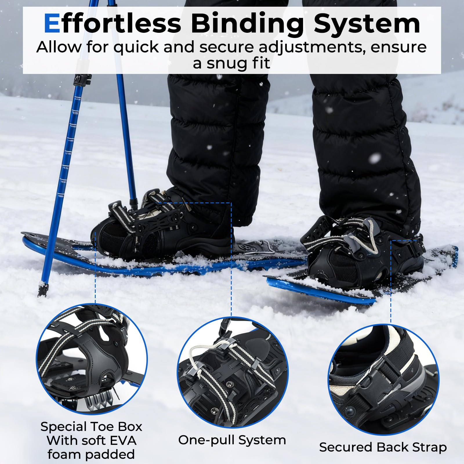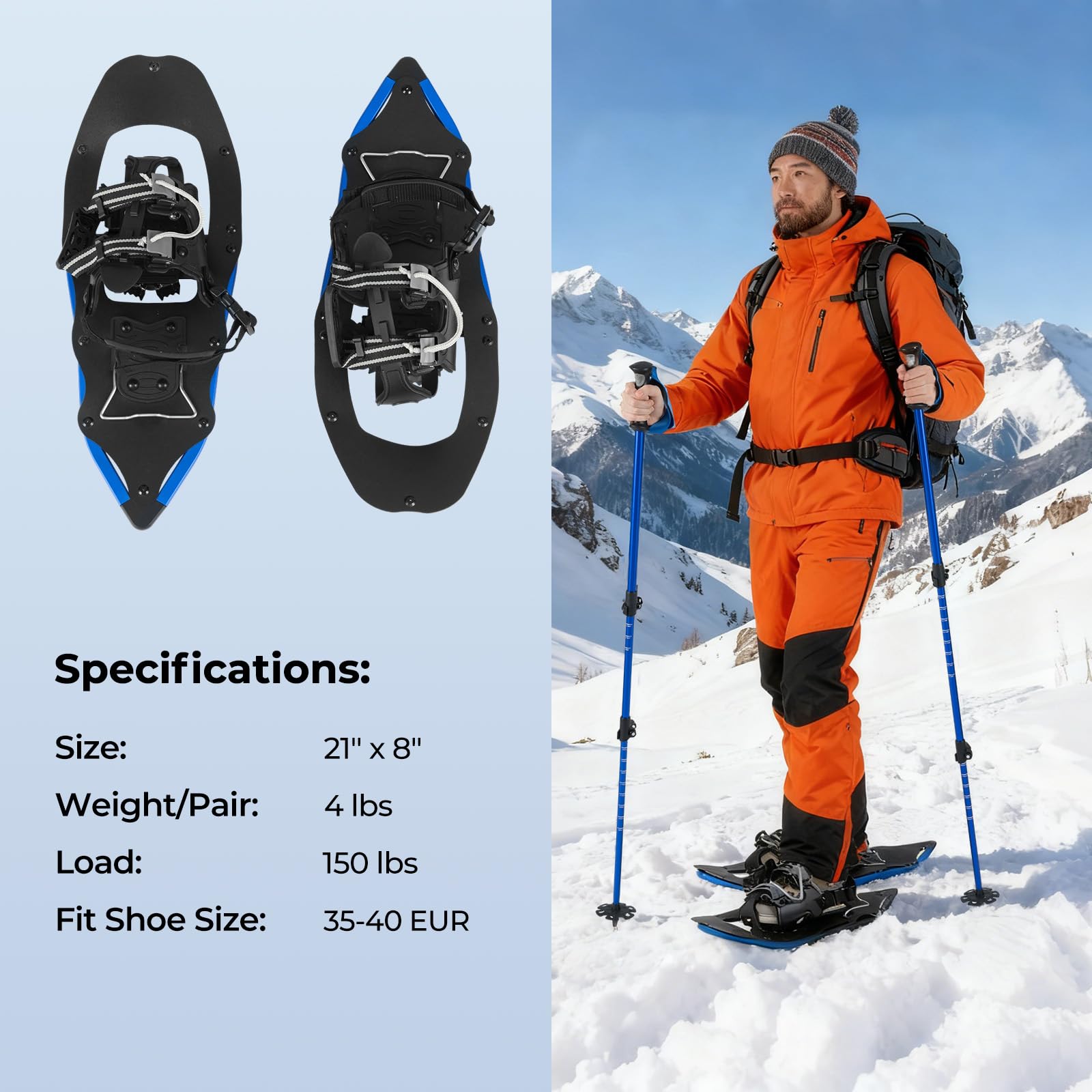 Our 21" snowshoes and trekking poles set is designed for ultimate winter exploration. The ready-to-go adventure pack features ultra-light snow shoes built from reliable PE decking and a rustproof aluminum frame, ensuring strength and comfort while weighing just 4 lbs lbs per pair. Rapid one-second bindings with an EVA-padded toe box and glove-friendly adjustments ensure a custom fit, perfect for EUR sizes 35-40. Advanced toe and heel crampons, a heel lift, and a flexible pivot bar deliver reliable grip and ease of movement across icy slopes, embodying the agile spirit. Adjustable anti-shock poles, ergonomic grips, and a rugged zippered carry bag provide everything needed for seamless adventures in the snow.