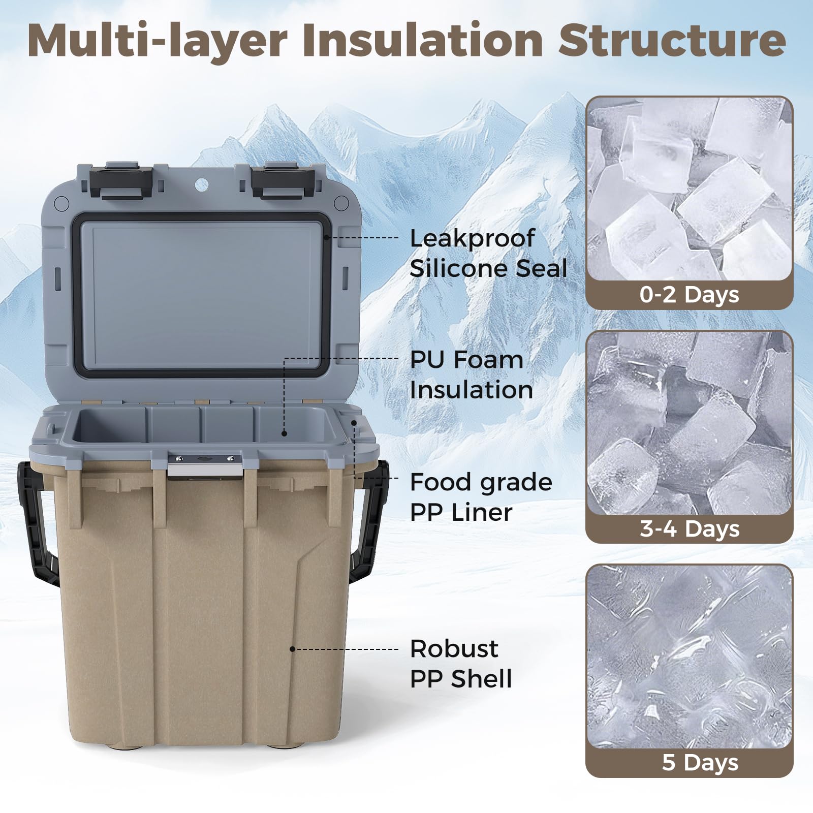This cooler chest boasts superior ice retention, keeping ice intact for up to 5 days and preserving warmth for 2-3 days, making it ideal for outdoor adventures. Its lightweight design at just 14 lbs features an ergonomic non-slip swing-up handle and secure latches with a padlock hole, enhancing portability and security. The generous 21 QT capacity comfortably holds 16 cans, perfect for any gathering. Built with PP shell using advanced injection molded cooler technology, this cooler offers multi-layer insulation structure to ensure lasting durability and excellent thermal performance.