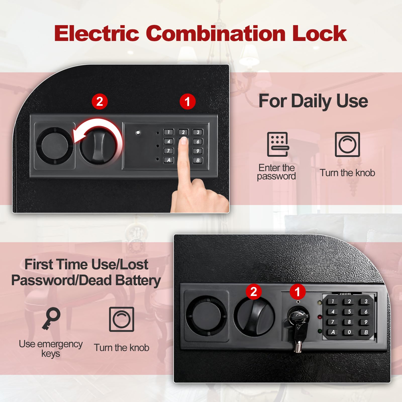 - 2 Ways to Open: As it is equipped with an electric combination lock, there are 2 ways to open the wall gun safe. For daily use, you can enter the password and turn the knob; and for first-time use/lost password/dead battery, you can use emergency keys.