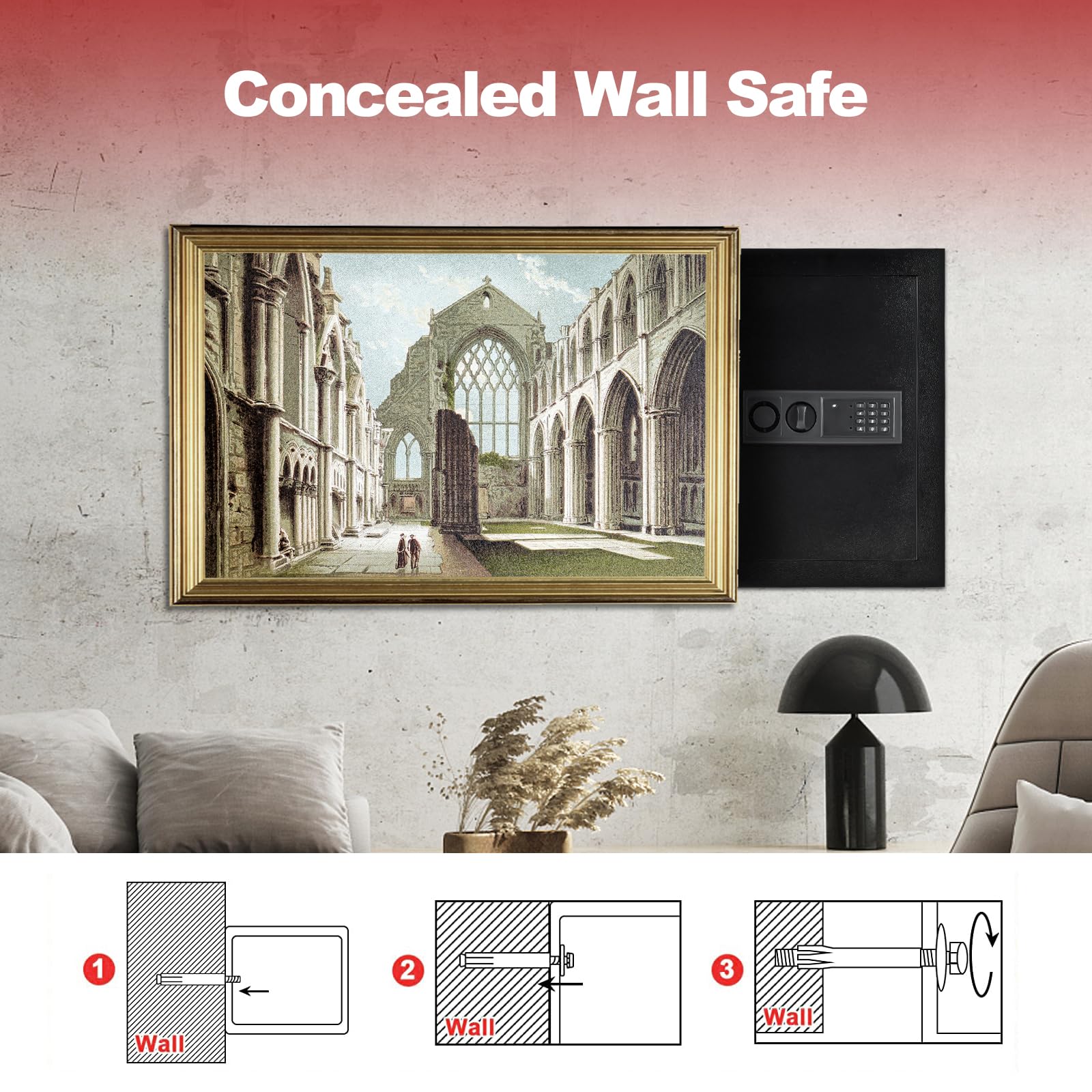 - User-friendly Design: An invalid password will make the LED light flash and the electric safe beep, while 3 incorrect attempts of password will breeze the electric keypad for 20 seconds. Besides, the concealed wall safe comes with a protective liner pad to protect your valuables.