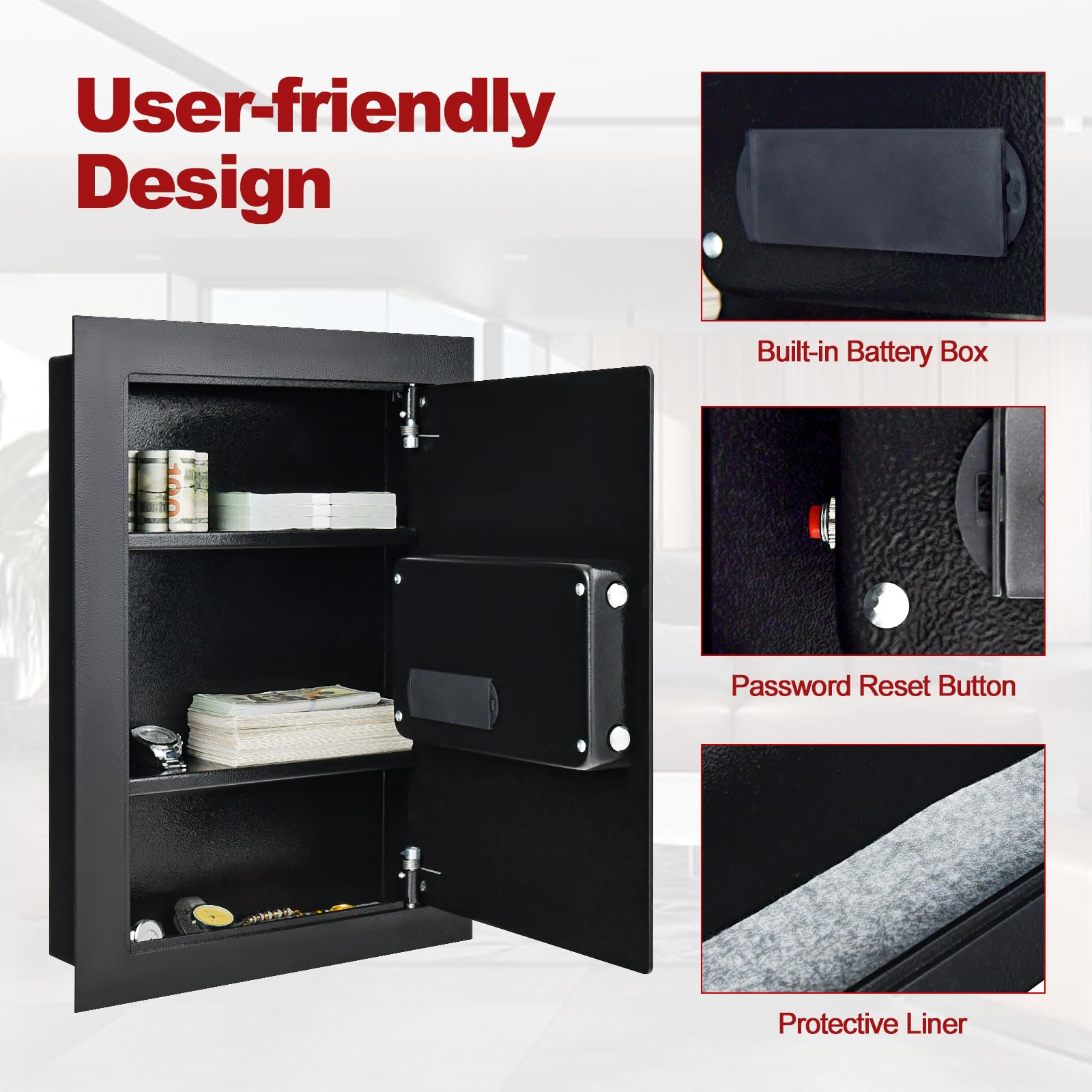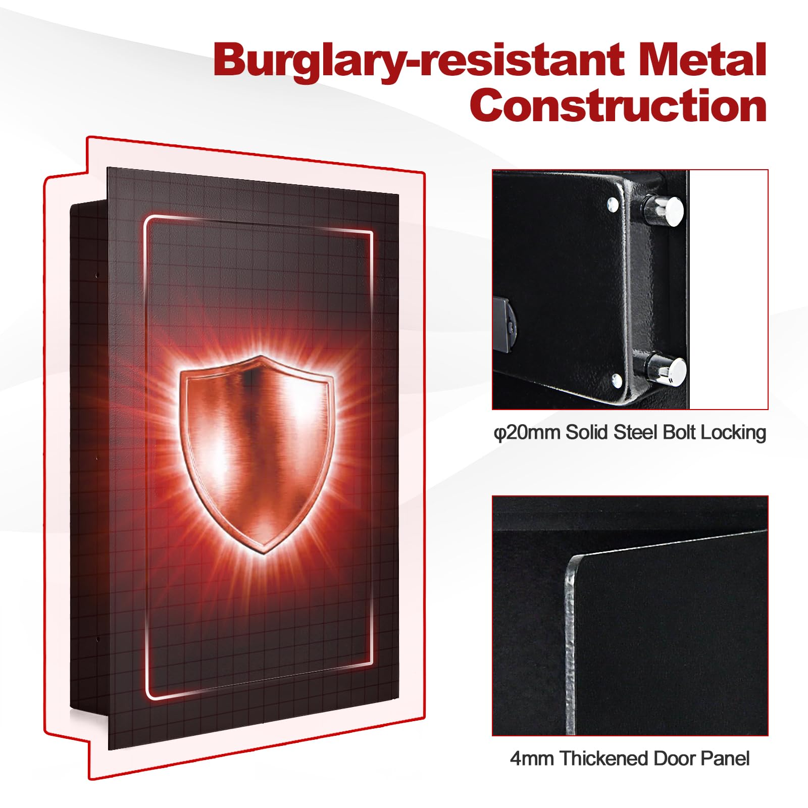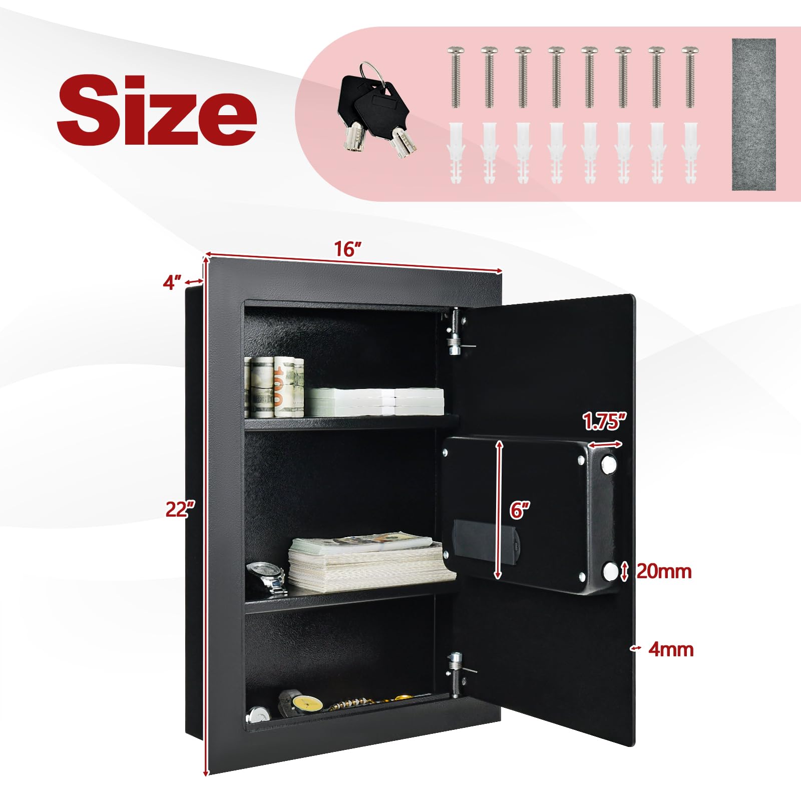 Secure your valuables in our wall mount safe, the ultimate solution for safeguarding your prized possessions! Its solid steel bolt locking system, reinforced steel panels, and heavy-duty metal frame assure you of maximum protection of your valuables. And the safe can be easily hidden from your sight as it fits between the studs. Inside the safe box, there are 3 shelves for you to keep the valuables well organized. If you need to store an important document, you can detach the shelves to free up space. What's more, the wall safe comes with an electric combination lock and built-in battery box for easy operation by entering the password or by using the emergency keys. So don't worry about losing your password or running out of battery!