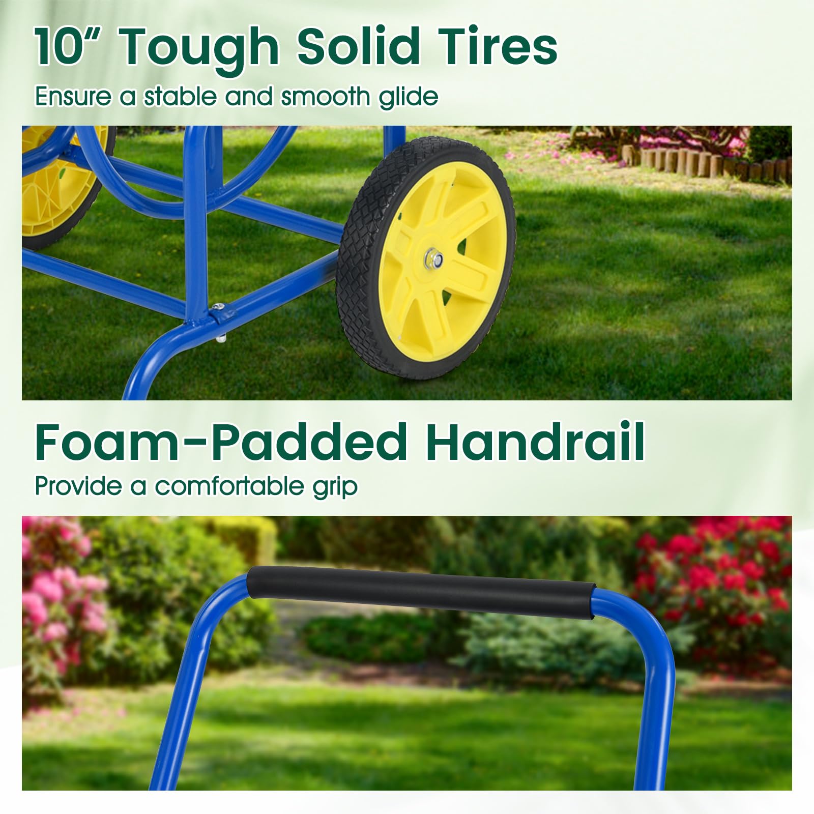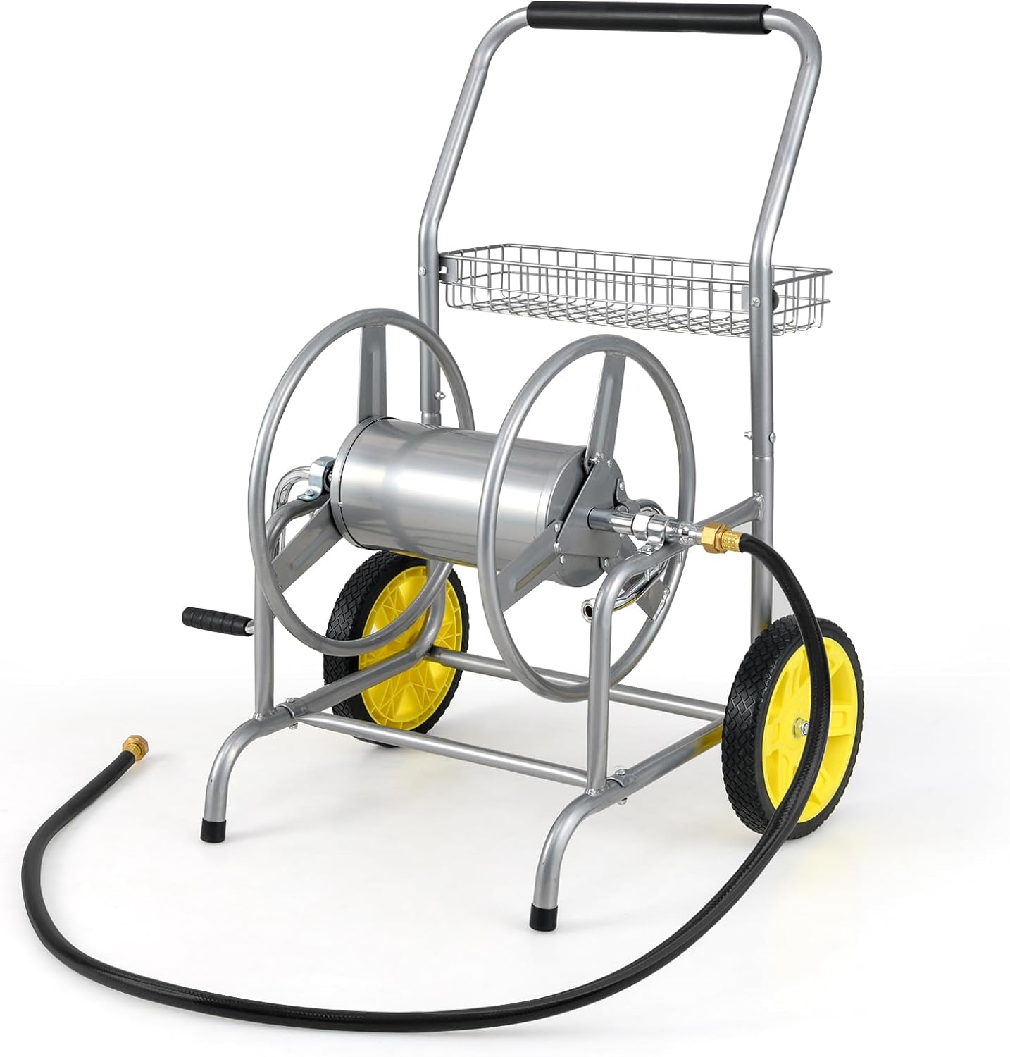 Designed to handle the demands of any busy garden, our garden hose reel cart effortlessly accommodates up to 230 ft of 5/8" or 300 ft of 1/2" hose/70 m of 20 mm or 90 m of 15 mm hose (hose not included) ensuring you have enough reach to cover large areas without constant relocations. The large solid tires offer exceptional ease of movement across various terrains, while the foam-padded handrail provides added comfort during use. Engineered for durability, the heavy-duty metal construction, along with brass and galvanized fixtures, ensures a long-lasting and leak-proof performance that stands the test of time. Additionally, it allows for quick roll up with a convenient crank, paired with a storage basket to keep essentials within reach, enhancing your efficiency as you tend to your garden chores. Whether you're watering plants, irrigating lawn, washing cars, or bathing pets, this reel cart is an ideal helper, making your outdoor tasks a breeze.