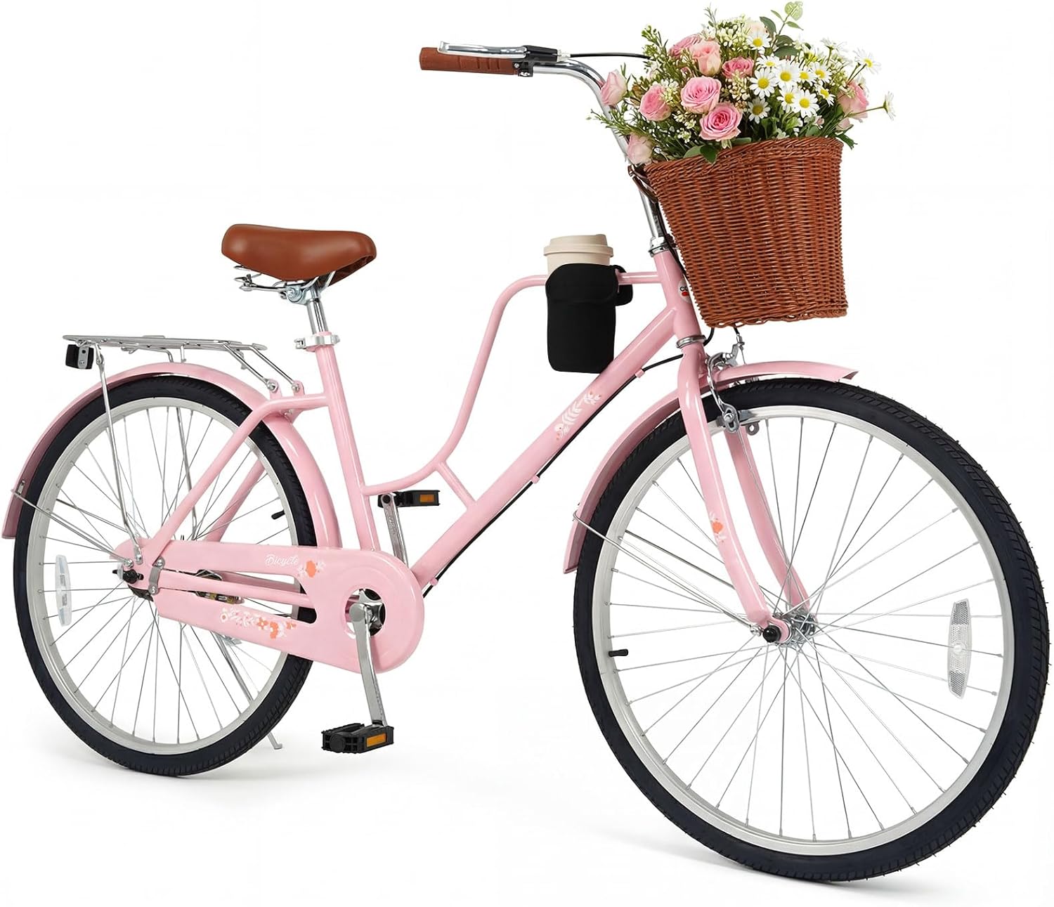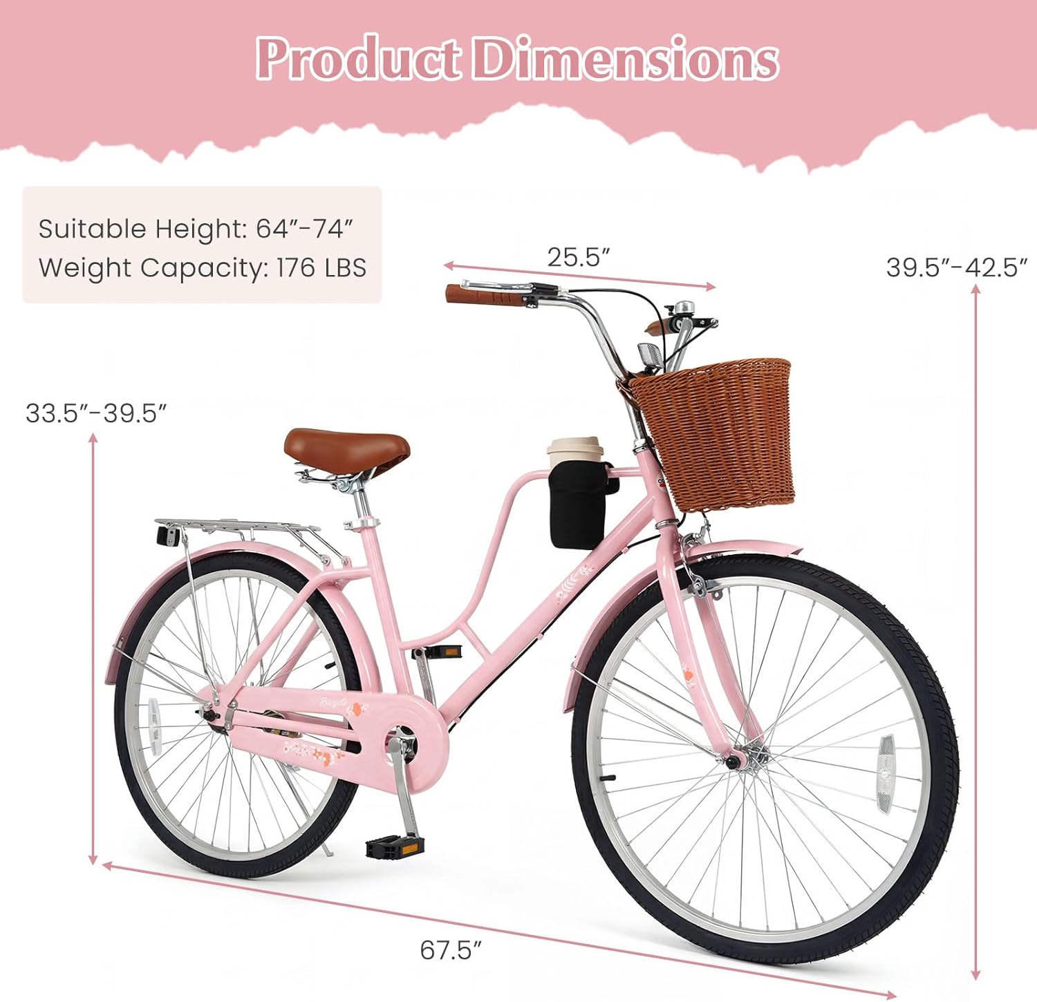 The adjustable saddle fits a wide range of heights, while plush foam and springs keep every ride smooth and comfortable. Everything you need stays close at hand, thanks to the chic front basket and sturdy rear rack. Tough, puncture-proof tires handle city streets, parks, and even beach paths with confidence, supported by a reliable dual brake system for smooth stops. With a low frame for easy mounting and dismounting, plus ergonomic grips to support your posture, this bike combines convenience, comfort, and style.