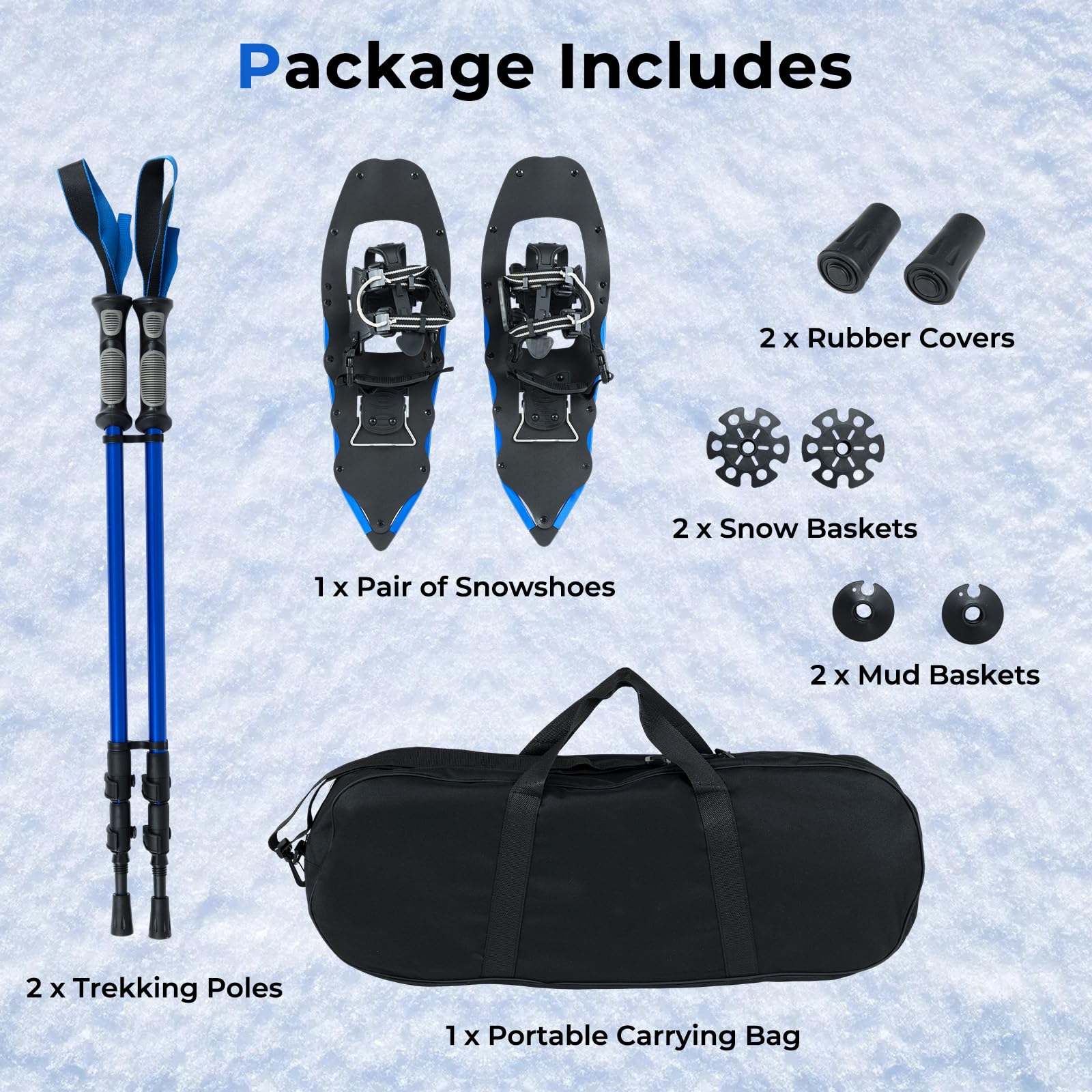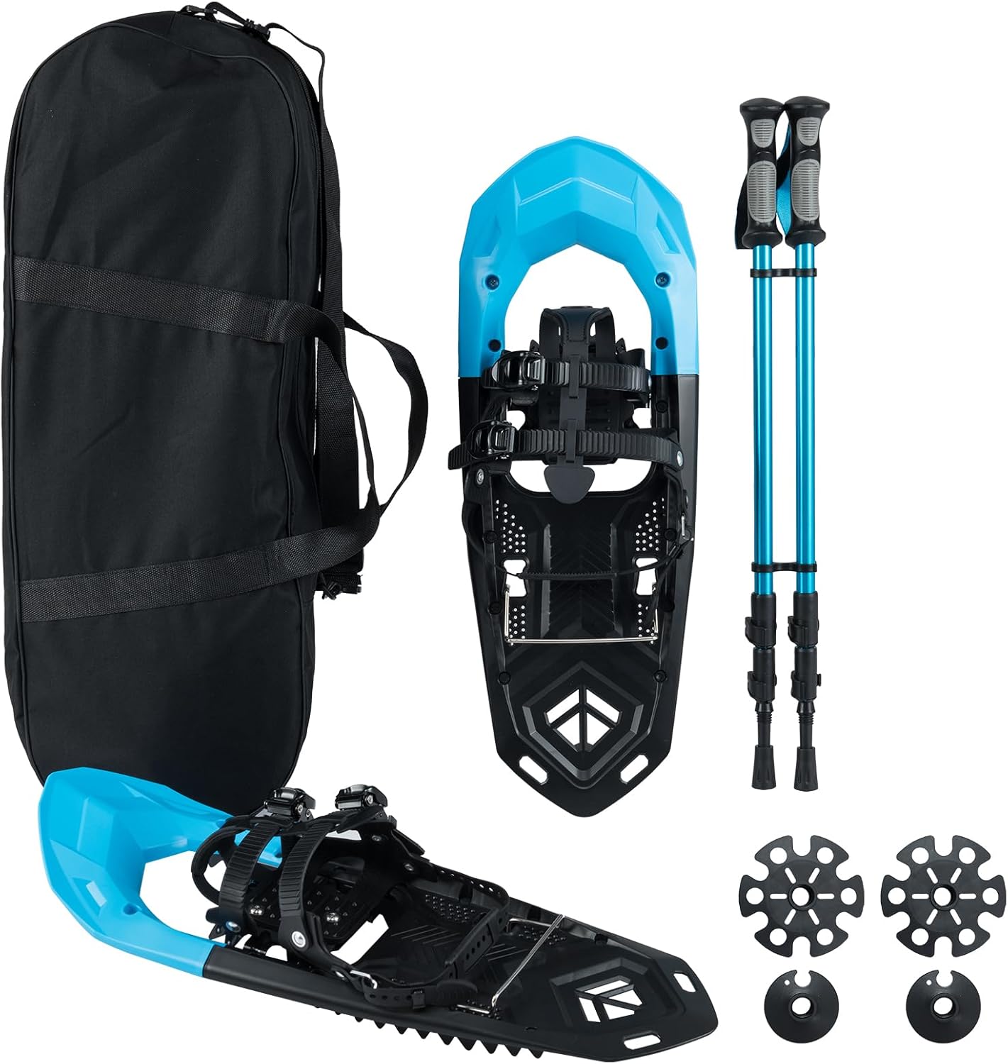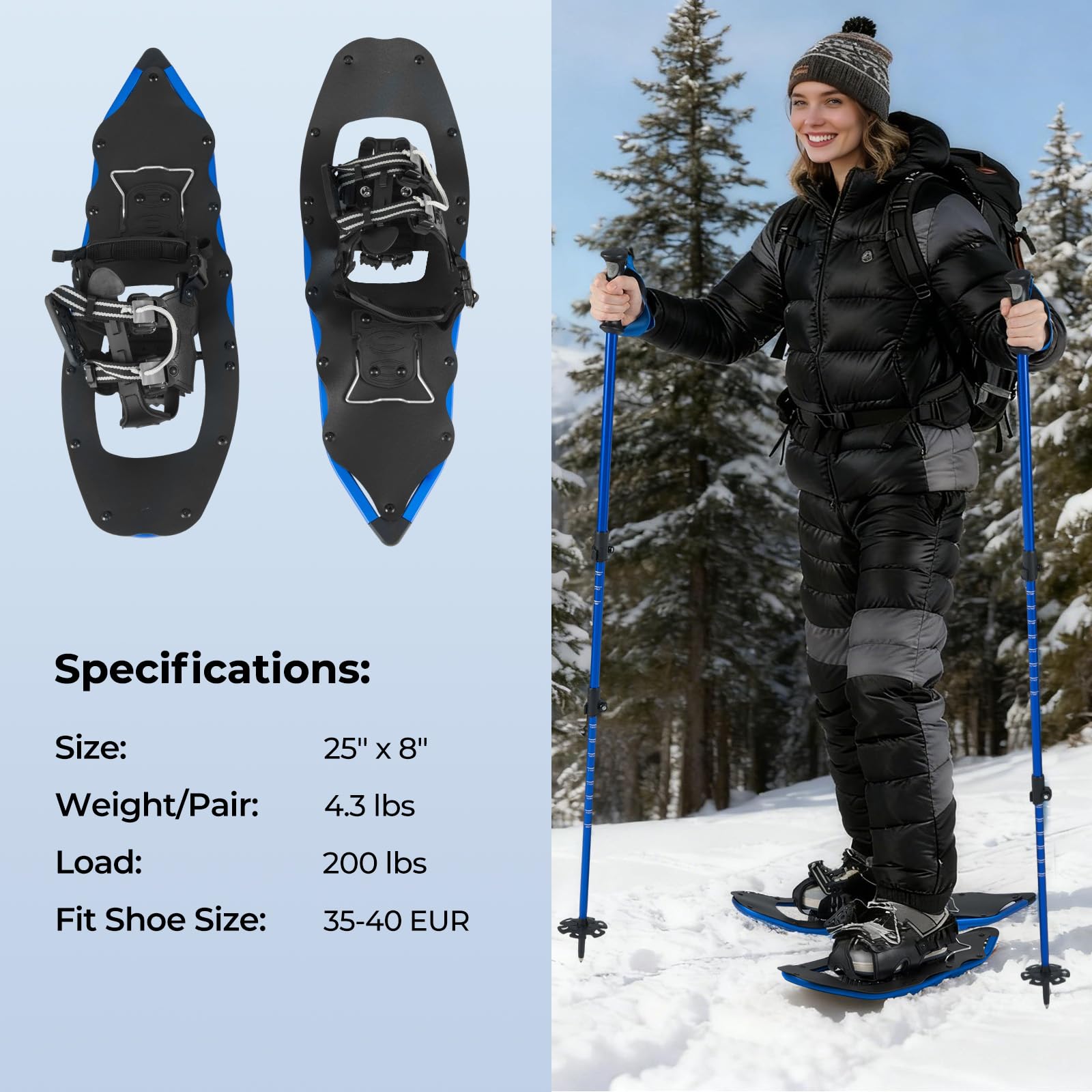 Our 25" snowshoes and trekking poles set is designed for ultimate winter exploration. The ready-to-go adventure pack features ultra-light snow shoes built from reliable PE decking and a rustproof aluminum frame, ensuring strength and comfort while weighing just 4.3 lbs per pair. Rapid one-second bindings with an EVA-padded toe box and glove-friendly adjustments ensure a custom fit, perfect for EUR sizes 35-45. Advanced toe and heel crampons, a heel lift, and a flexible pivot bar deliver reliable grip and ease of movement across icy slopes, embodying the agile spirit. Adjustable anti-shock poles, ergonomic grips, and a rugged zippered carry bag provide everything needed for seamless adventures in the snow.