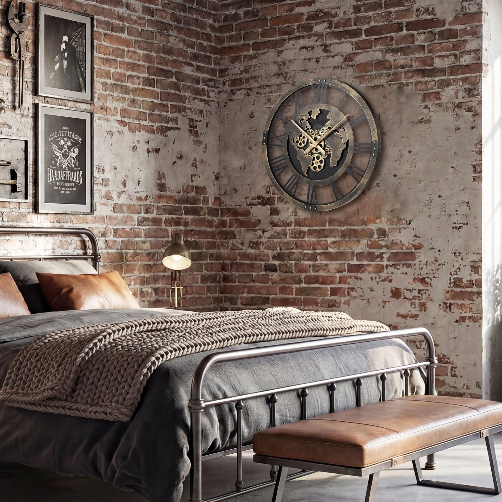 Enhance your space with this elegant gear clock with world map, beautifully framed in sleek metal to bring a sense of balance and renewal to any room. Decorate beautifully without taking up room, its compact design maximizes wall space while serving as a striking decorative centerpiece. Powered by a high-quality quartz mechanism, the non-ticking wall clock operates smoothly, making it an excellent choice for quiet zones like bedrooms, libraries, or meditation areas. With a generous 27" diameter and slender hands, this clock ensures effortless time-telling from across the room. Installation is secure with the included wall mounting kit. Powered by 3 AA batteries (not included), it's both functional and stylish. Perfect for gifting, this artistic clock is a thoughtful present for birthdays, housewarmings, weddings, or holiday occasions, blending practicality with meaningful design.