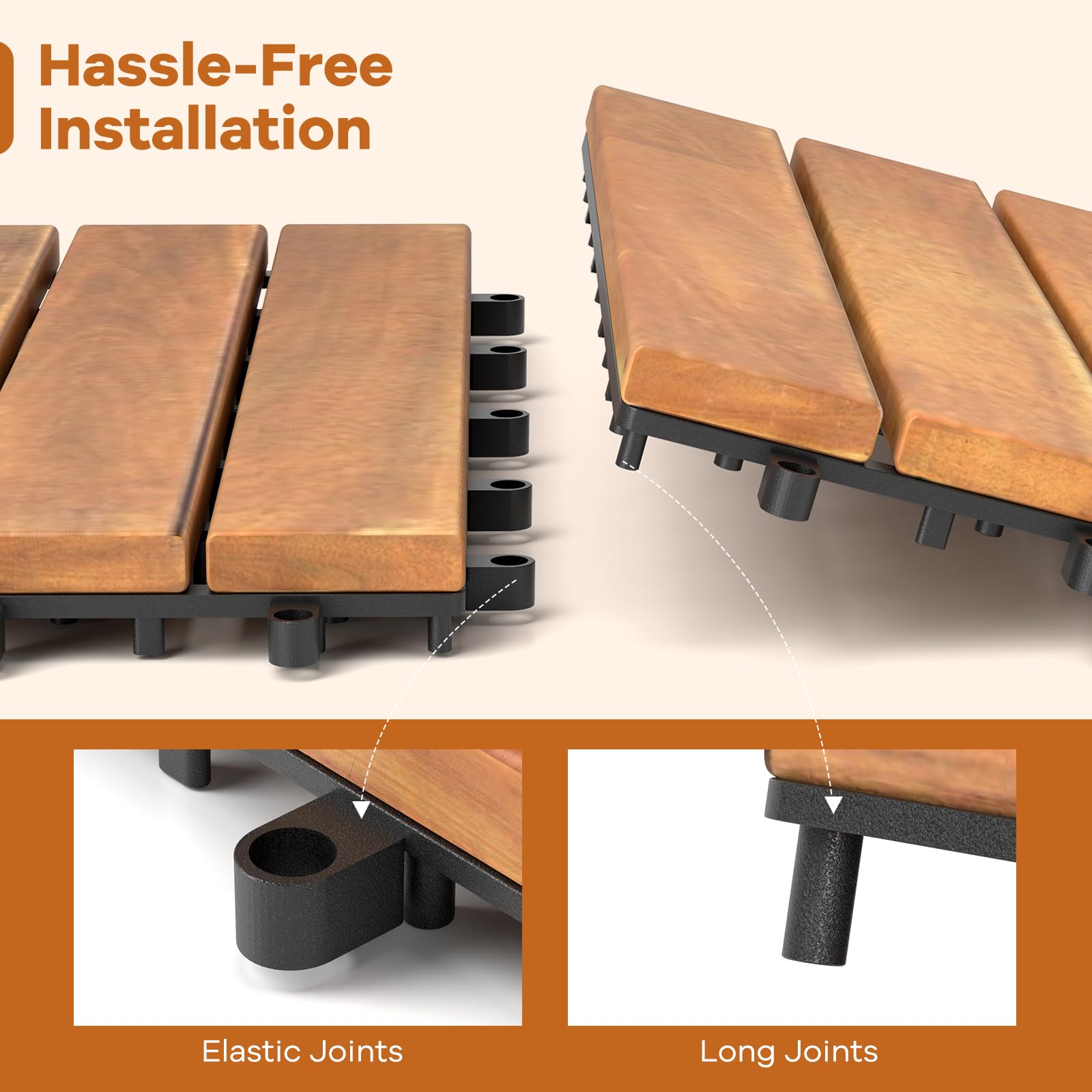 Crafted from premium acacia wood, these flooring tiles add a touch of unique charm with their natural textures and elegant vibes. The distinctive interlocking design allows for quick installation and removal without the need for tools. Plus, the easy-to-cut feature enables DIY creativity, making them adaptable to any space, regardless of shape or size. Each patio floor tile is equipped with reinforced plastic base at the bottom to protect the floor, while the flat design ensures a level surface. This easy-to-clean acacia wood patio tiles are perfect for both indoor and outdoor spaces, making it the ideal decorations.