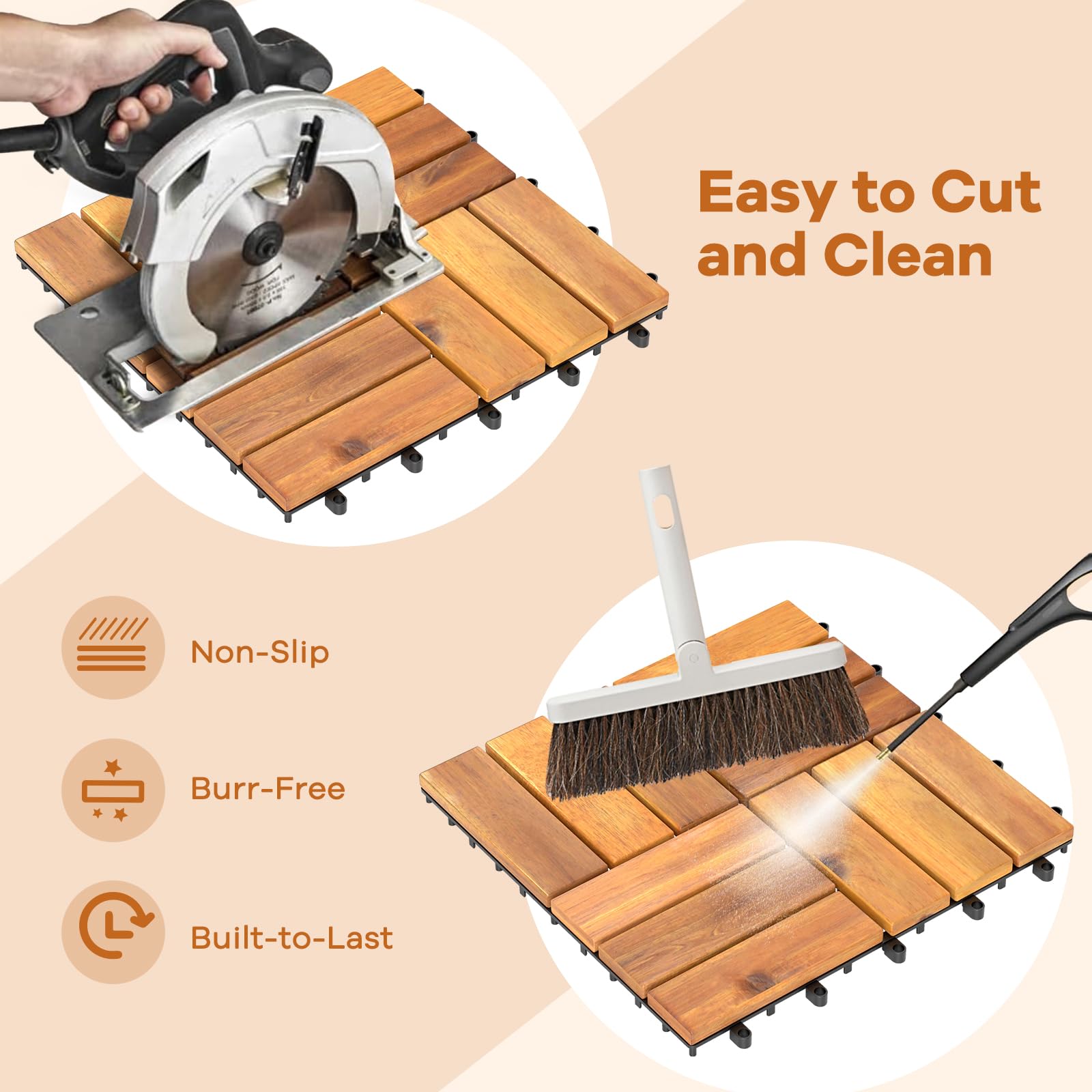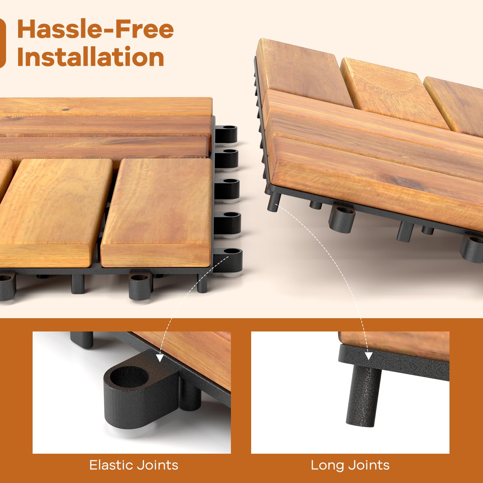 Crafted from premium acacia wood, these flooring tiles add a touch of unique charm with their natural textures and elegant vibes. The distinctive interlocking design allows for quick installation and removal without the need for tools. Plus, the easy-to-cut feature enables DIY creativity, making them adaptable to any space, regardless of shape or size. Each patio floor tile is equipped with reinforced plastic base at the bottom to protect the floor, while the flat design ensures a level surface. This easy-to-clean acacia wood patio tiles are perfect for both indoor and outdoor spaces, making it the ideal decorations.