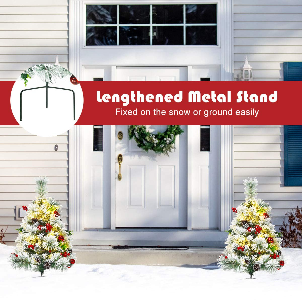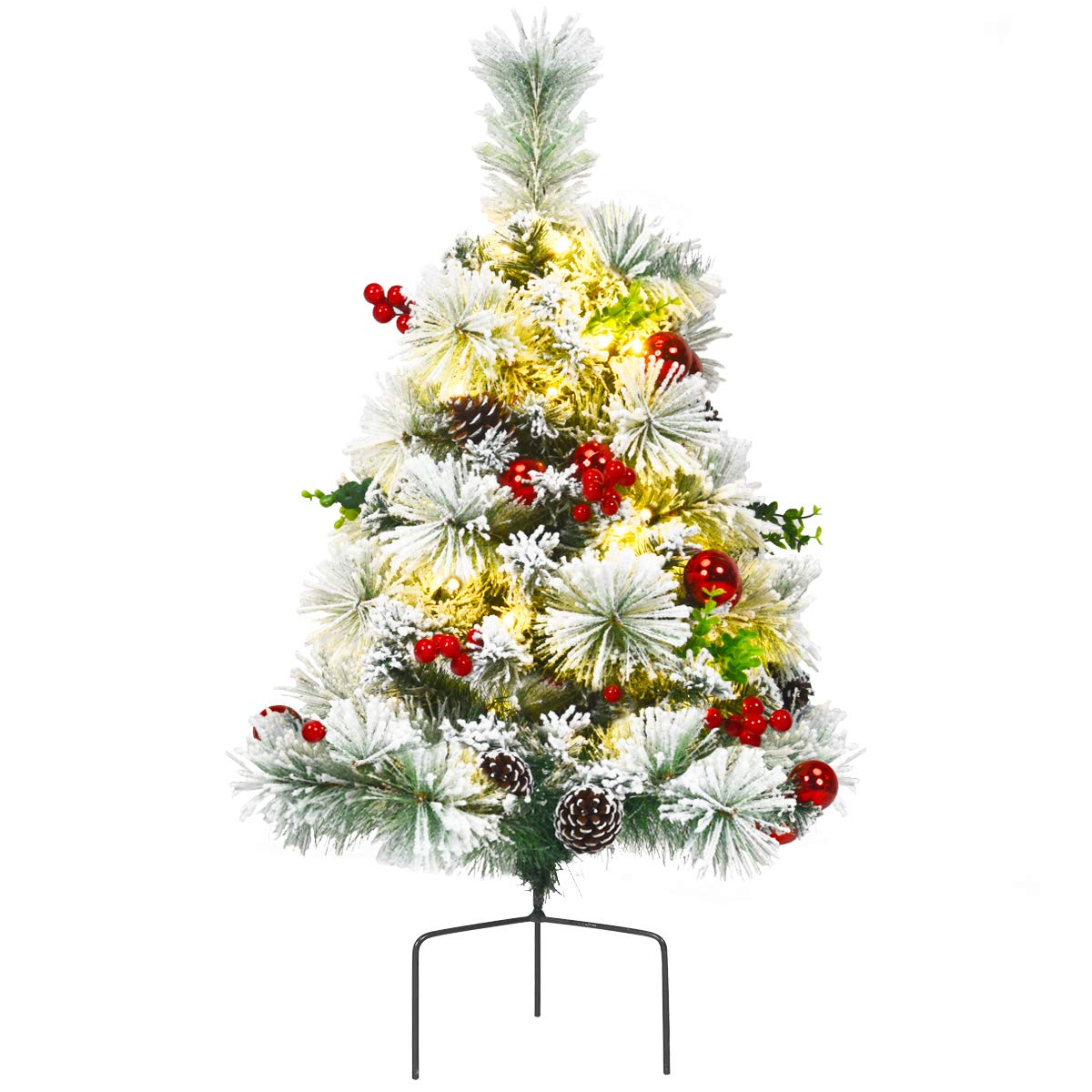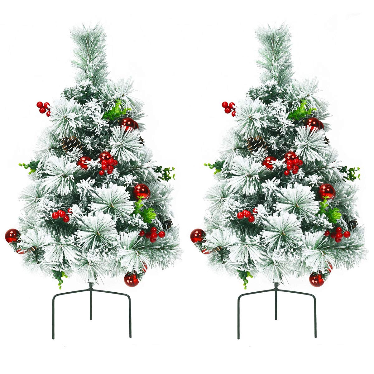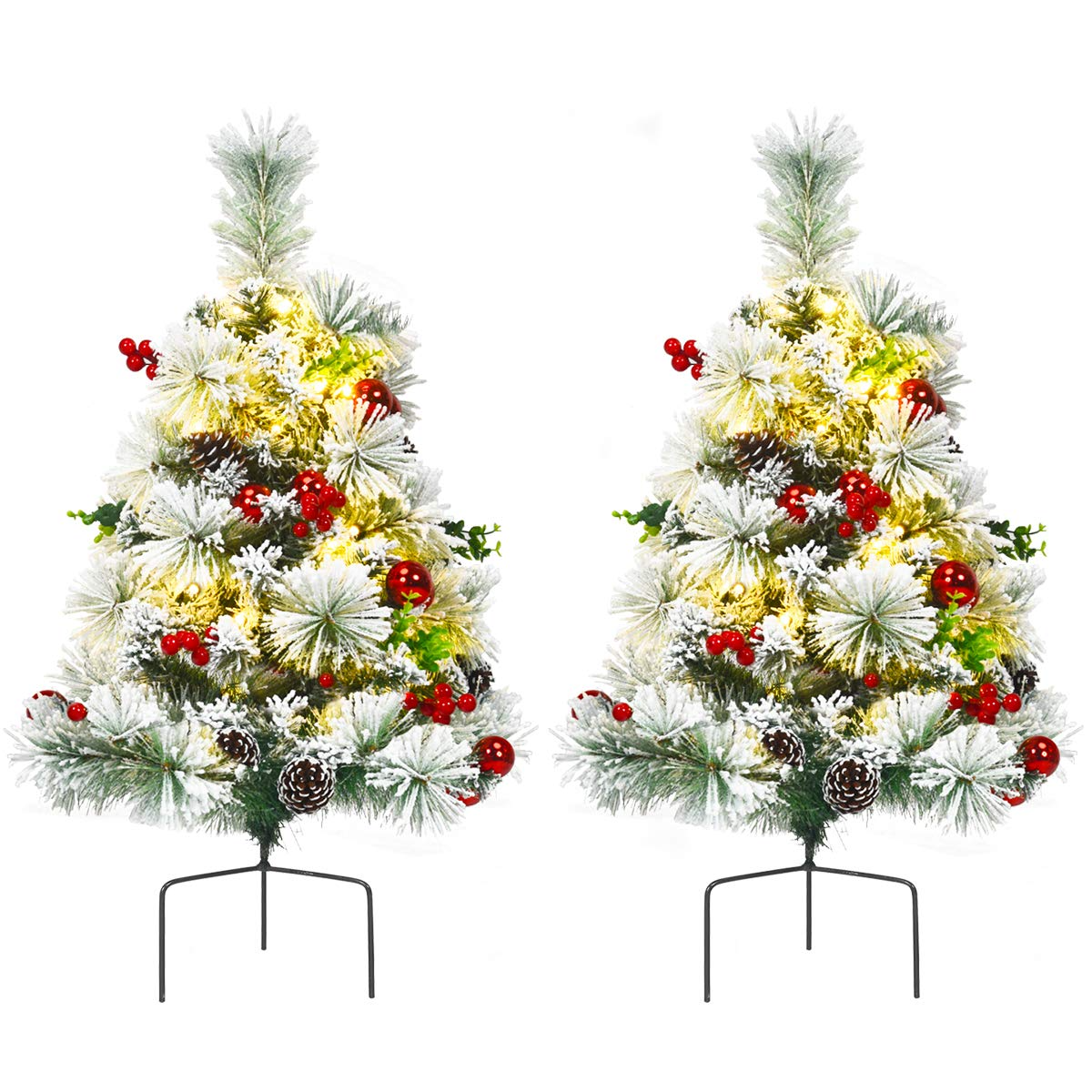 Goplus 2FT Pathway Christmas Trees Set of 2, Pre-Lit Snow Flocked Xmas Trees with 30 Warm White LED Lights