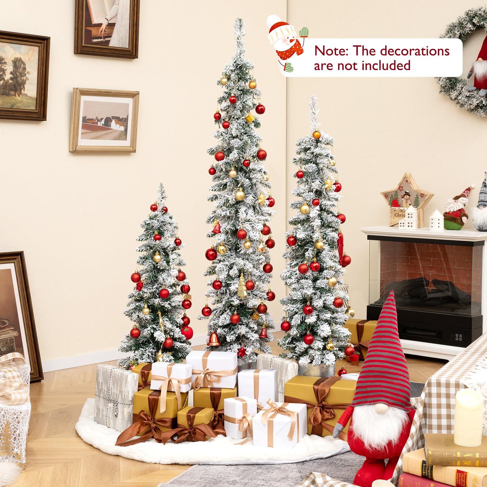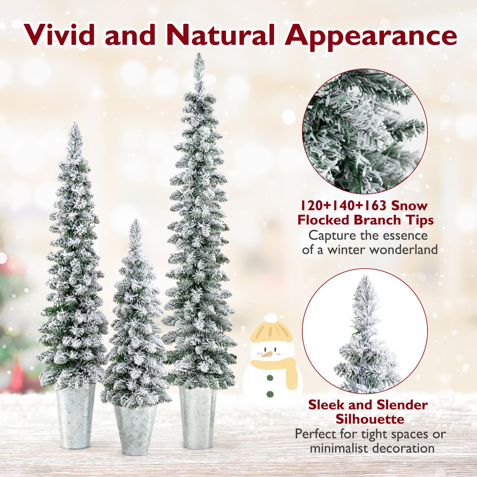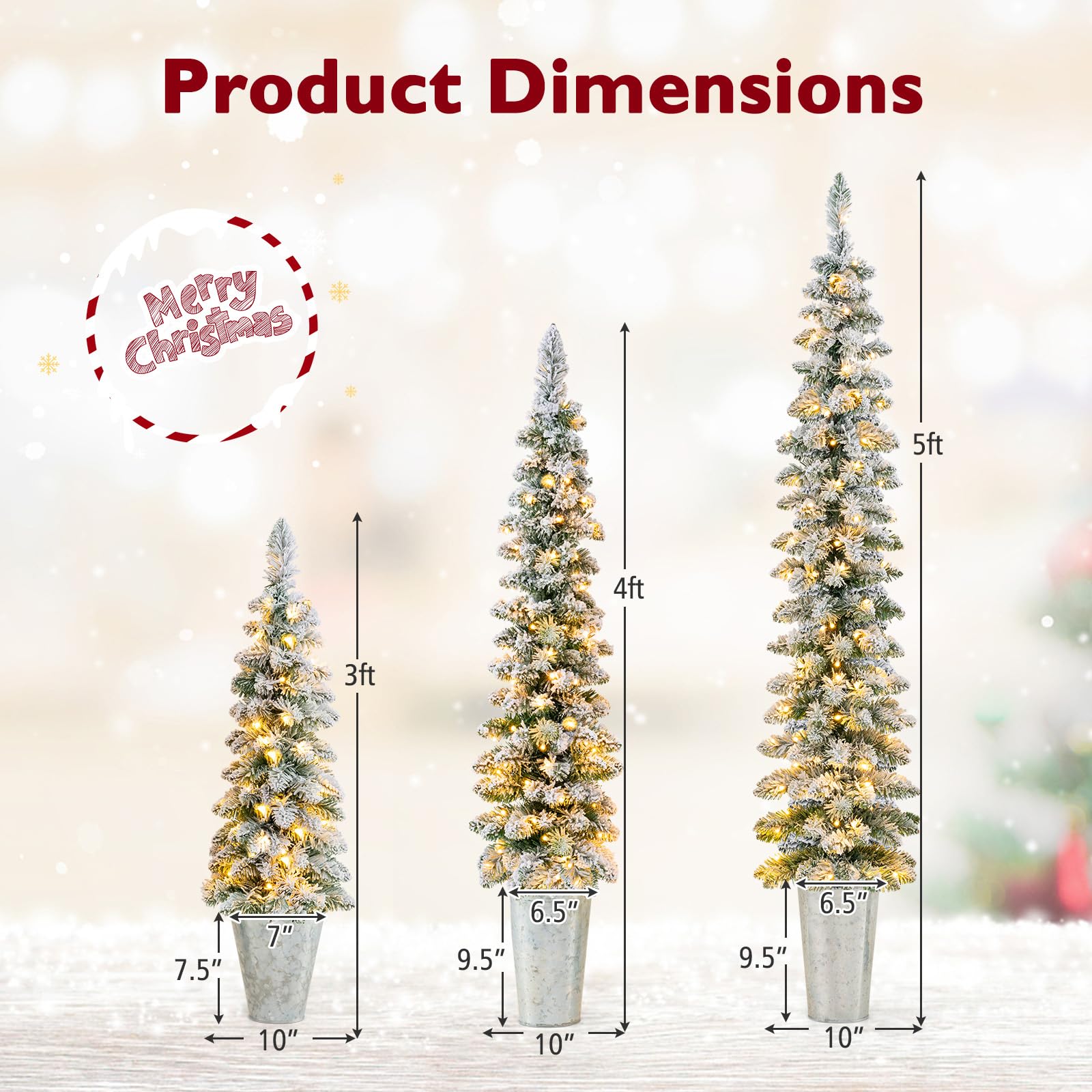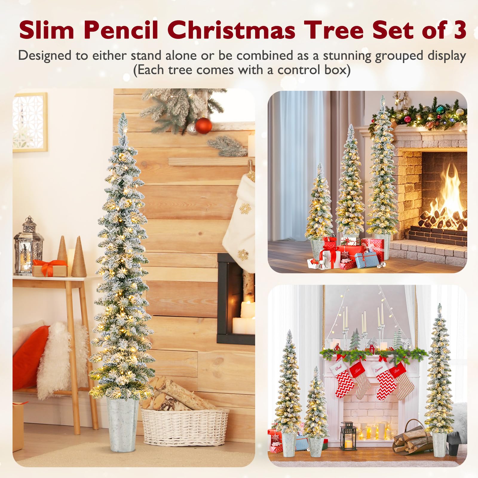 Our pre-lit holiday tree set includes 3 Christmas trees in heights of 3 ft, 4 ft, and 5 ft, each with its own control box, which can be displayed together for a layered look or stand alone to suit different decorating needs. These exquisite trees feature snow-flocked branch tips and a sleek pencil tree design, combining a traditional winter aesthetic with modern sophistication. Moreover, they could illuminate your space with the pre-strung warm white LED lights, complete with 8 lighting modes, offer a customizable glow to suit any ambiance. For added convenience, each tree is powered by a control box (the batteries are not included) and there is a timer function, allowing for flexibility in placement without the hassle of cords. Crafted from flame-retardant and odorless PVC leaves and supported by sturdy cement bases, the Xmas trees ensure safety and reliability for years to come. Whether adorning your living room, brightening up office spaces, or serving as charming holiday accents at events, these 3 PCS lighted Xmas trees can be a perfect choice!