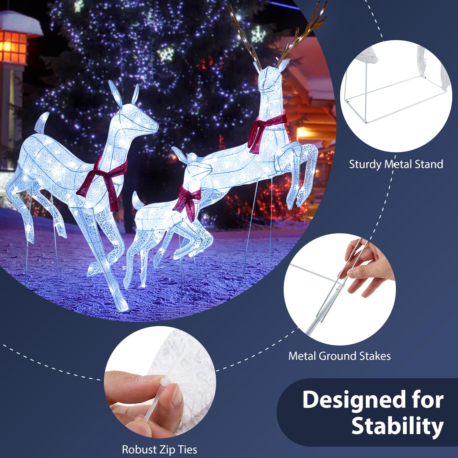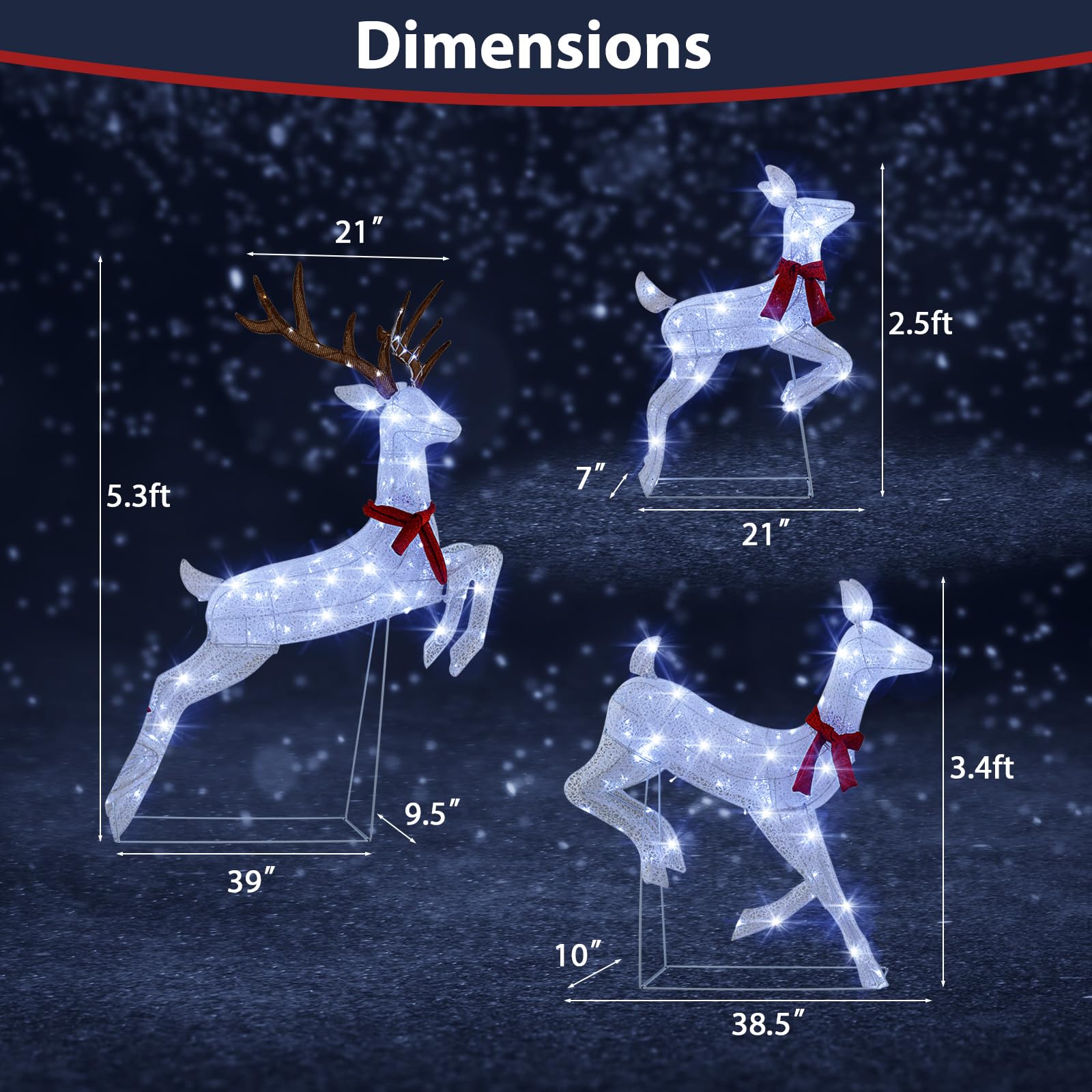 - Flexible Arrangement Options: Coming with a buck, doe, and fawn, this pre-lit outdoor deer set offers versatile layout possibilities to fit your space and style. The deer can be grouped together for a family scene or arranged separately across your lawn.