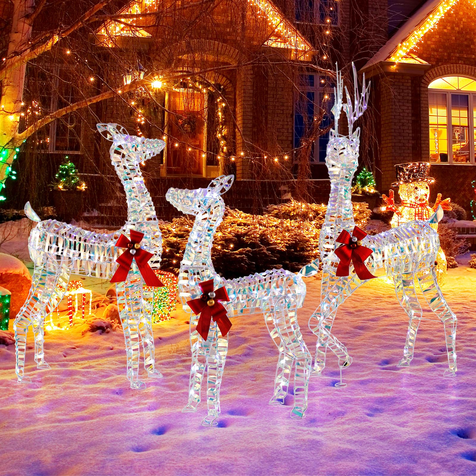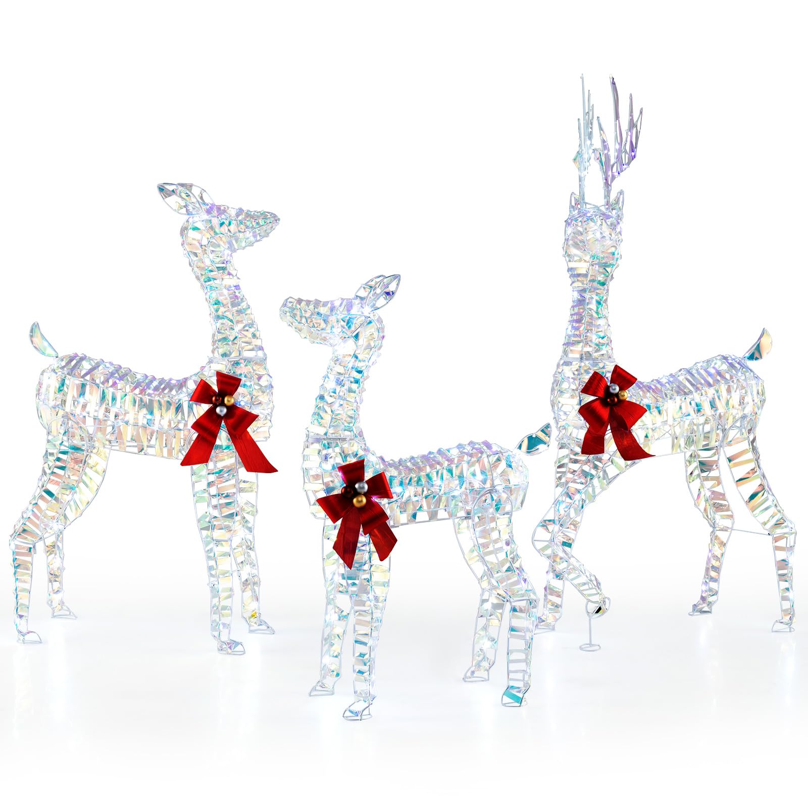 - Sophisticated Charm: Adorned with exquisite red bows, the 3D pre-lit deer set brings a touch of elegance to your Christmas decorations. Ideal for both indoor and outdoor settings, these reindeer add a festive flair to your garden, yard, or living room.
