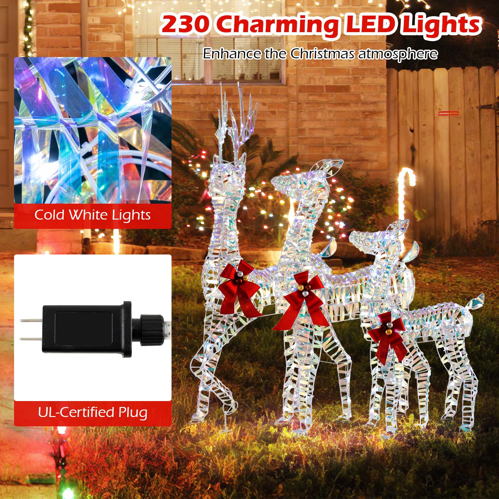 - Brilliant Illumination: Featuring 230 charming LED lights, this 3-piece reindeer set is a show-stopping display that captures the joyful essence of Christmas. The cold white lights ensure optimal visibility and add a radiant glow to your festive nights.