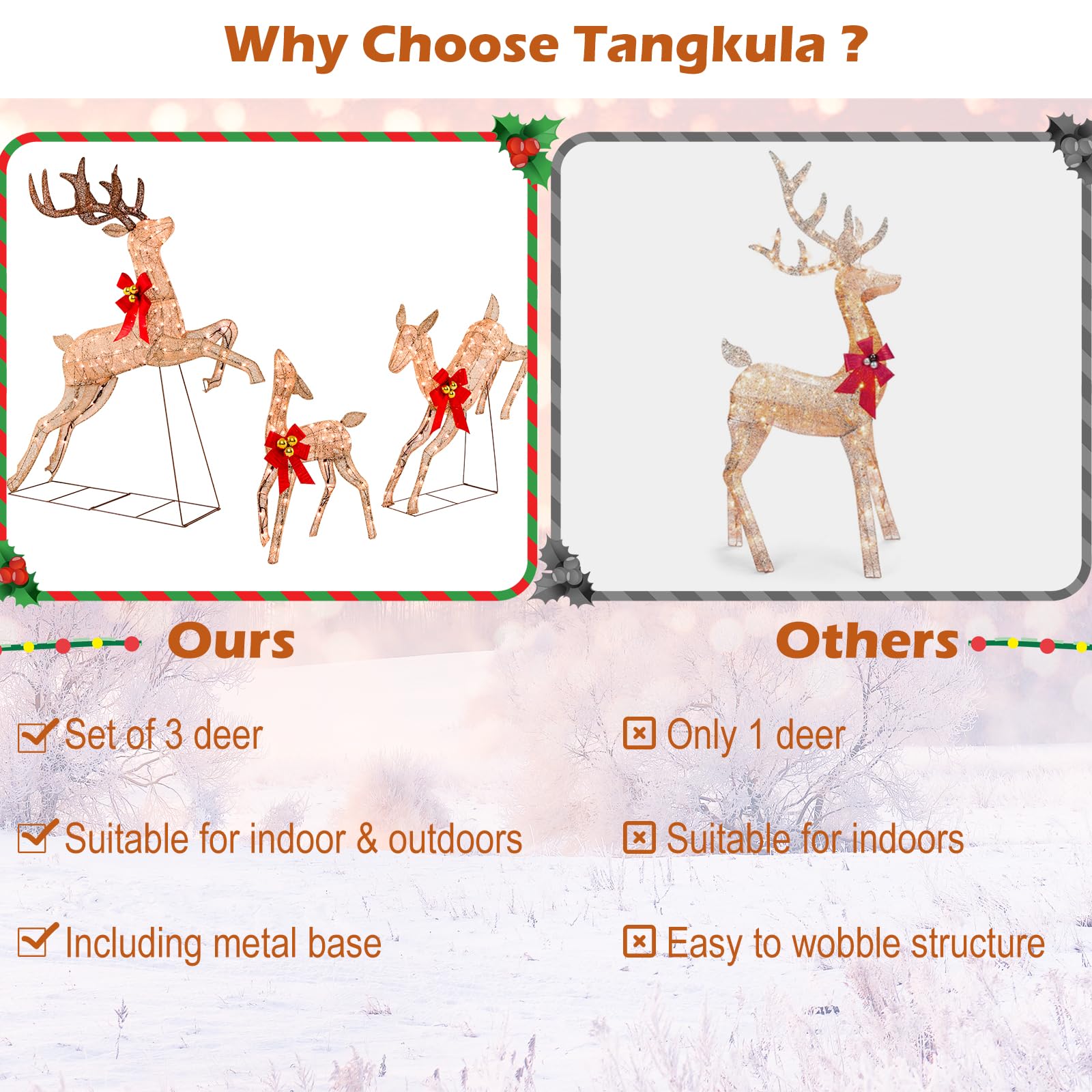 Featuring 255 cold white lights, the Xmas pre-lit deer set transforms your holiday setting into a captivating and mystical environment. The 3 reindeers display dynamic and lively postures, inviting the spirit of Christmas into your home. Cloaked in shimmering fabric, these reindeer glisten brilliantly under any lighting, creating a standout Christmas ambiance. Crafted from waterproof material, the holiday yard decoration is ideal for both indoor and outdoor. It rests on a sturdy metal stand and is anchored with 12 ground stakes to enhance stability and prevent tipping. The set also includes additional accessories such as replacement bulbs and fuses, simplifying maintenance and setup.